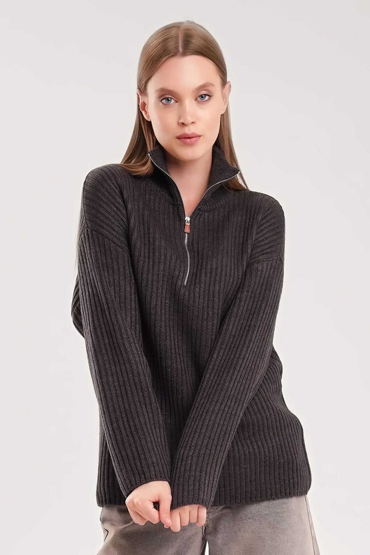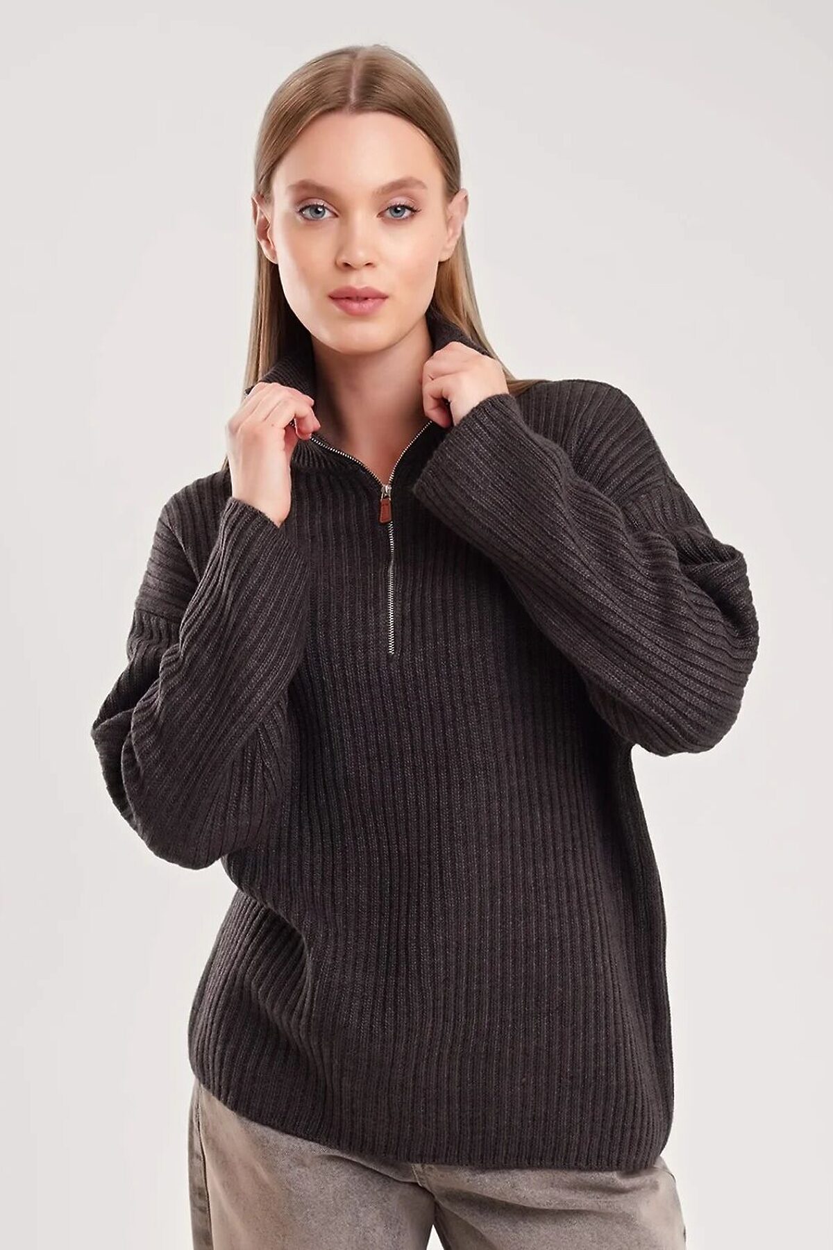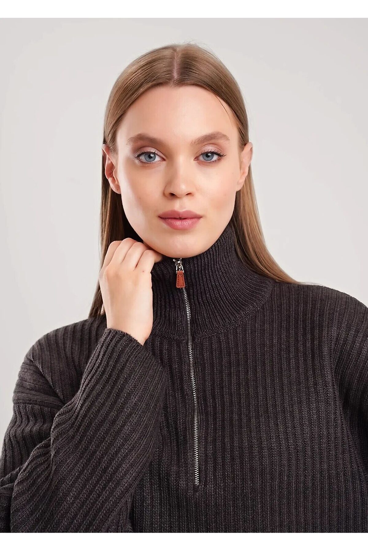 Вязаный джемпер умеренного объема из акриловой пряжи с добавлением шерсти, переплетения полуфанг. Спущенный длинный рукав. По горловине стойка с застежкой на молнию.