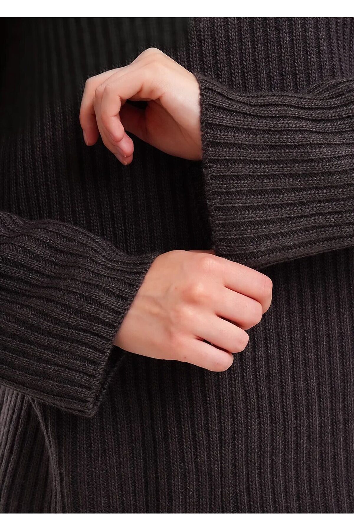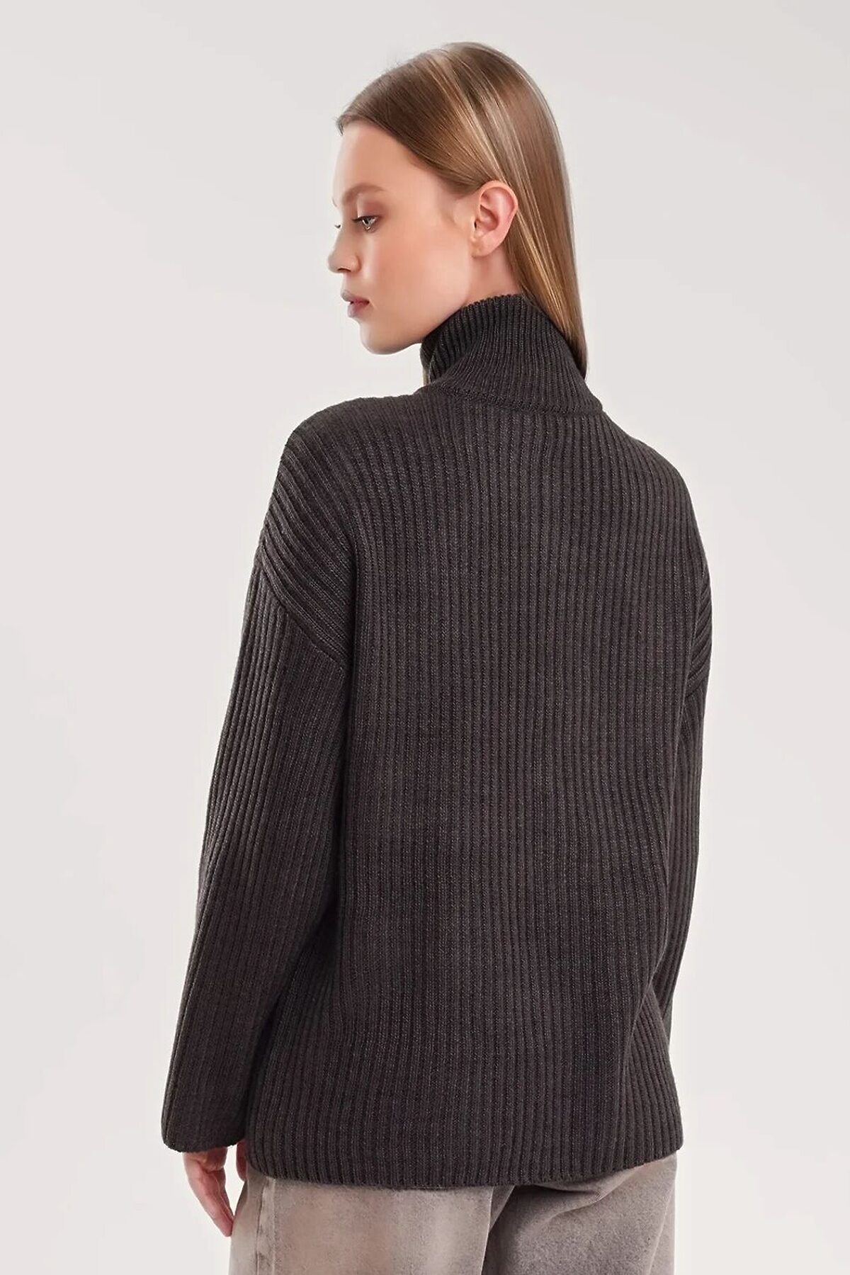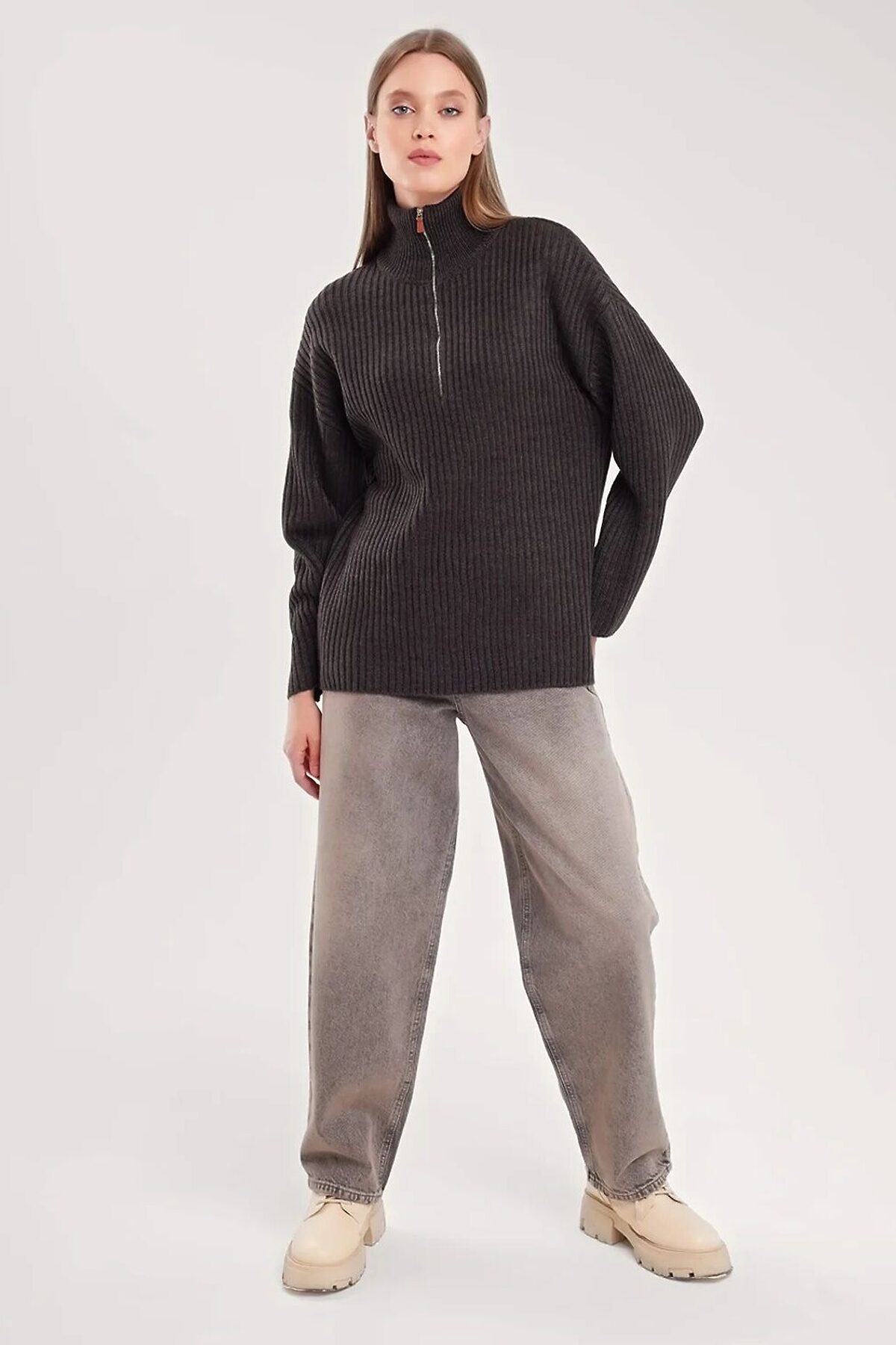Вязаный джемпер умеренного объема из акриловой пряжи с добавлением шерсти, переплетения полуфанг. Спущенный длинный рукав. По горловине стойка с застежкой на молнию.
