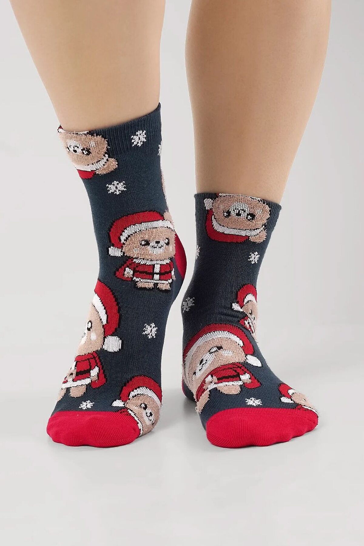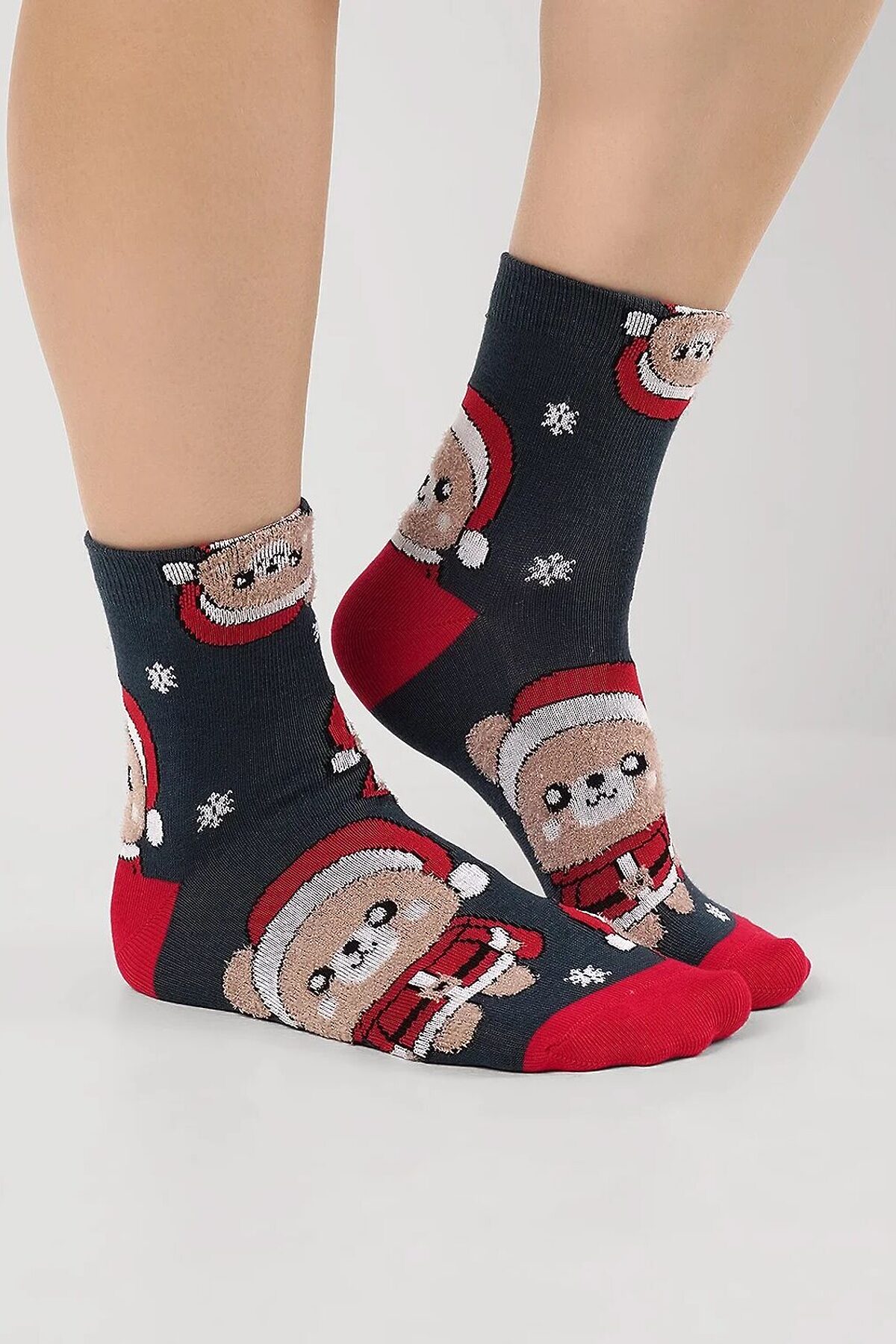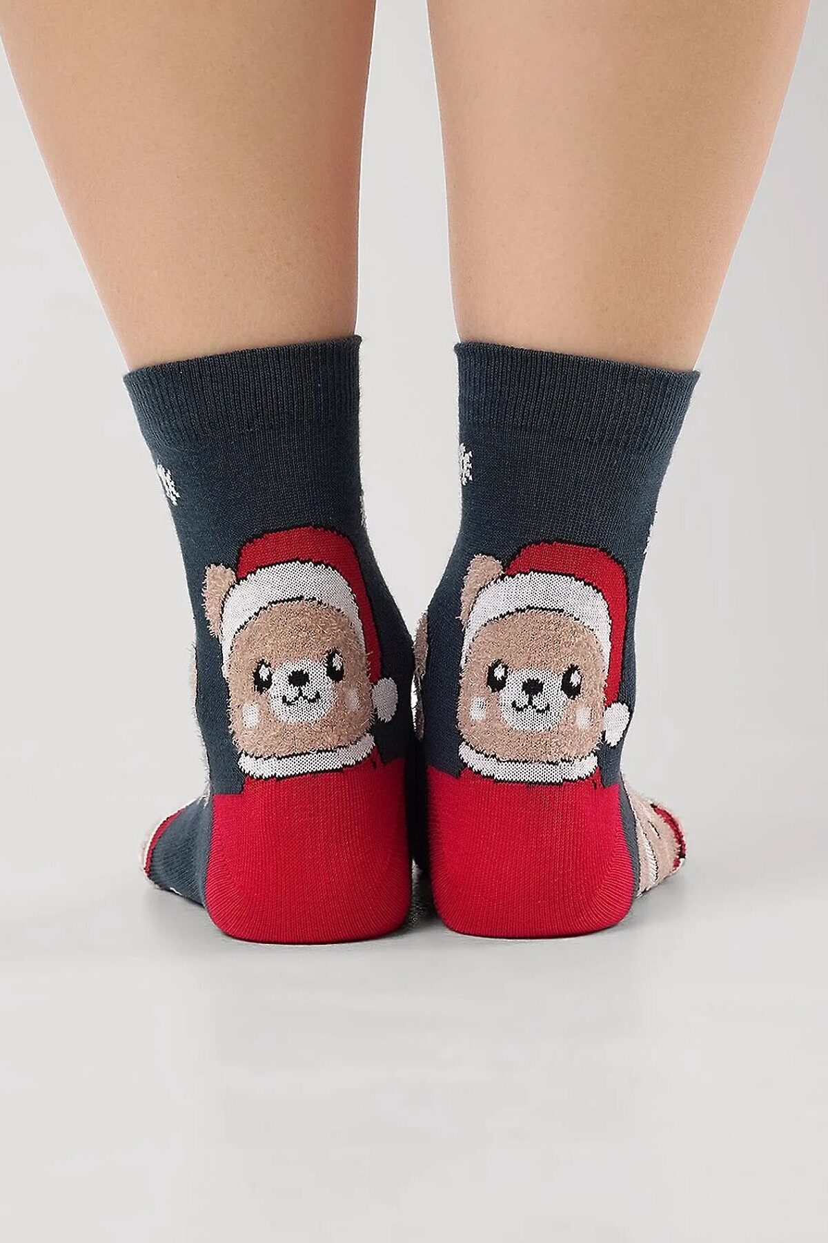 Носки женские с рисунком мишек в новогоднем костюме, мишка выполнен из пряжи травка