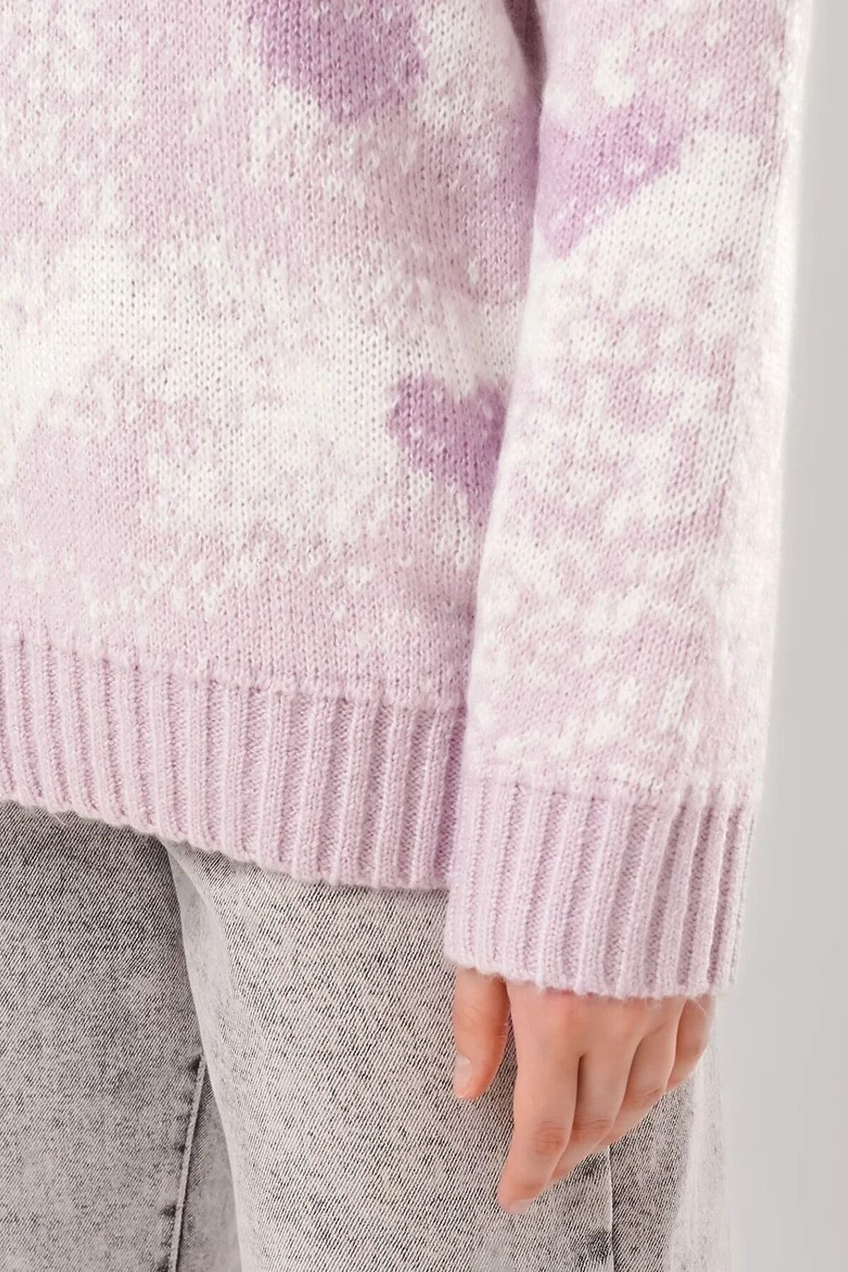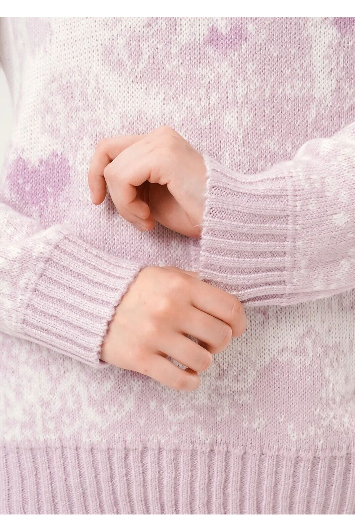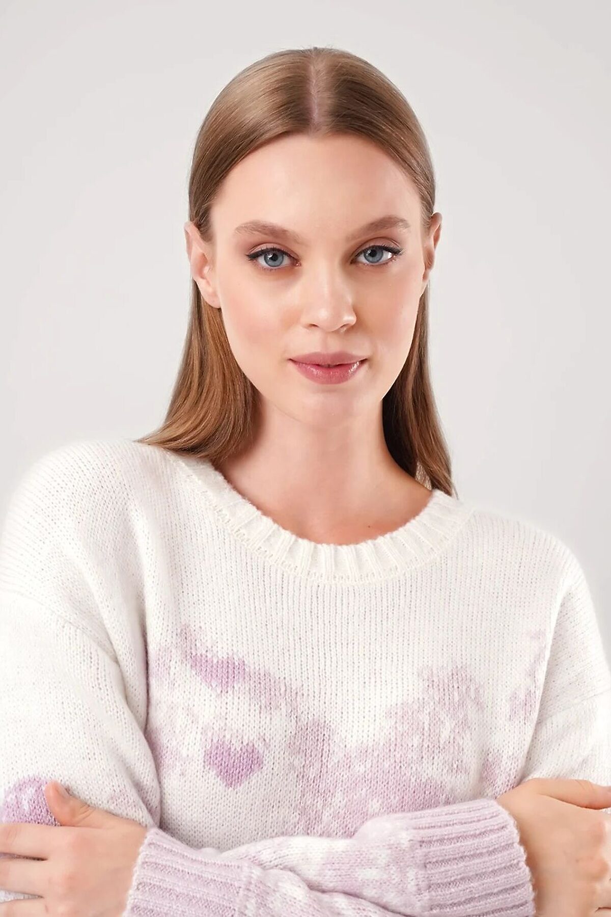 Вязаный джемпер умеренного объема жаккардового переплетения из акриловой пряжи. Спущенный длинный рукав, округлая горловина с бейкой. По низу изделия и рукавов манжеты.