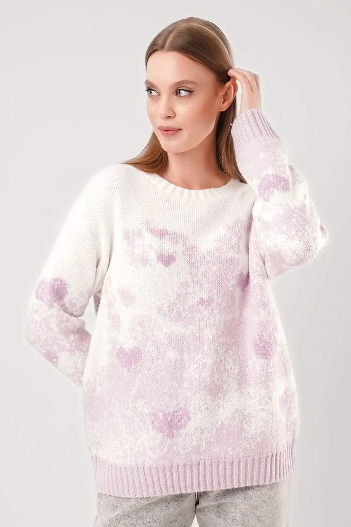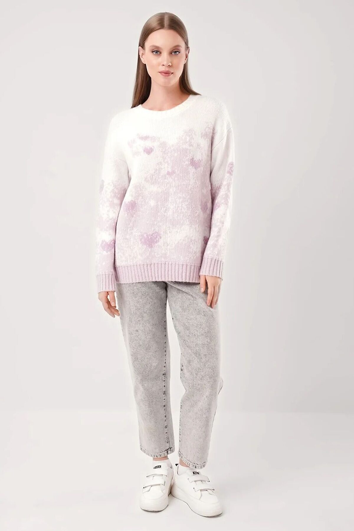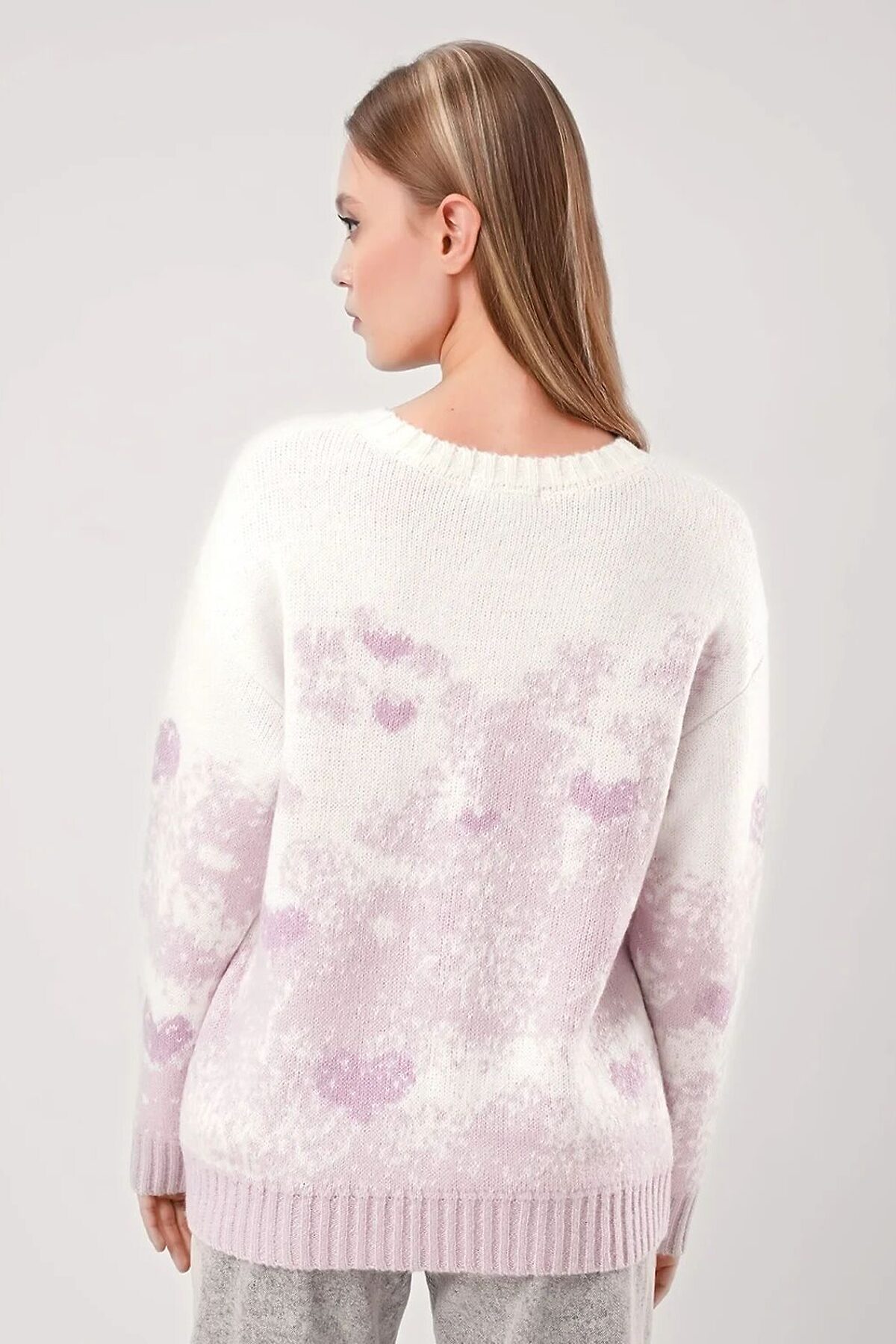 Вязаный джемпер умеренного объема жаккардового переплетения из акриловой пряжи. Спущенный длинный рукав, округлая горловина с бейкой. По низу изделия и рукавов манжеты.