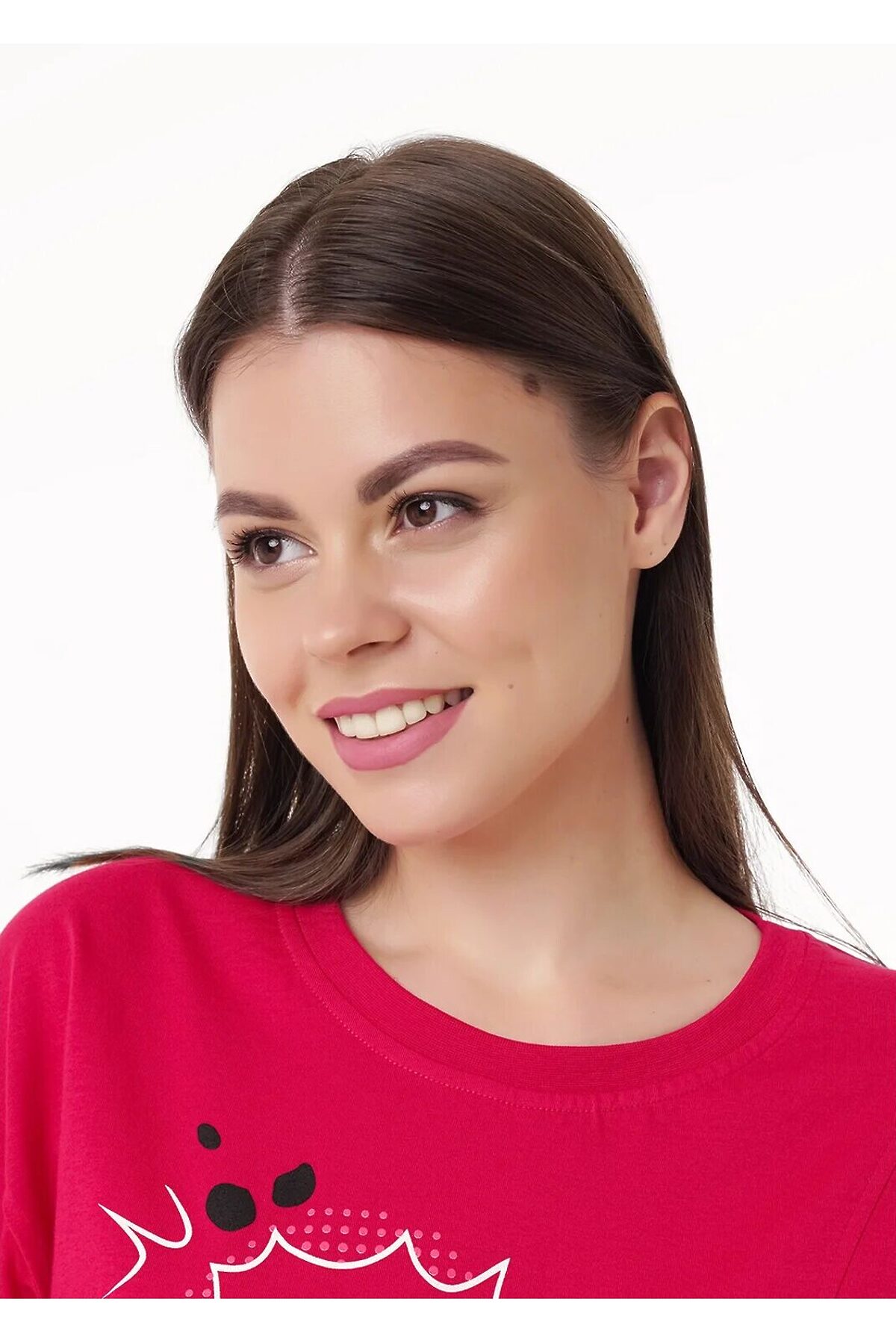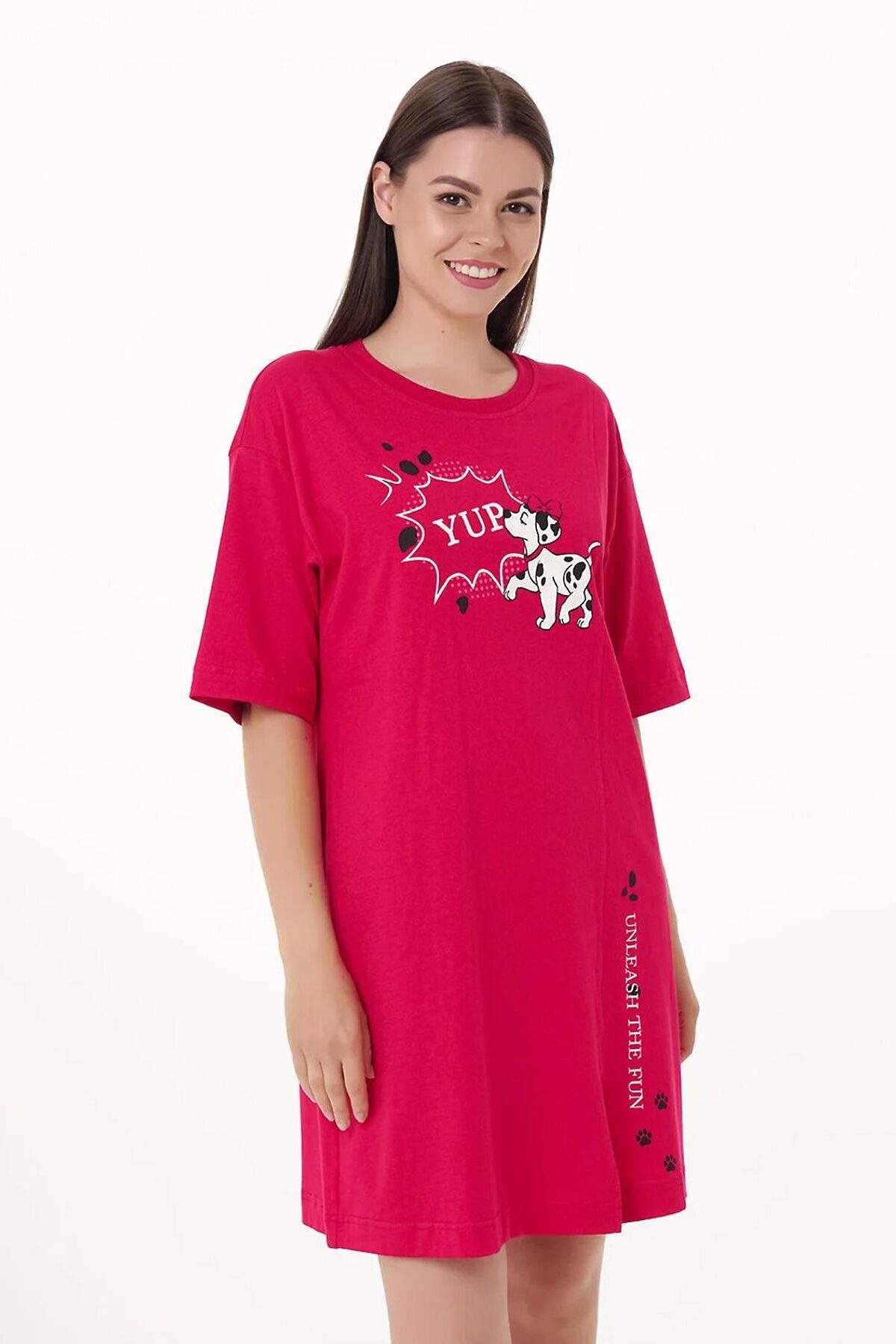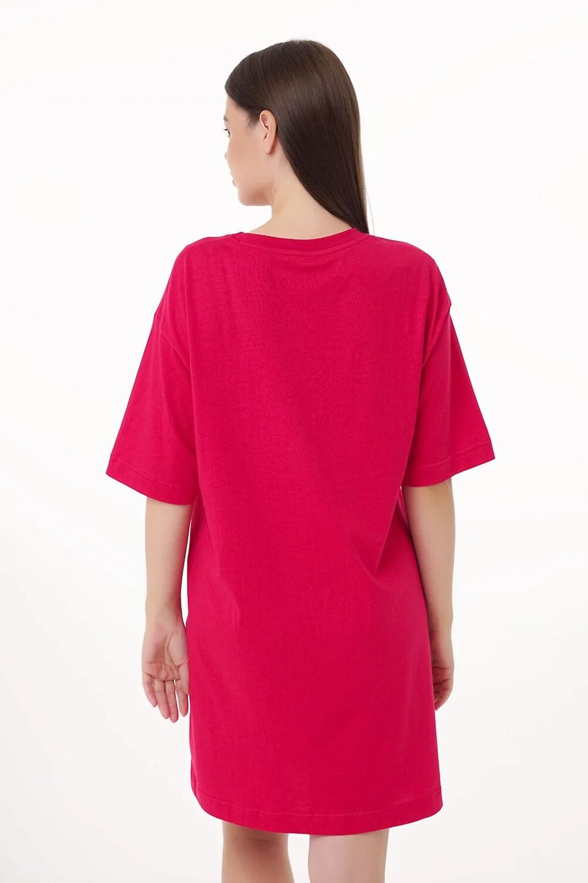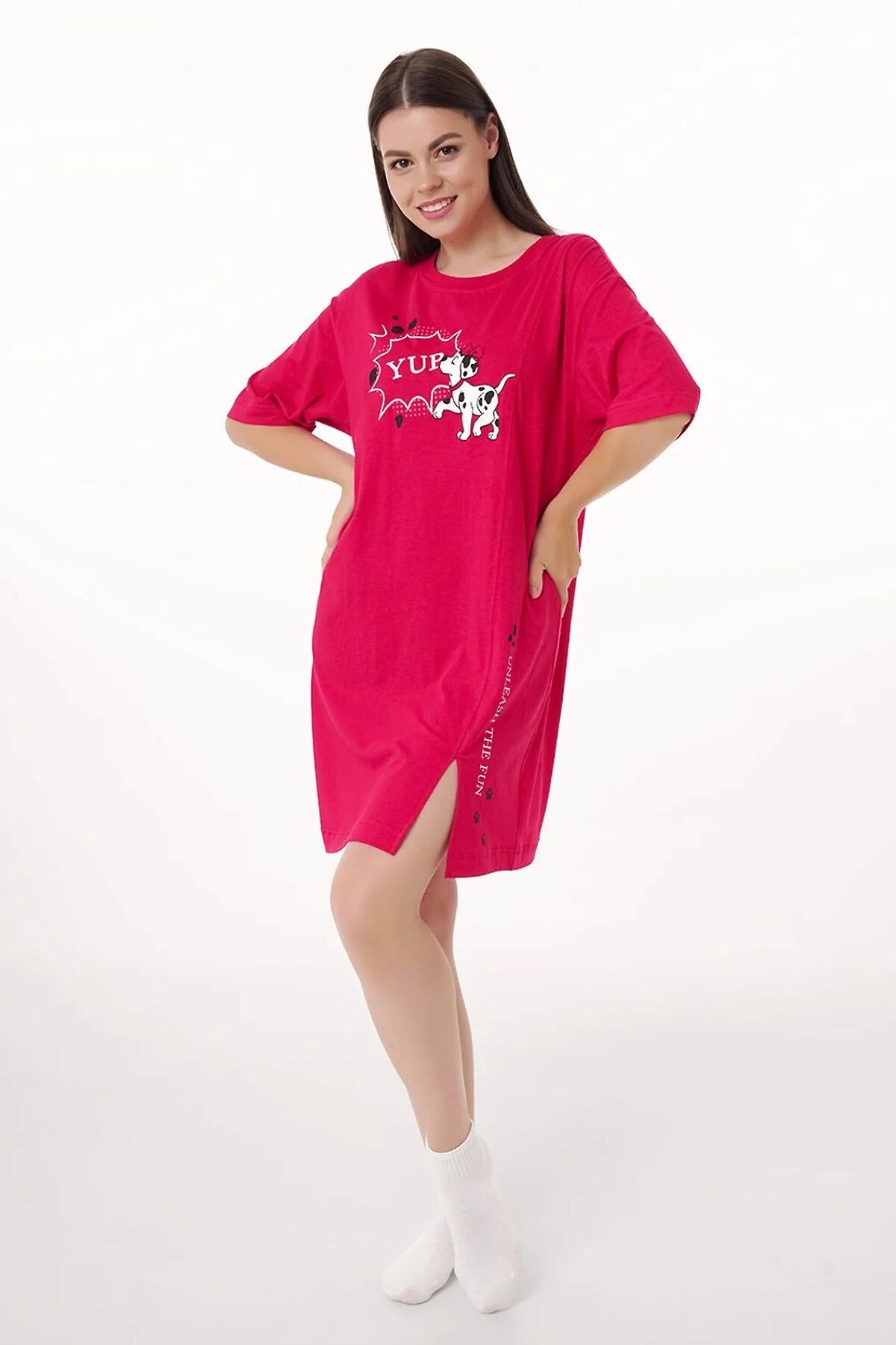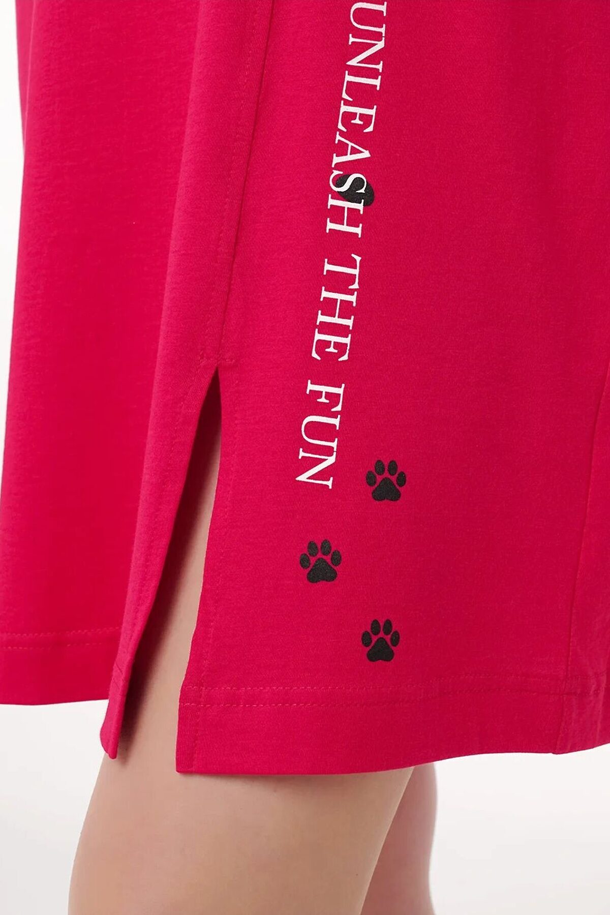 Платье для дома и отдыха из хлопкового трикотажного полотна прямого кроя. Округлая горловина с обтачкой. Короткий втачной рукав. По переду рез с разрезом. Спереди принт.