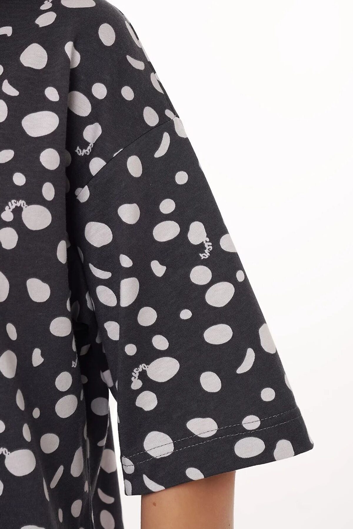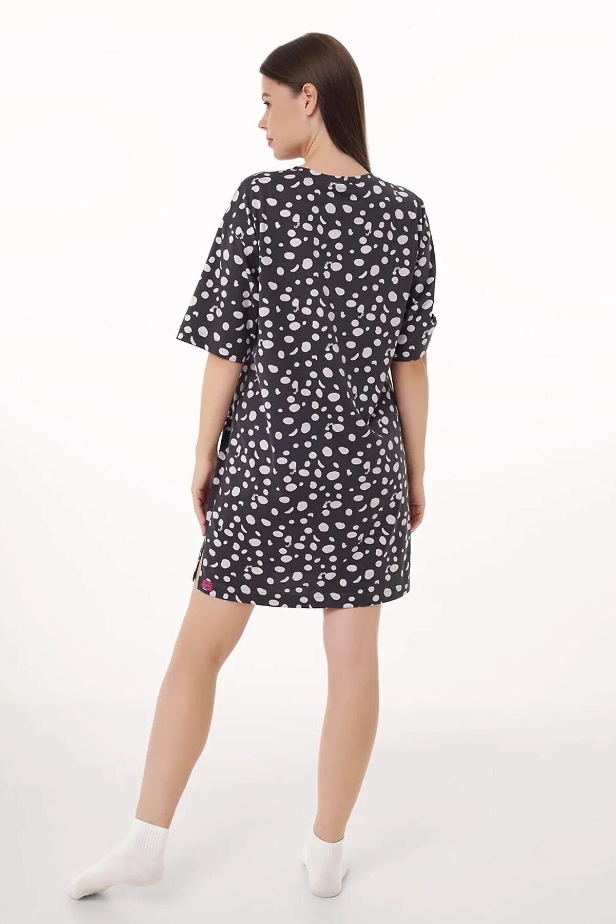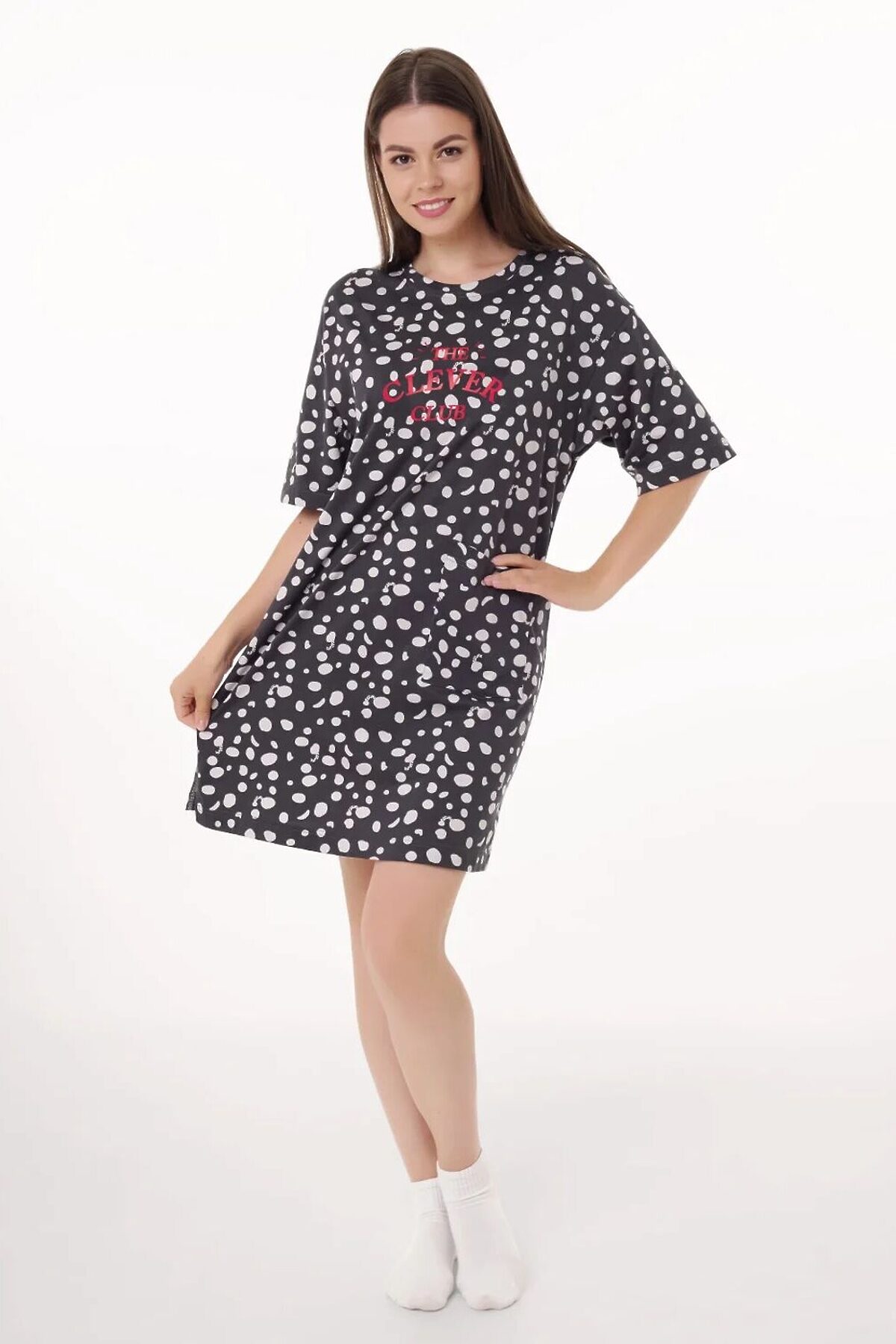 Платье для дома и отдыха из хлопкового трикотажного полотна прямого кроя. Округлая горловина с обтачкой. Короткий втачной рукав. Спереди принт фольга, накладной карман. Боковые разрезы,сзади по низу нашивка.