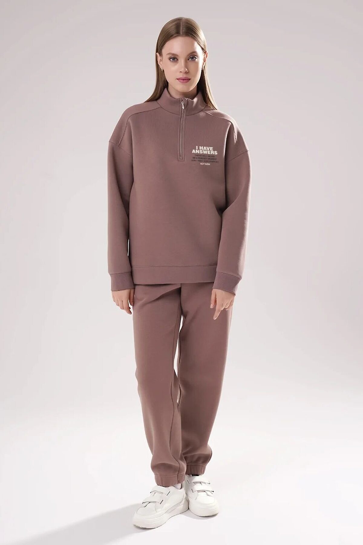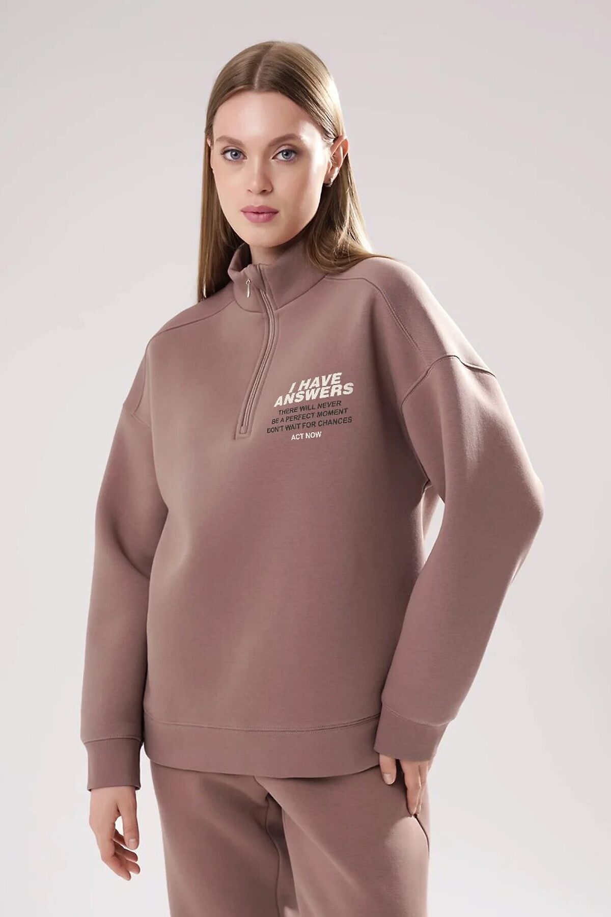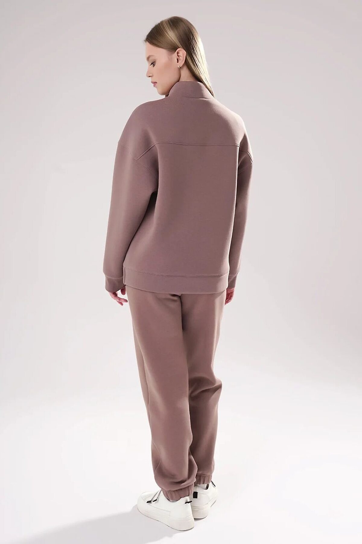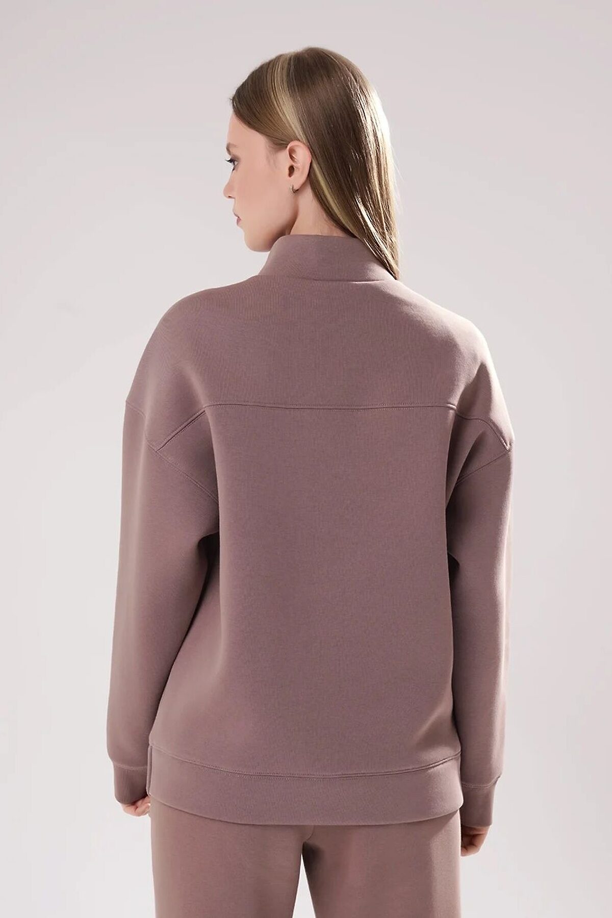 Джемпер спортивный из трикотажного полотна футер с начесом, свободного кроя. Длинный рукав со спущенной линией плеча. По горловине стойка с застежкой на молнию. По спинке кокетка. По низу рукава и изделия манжет. Спереди принт.