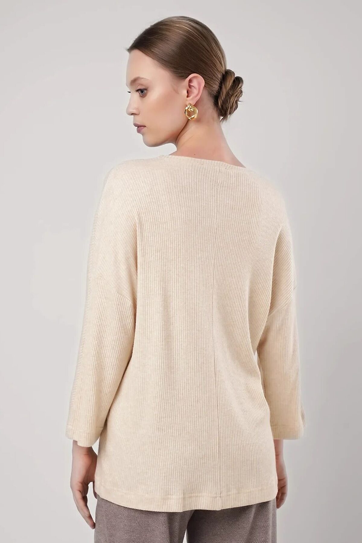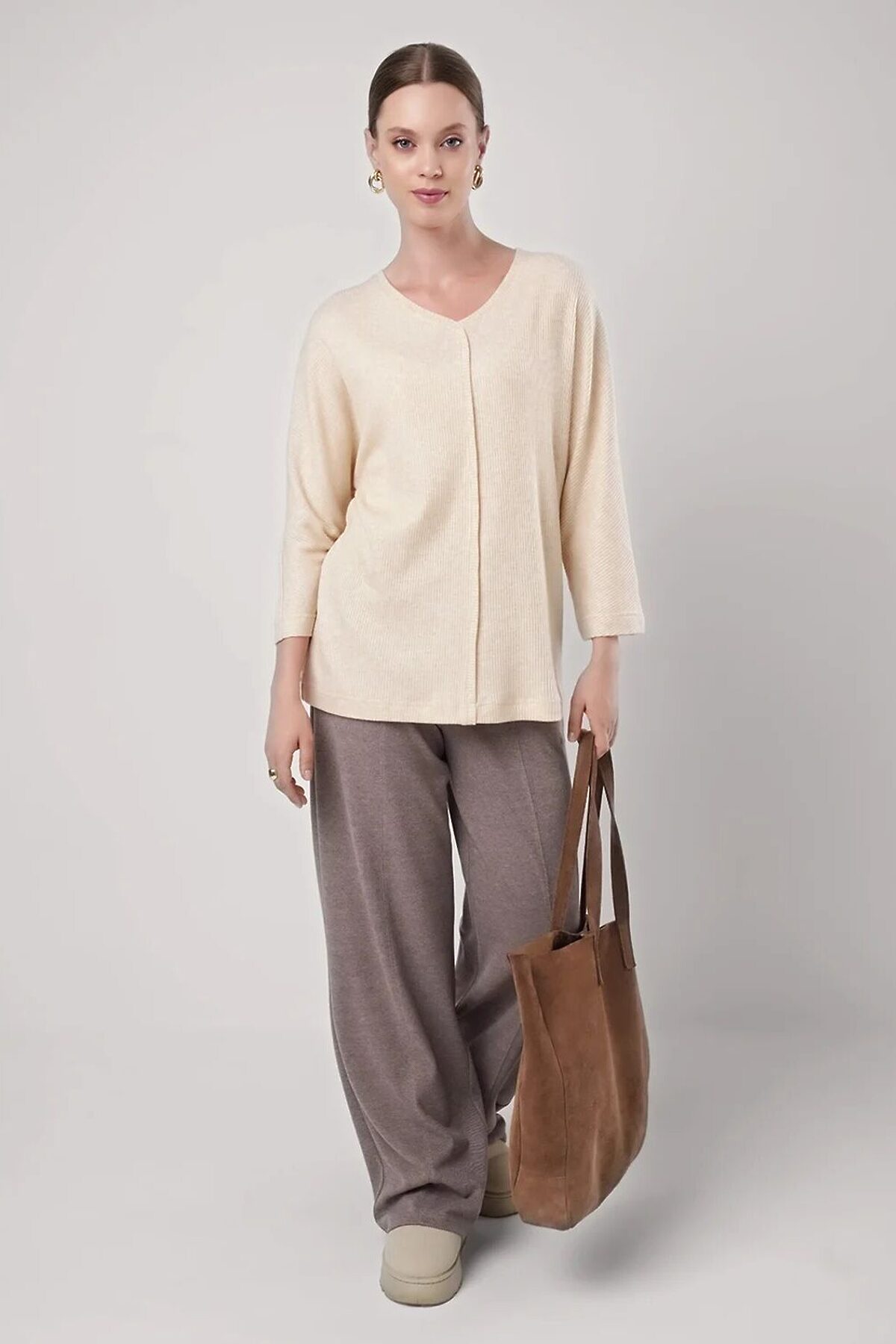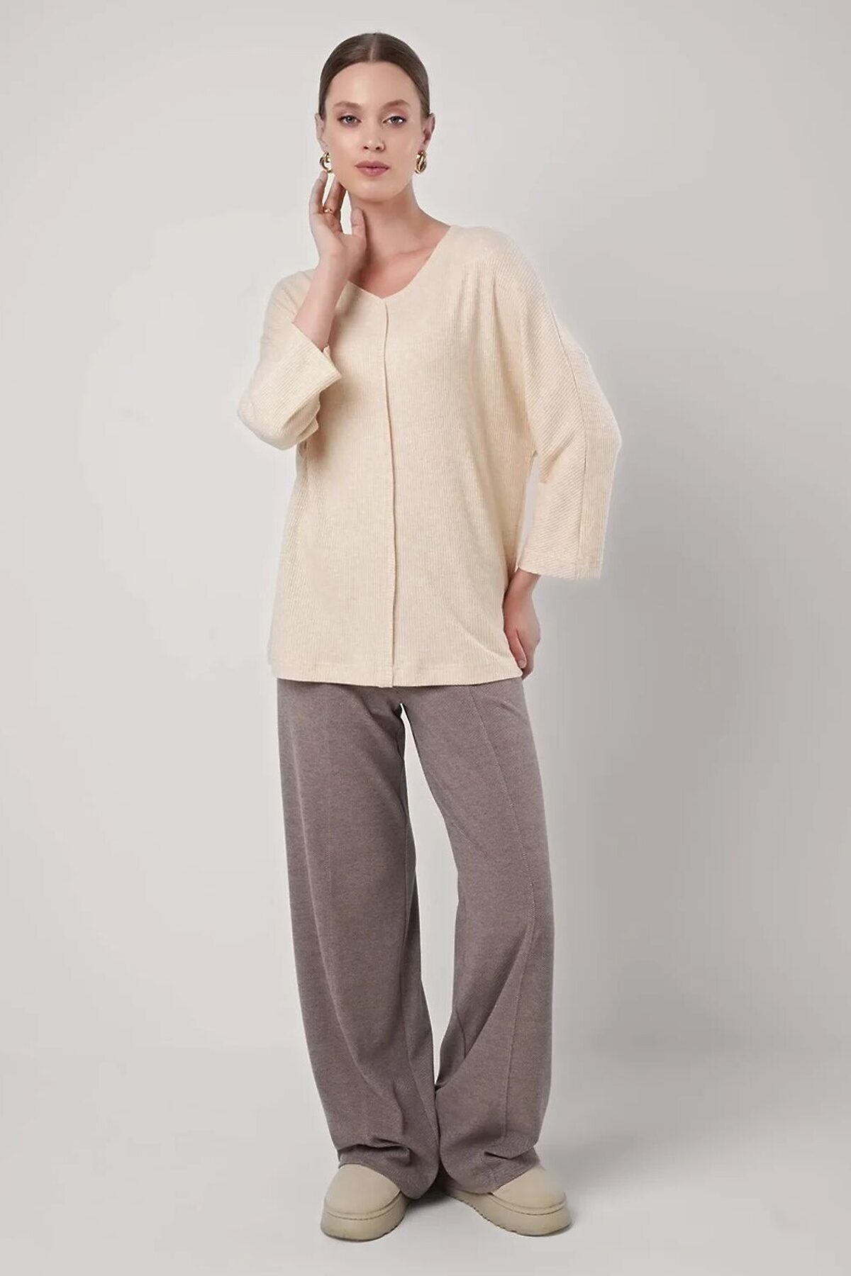 Джемпер свободного кроя из трикотажного полотна кашкорсе. По горловине притачная обтачка, переходящая на перед. Длинный цельнокроенный рукав спереди, по спинке спущенный. По переду и спинке средний шов.
