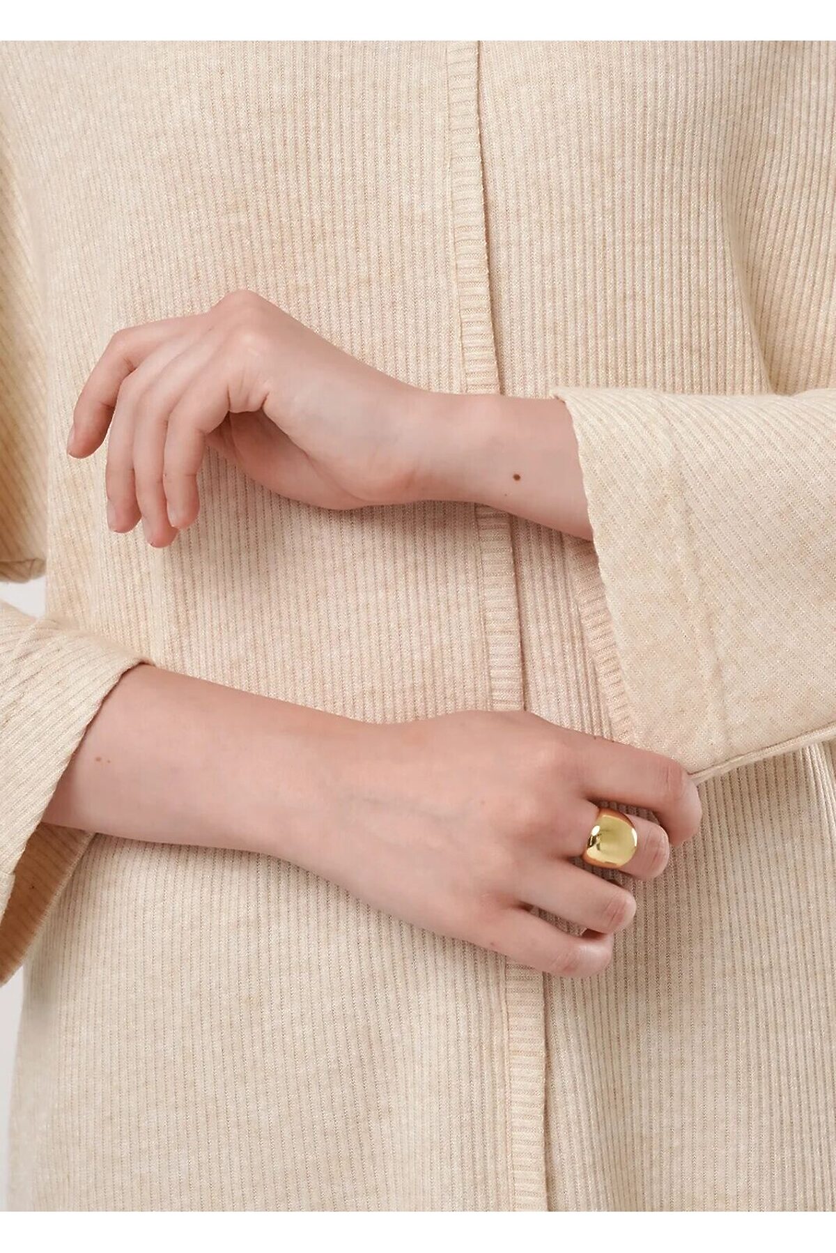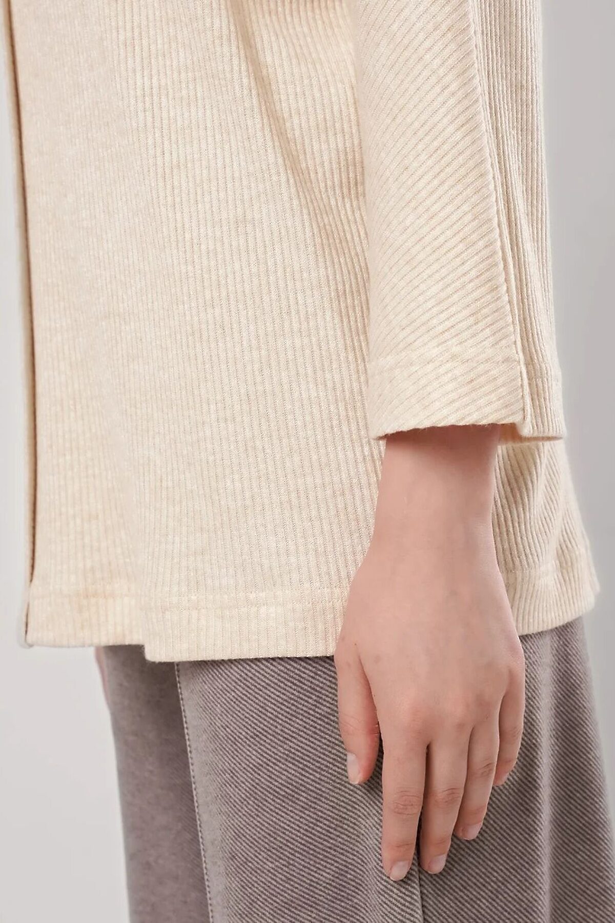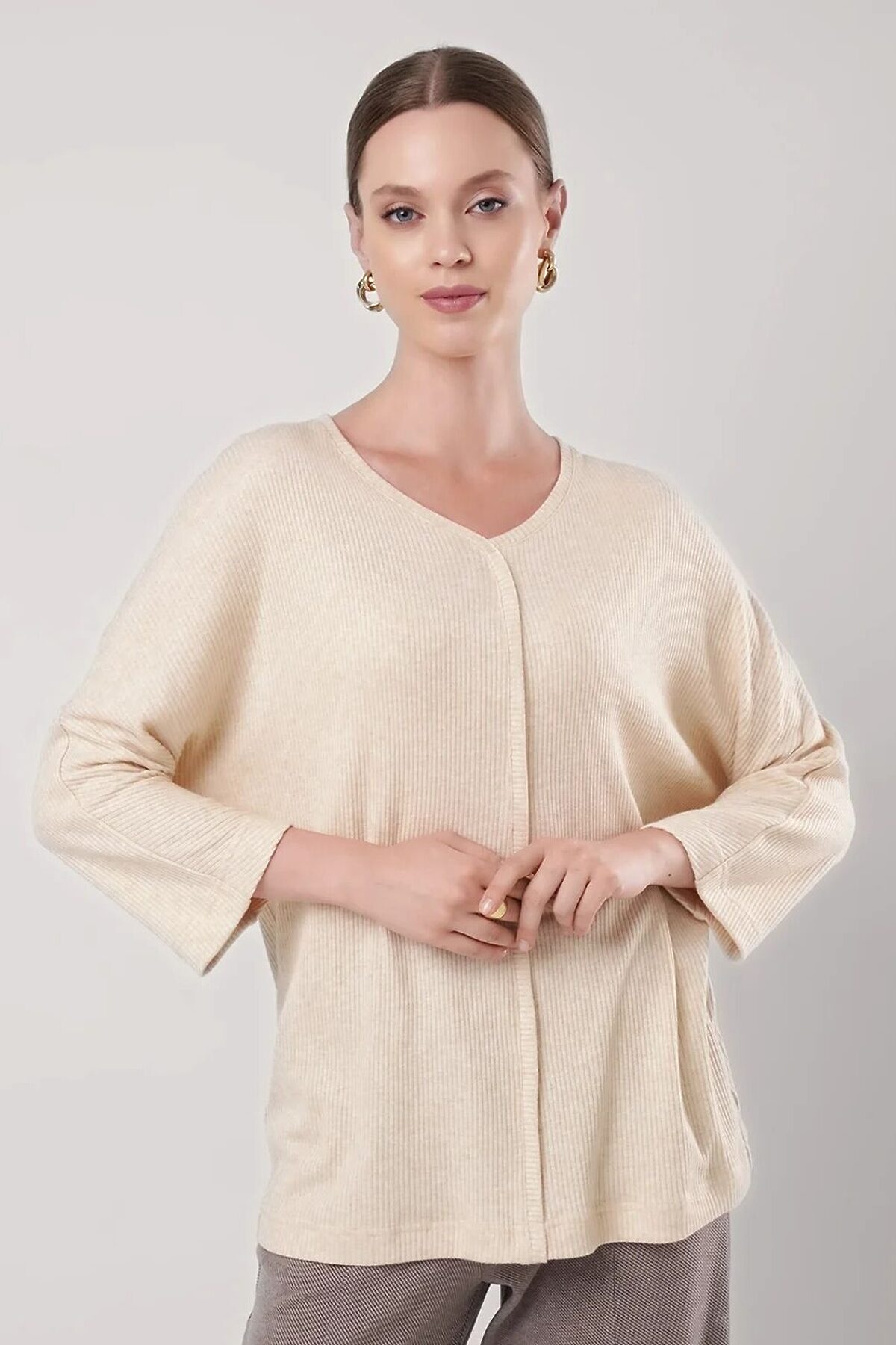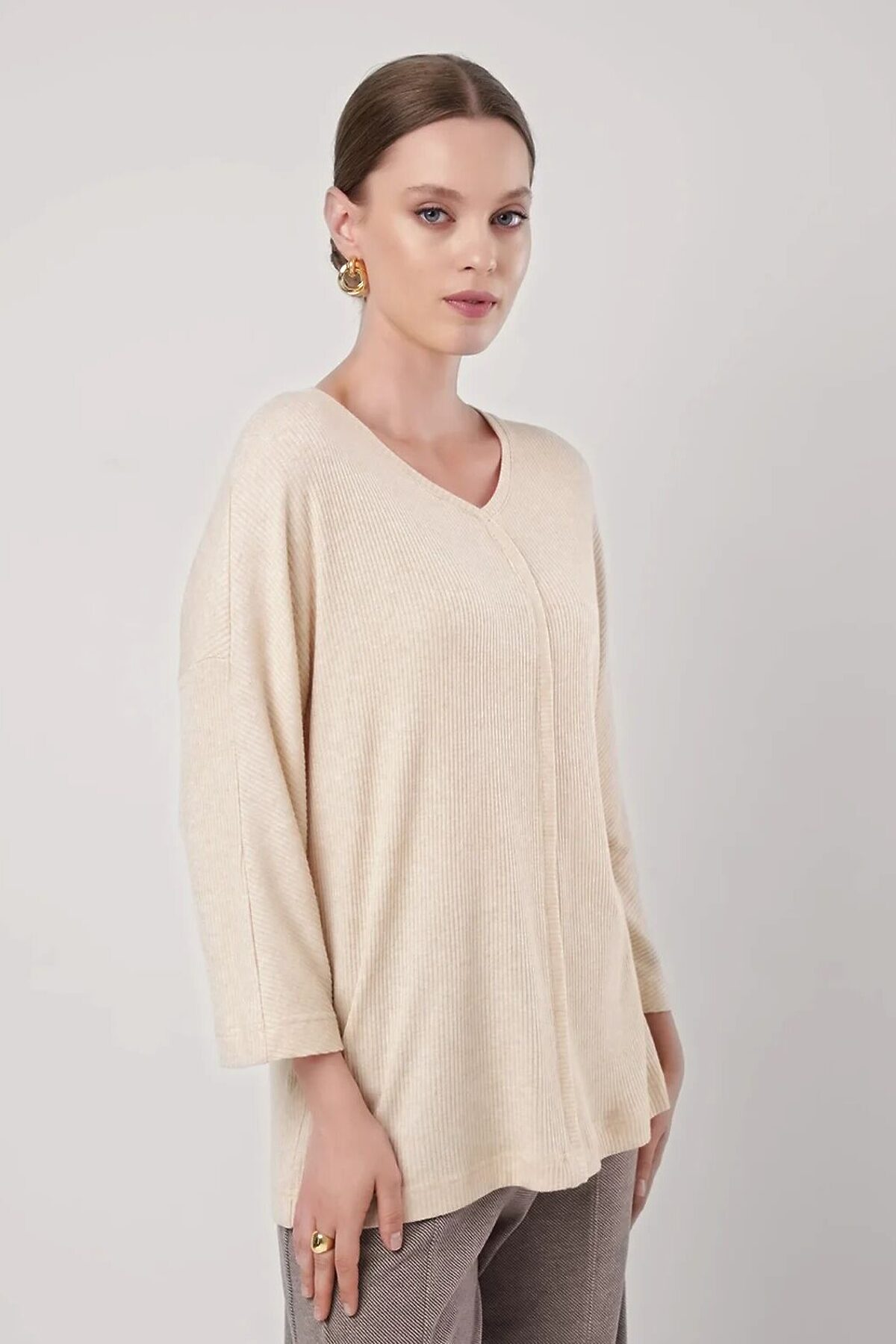 Джемпер свободного кроя из трикотажного полотна кашкорсе. По горловине притачная обтачка, переходящая на перед. Длинный цельнокроенный рукав спереди, по спинке спущенный. По переду и спинке средний шов.