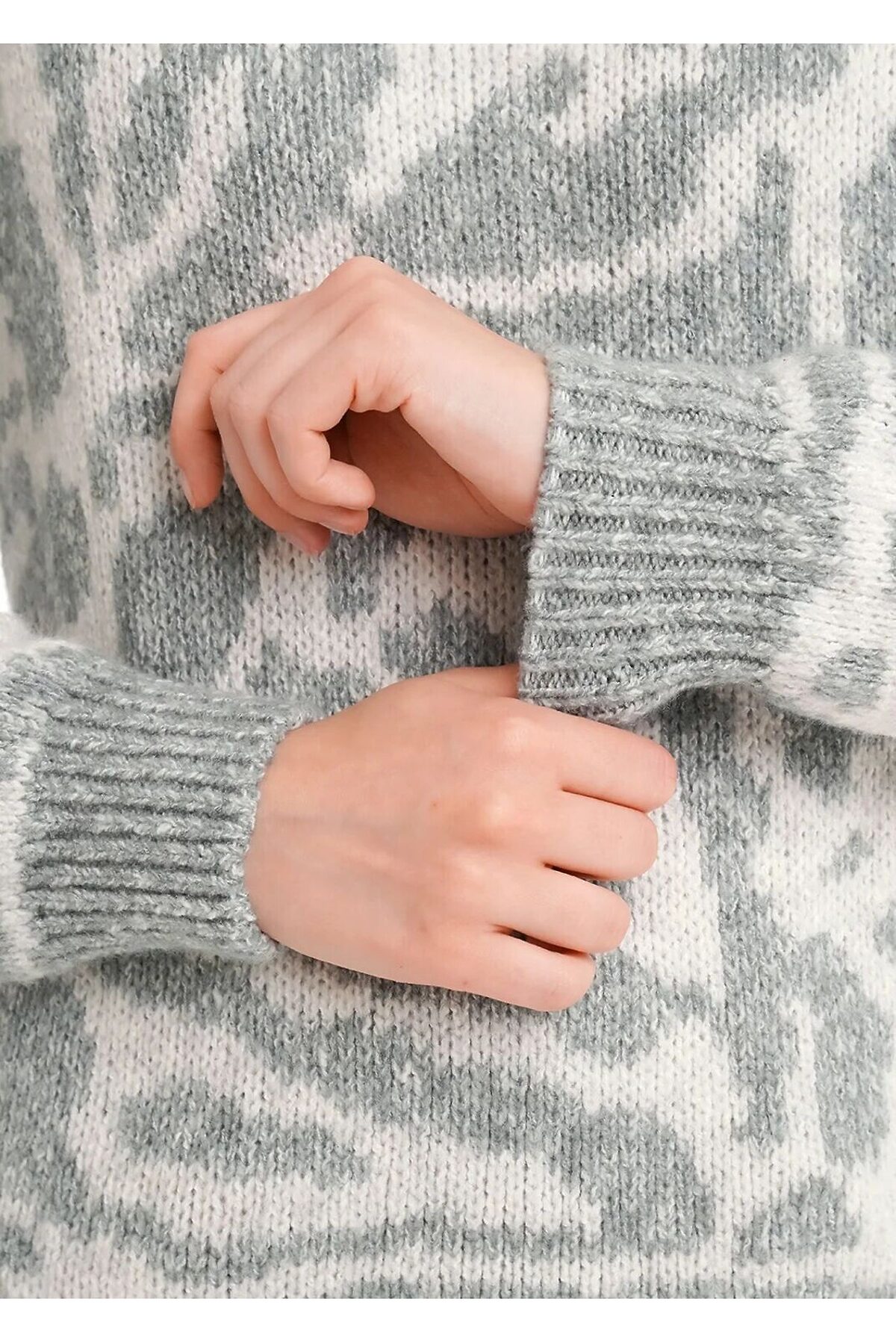 Вязаный джемпер прямого силуэта из акриловой пряжи с добавлением хлопка. Длинный втачной рукав. По низу рукава и изделия манжеты. Основное переплетение жаккард. Округлая горловина с бейкой.