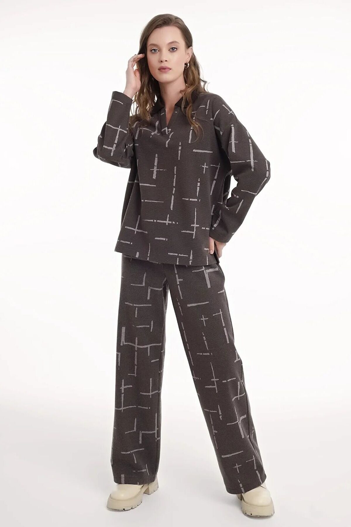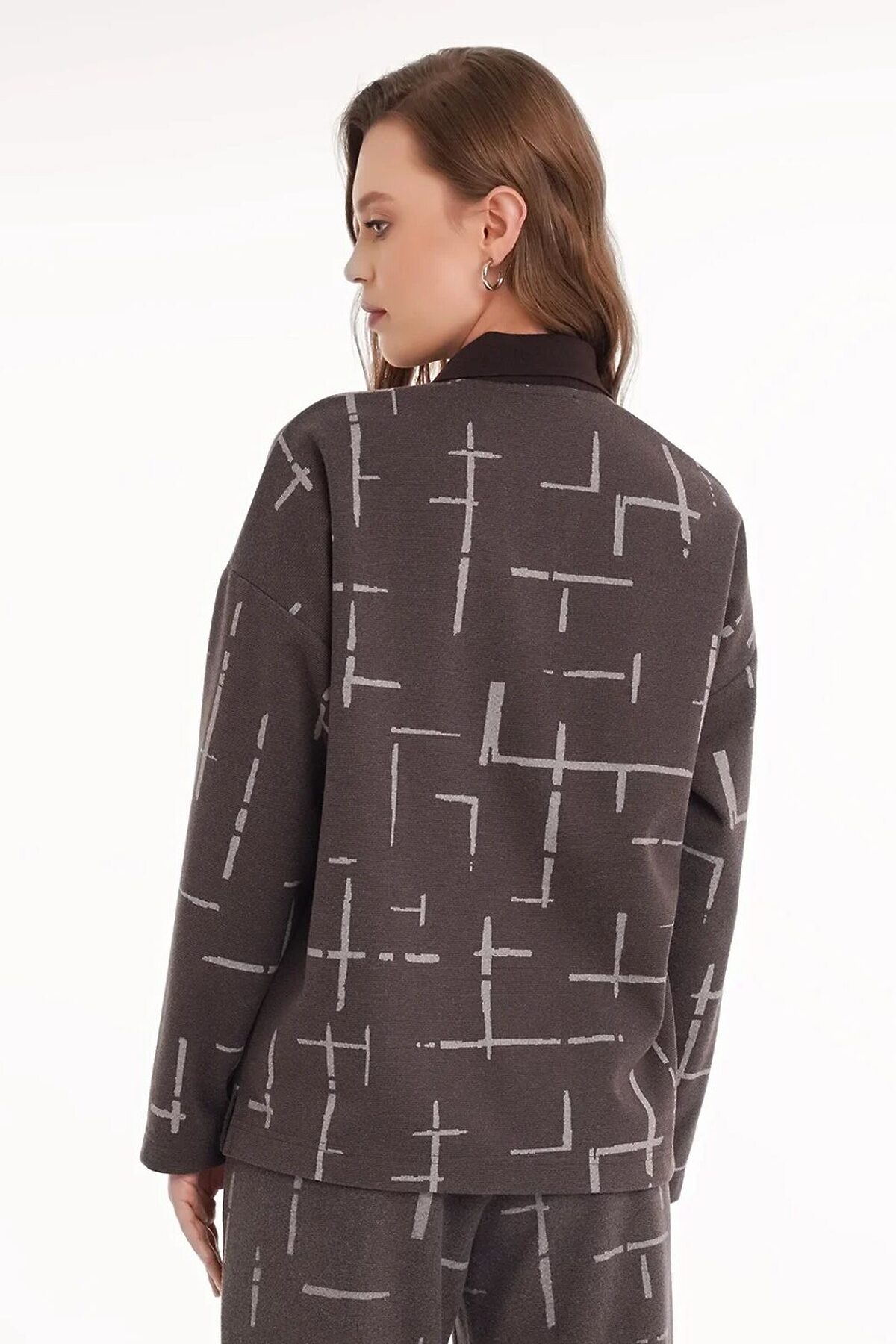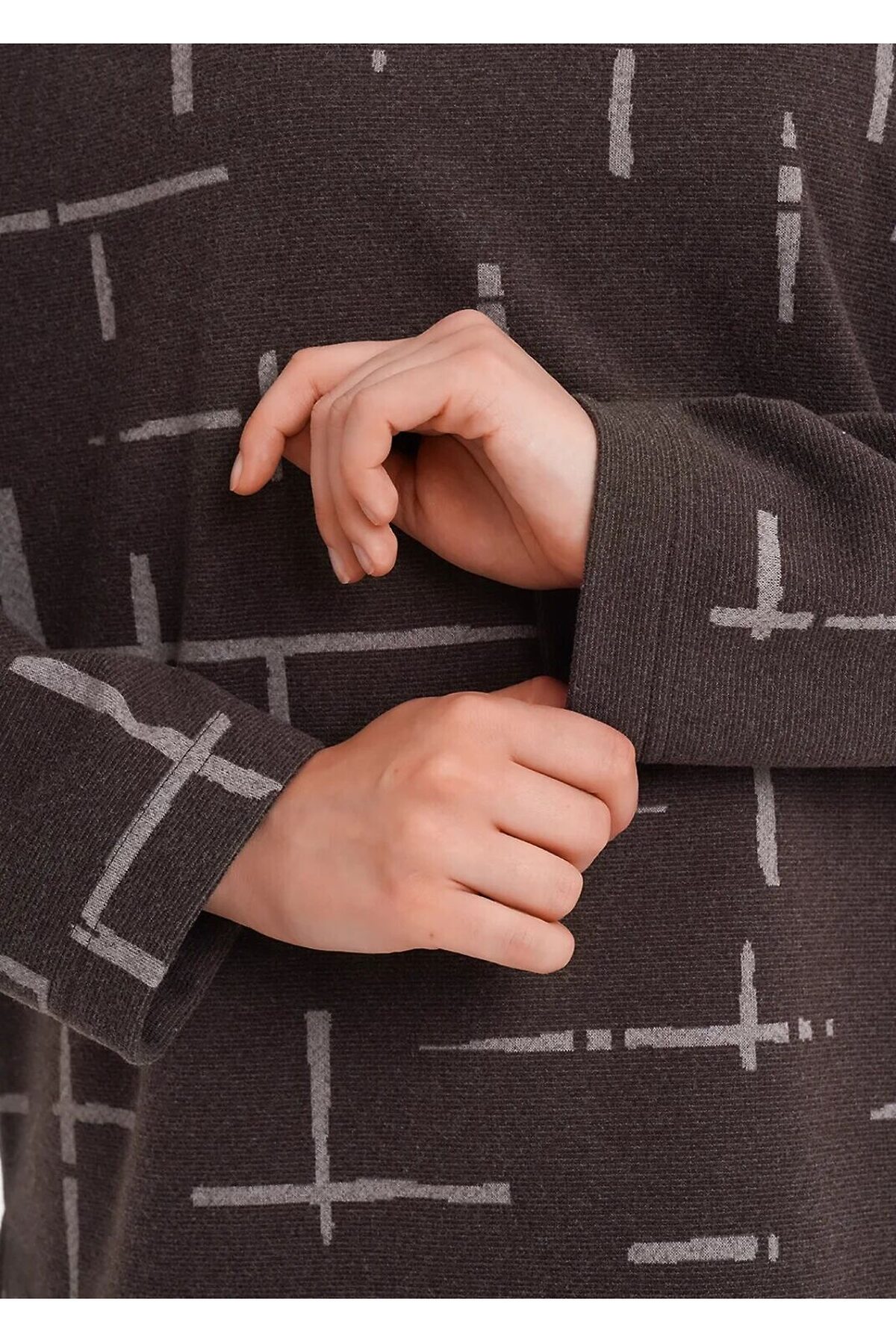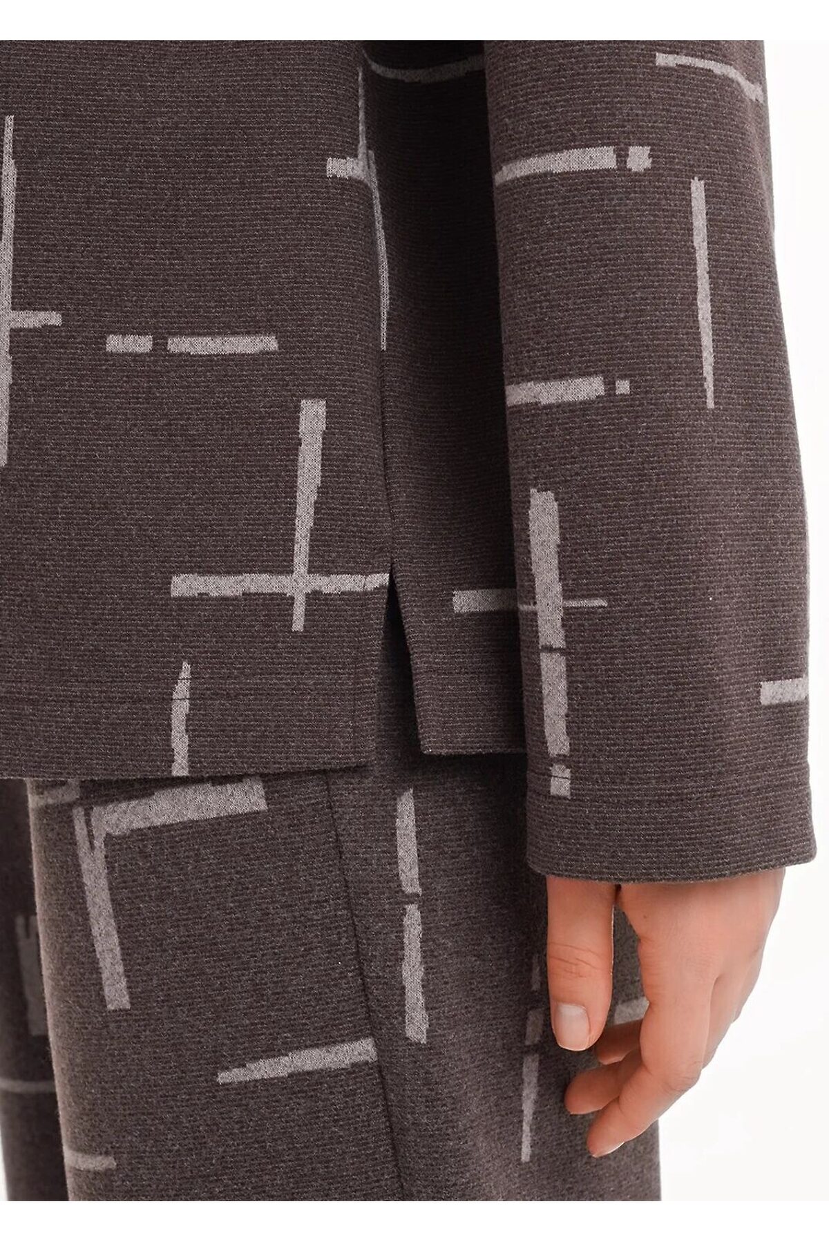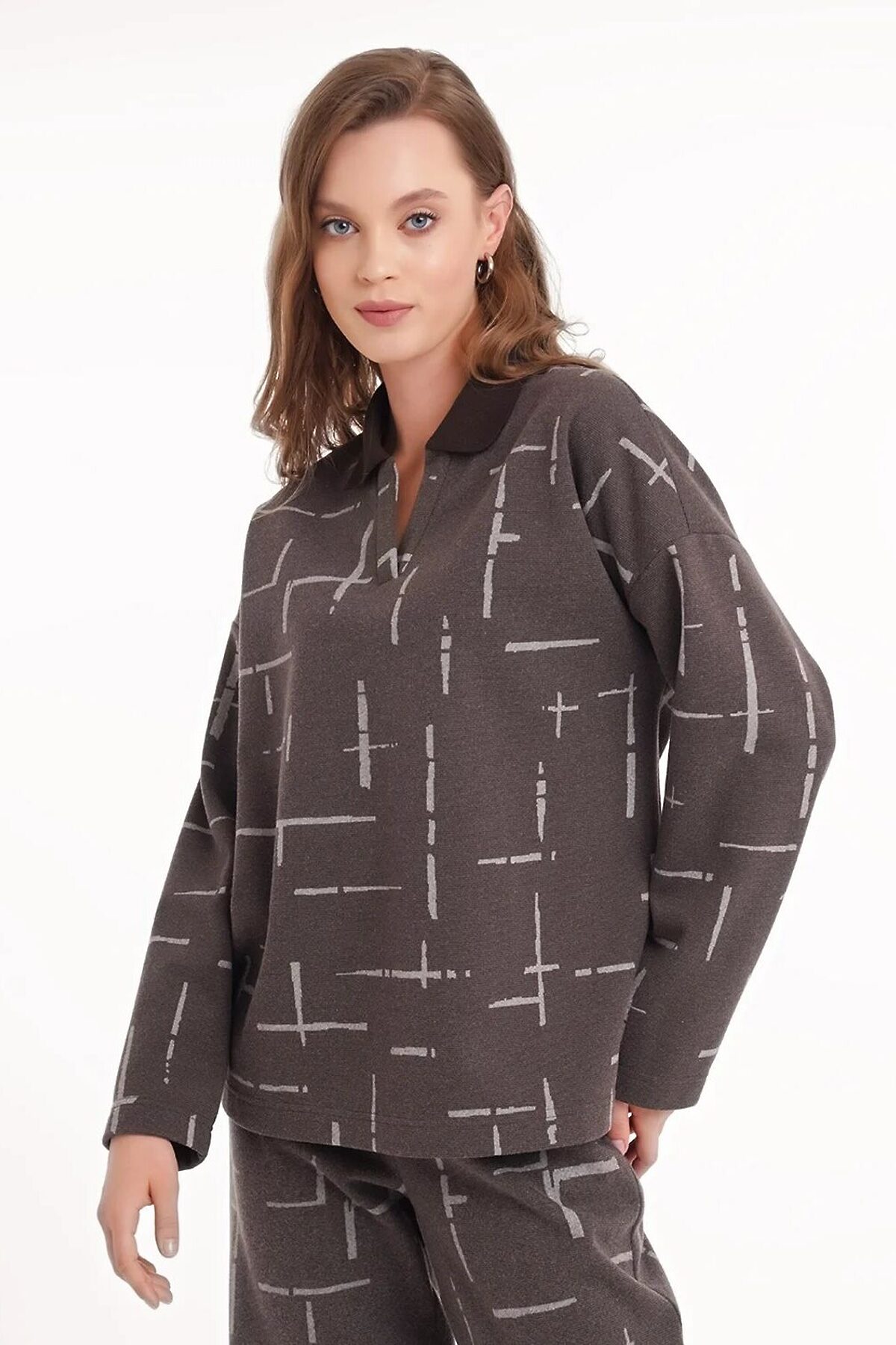 Джемпер прямого силуэта из поливискозного трикотажного полотна джерси. Спущенный длинный рукав. По горловине отложной вязаный воротник с планкой. Боковые разрезы.