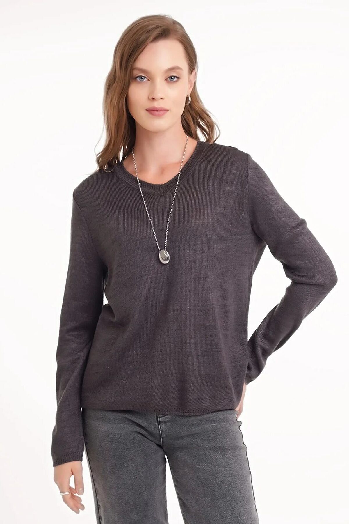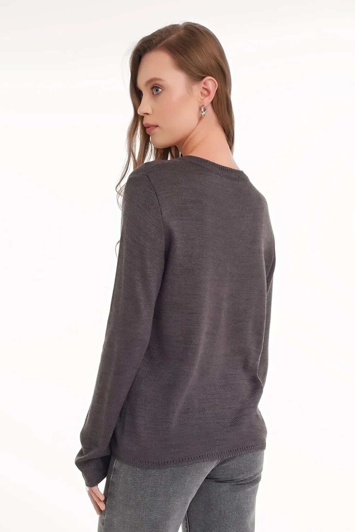 Вязаный джемпер прямого силуэта из акриловой пряжи, переплетения гладь. Длинный втачной рукав. V-образный вырез горловины. По горловине,низу рукава и изделия ажурный рулик.