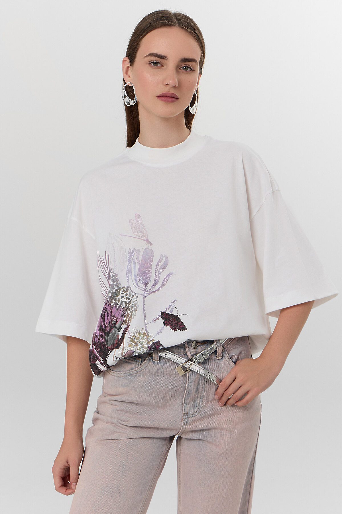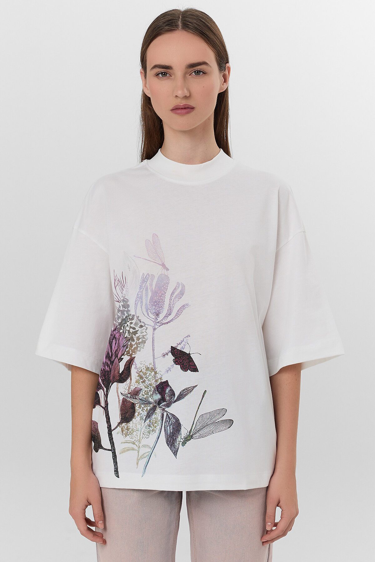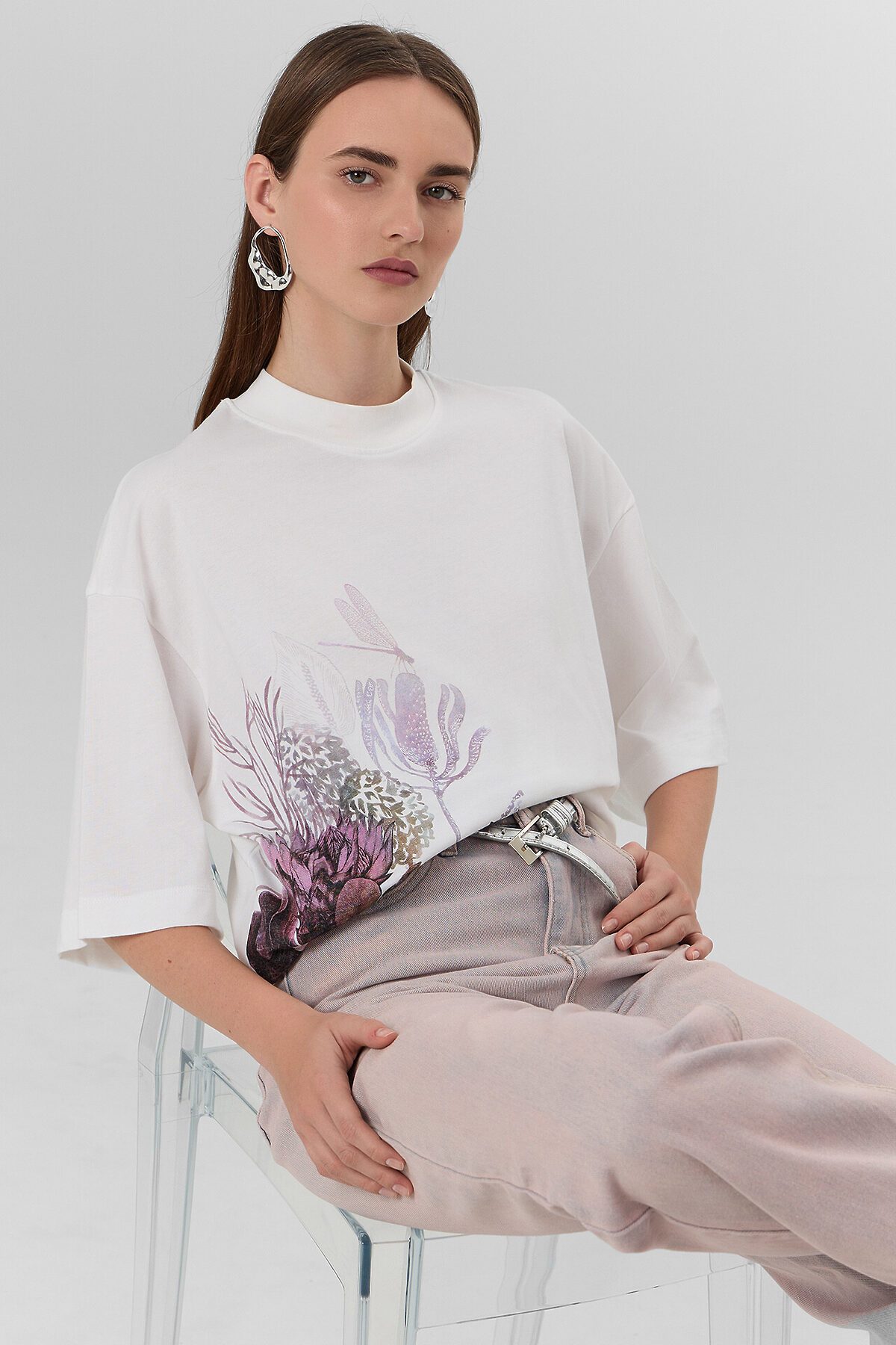 Футболка женская свободного силуэта из трикотажного кулирного пототна. Горловина круглой формы, с широкой обтачкой из рибаны. Плечо спущено, пройма углублена. Рукав втачной, длиной по локоть. Подгибка низа и рукавов широкая.