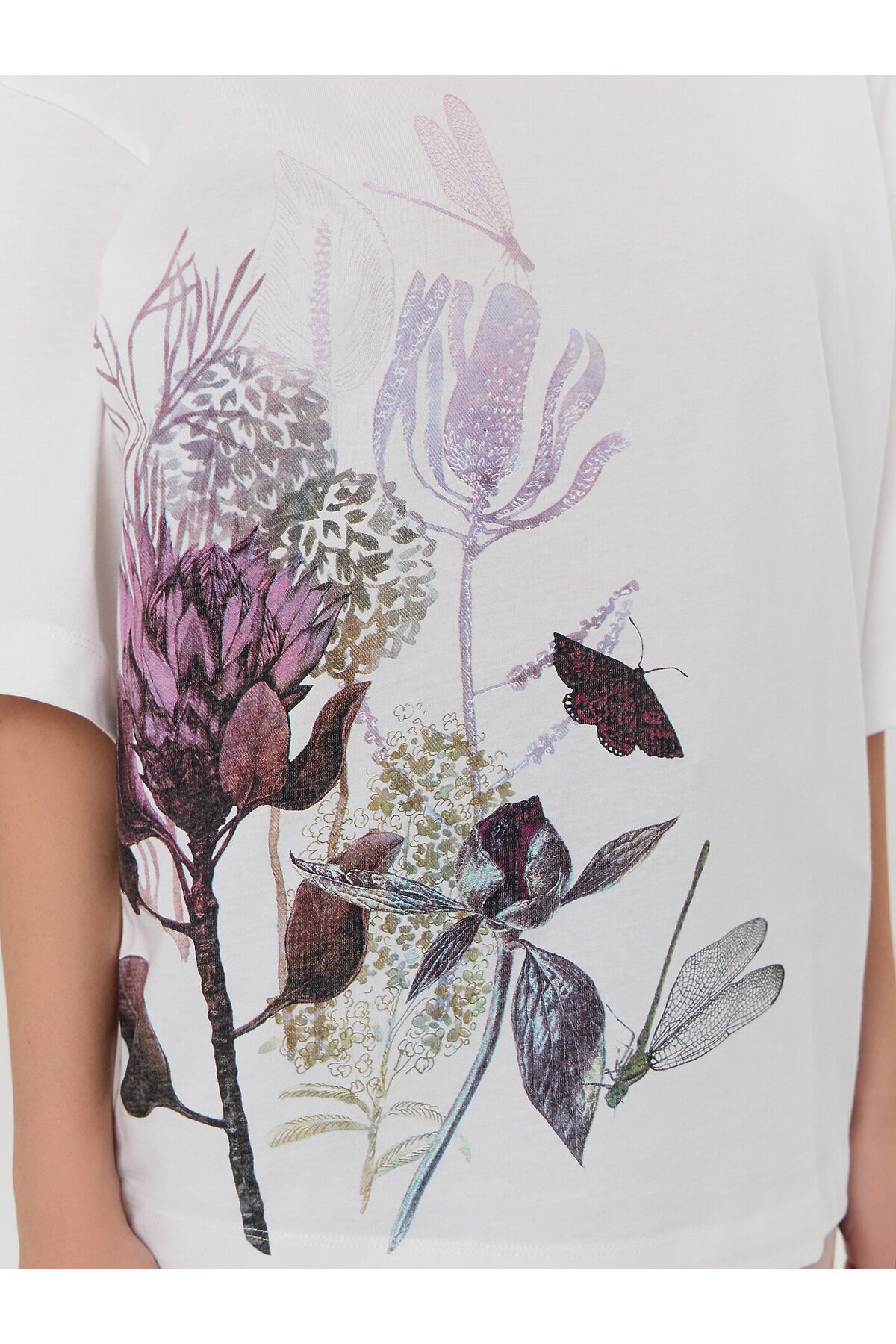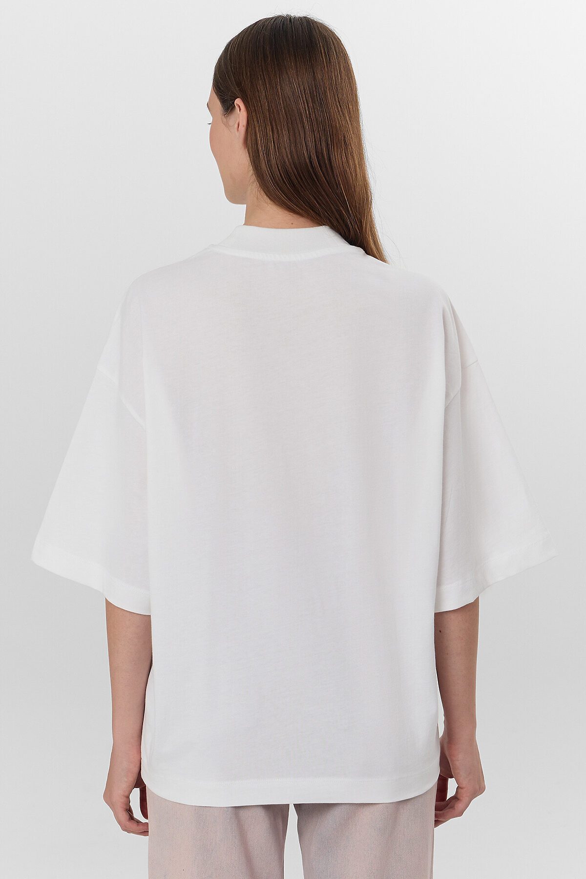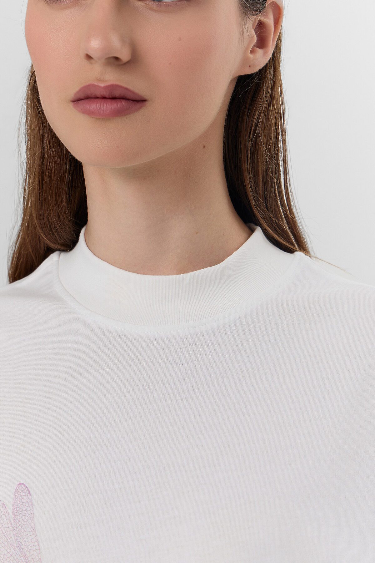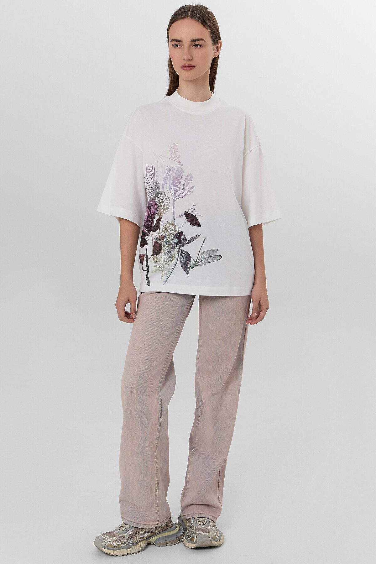 Футболка женская свободного силуэта из трикотажного кулирного пототна. Горловина круглой формы, с широкой обтачкой из рибаны. Плечо спущено, пройма углублена. Рукав втачной, длиной по локоть. Подгибка низа и рукавов широкая.