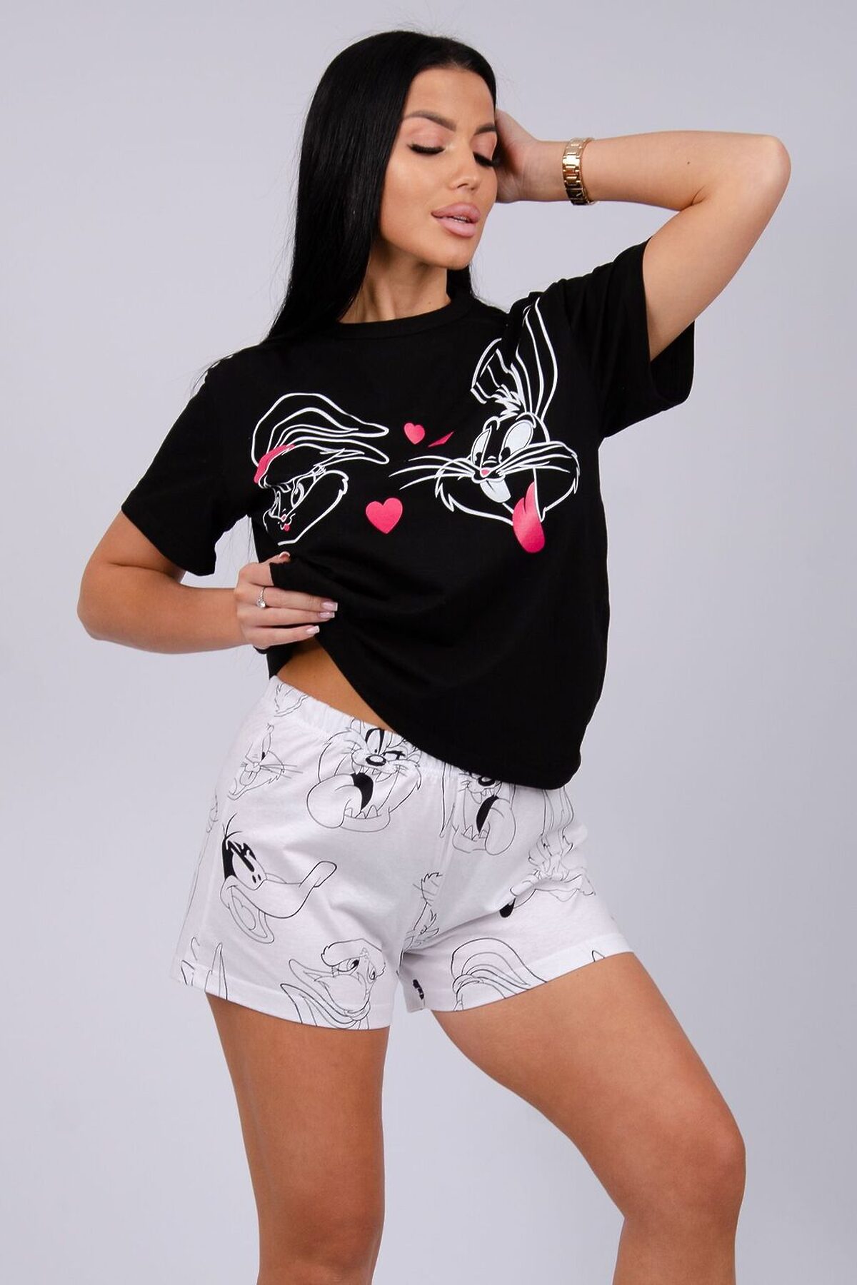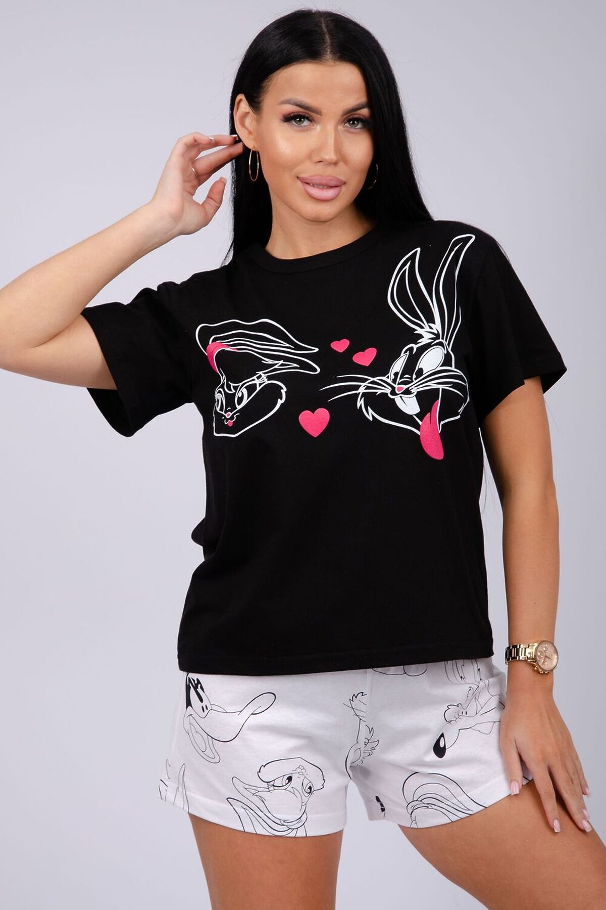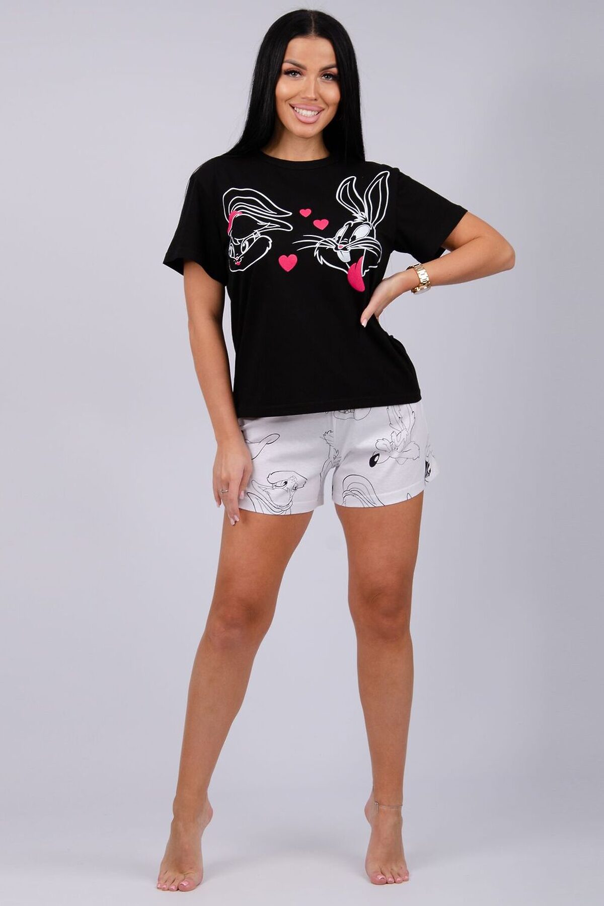 Пижама женская состоит из футболки с коротким рукавом и шортов. Футболка из однотонной кулирки с красивым принтом, шорты свободного покроя из ткани кулирка.