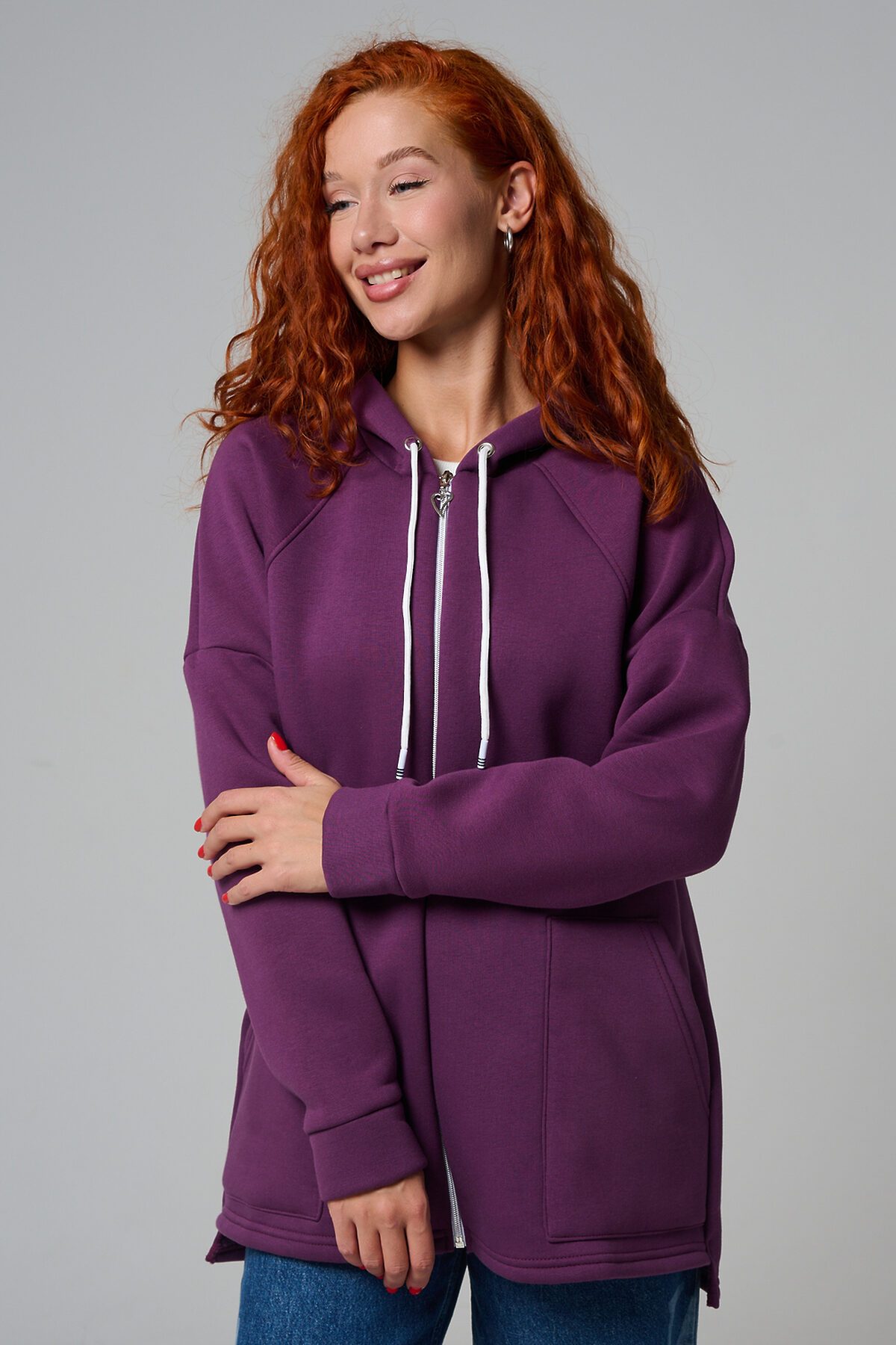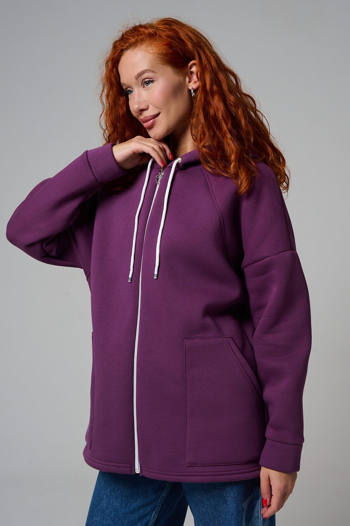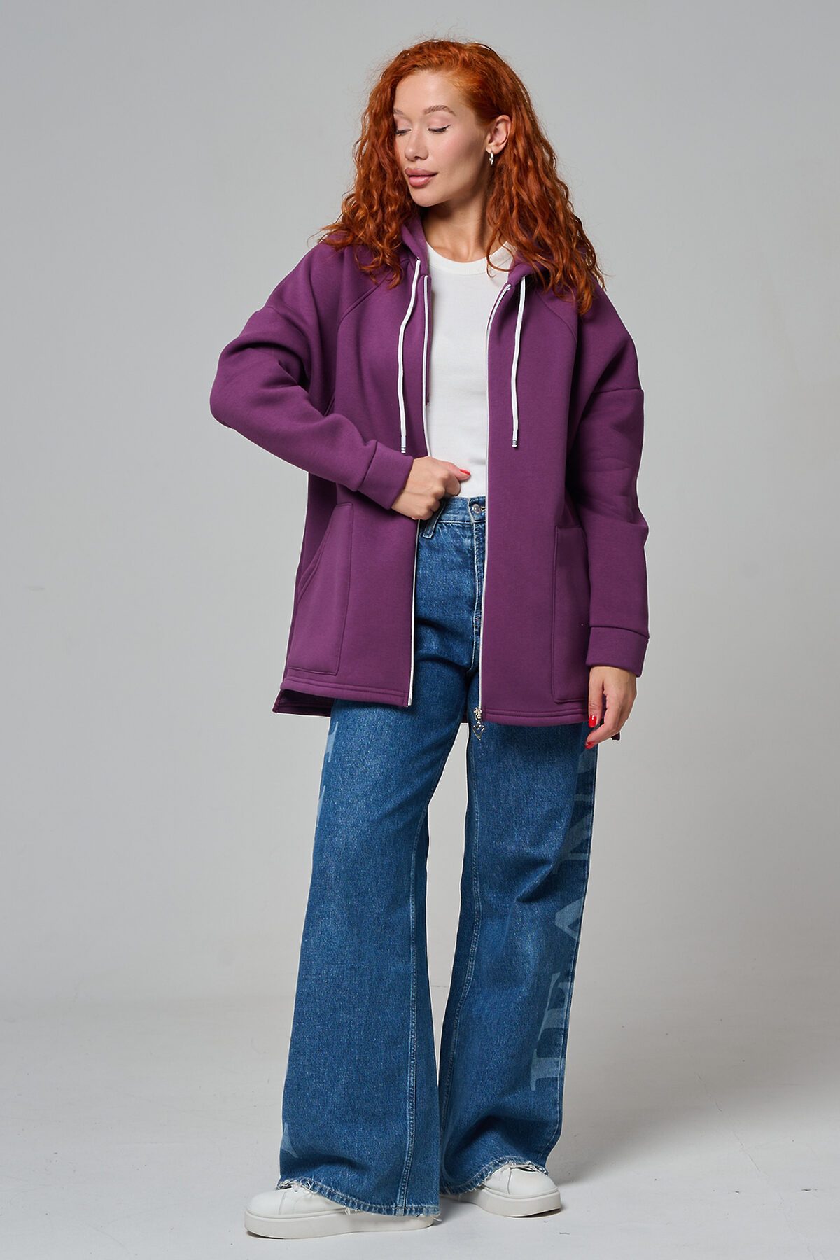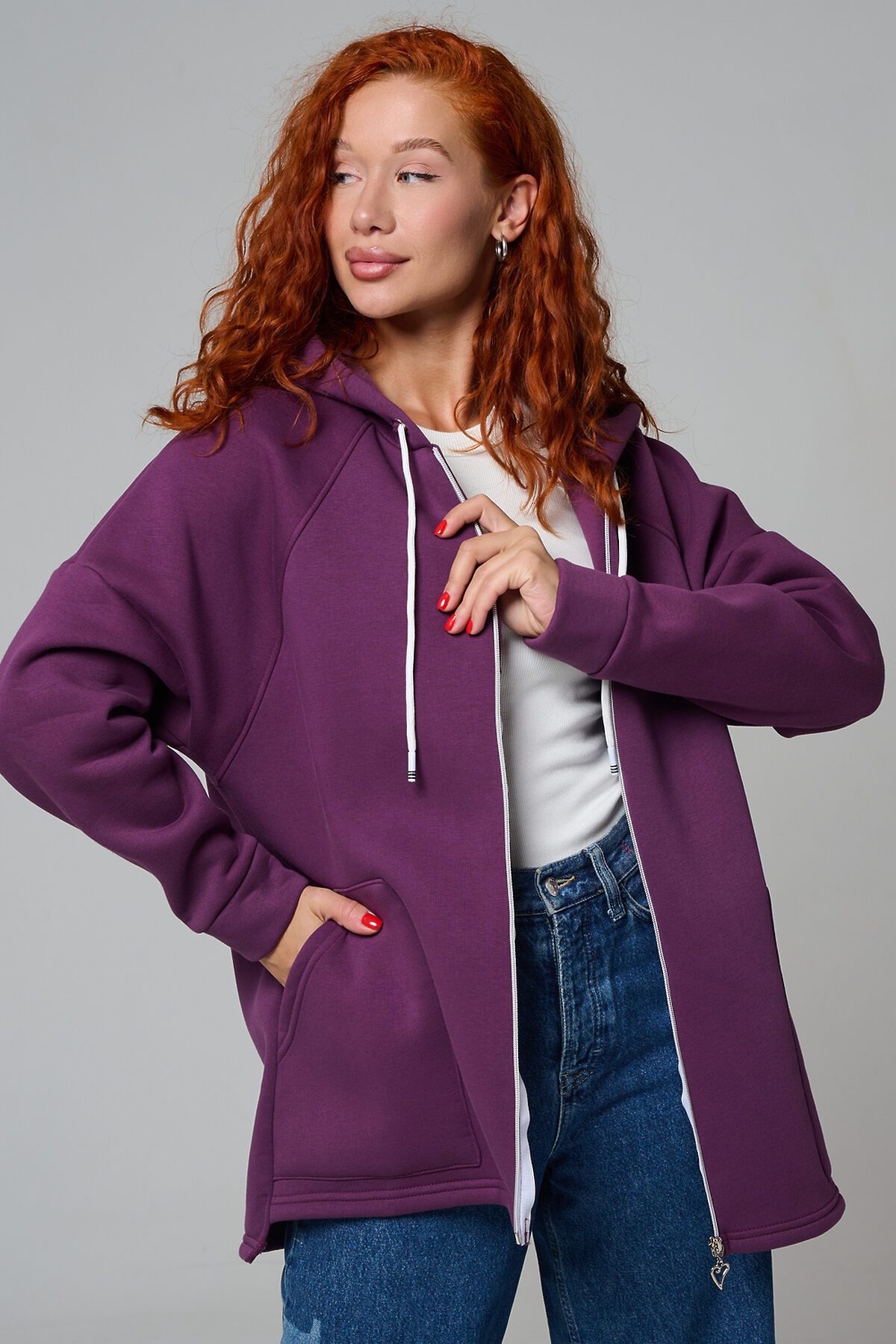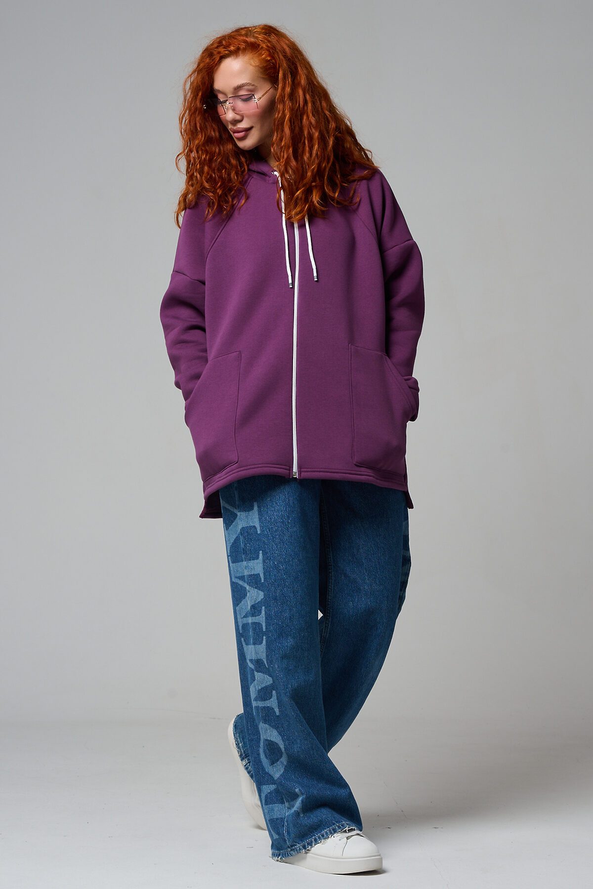 Толстовка утепленная, прямая, свободная, на молнии, с удлиненной спинкой, с капюшоном. Рукав длинный, на эластичном манжете. Полочка и спинка с фигурными кокетками. В нижней части полочки расположены удобные накладные карманы.