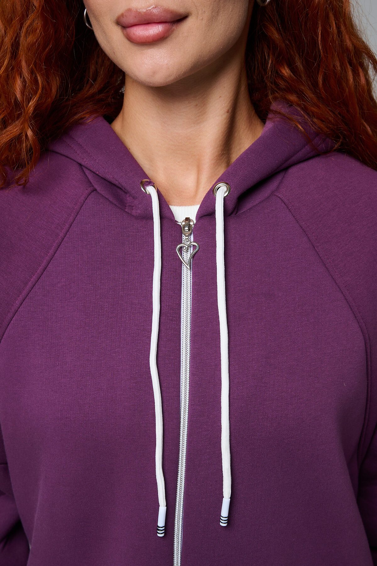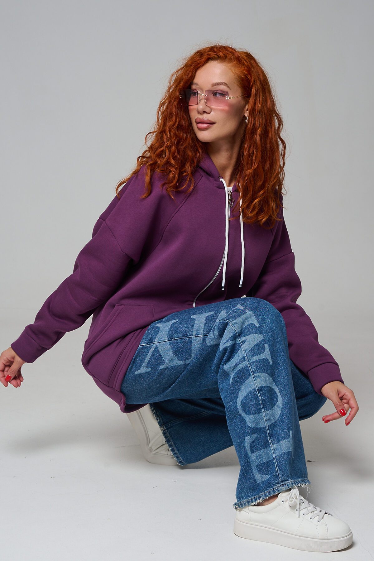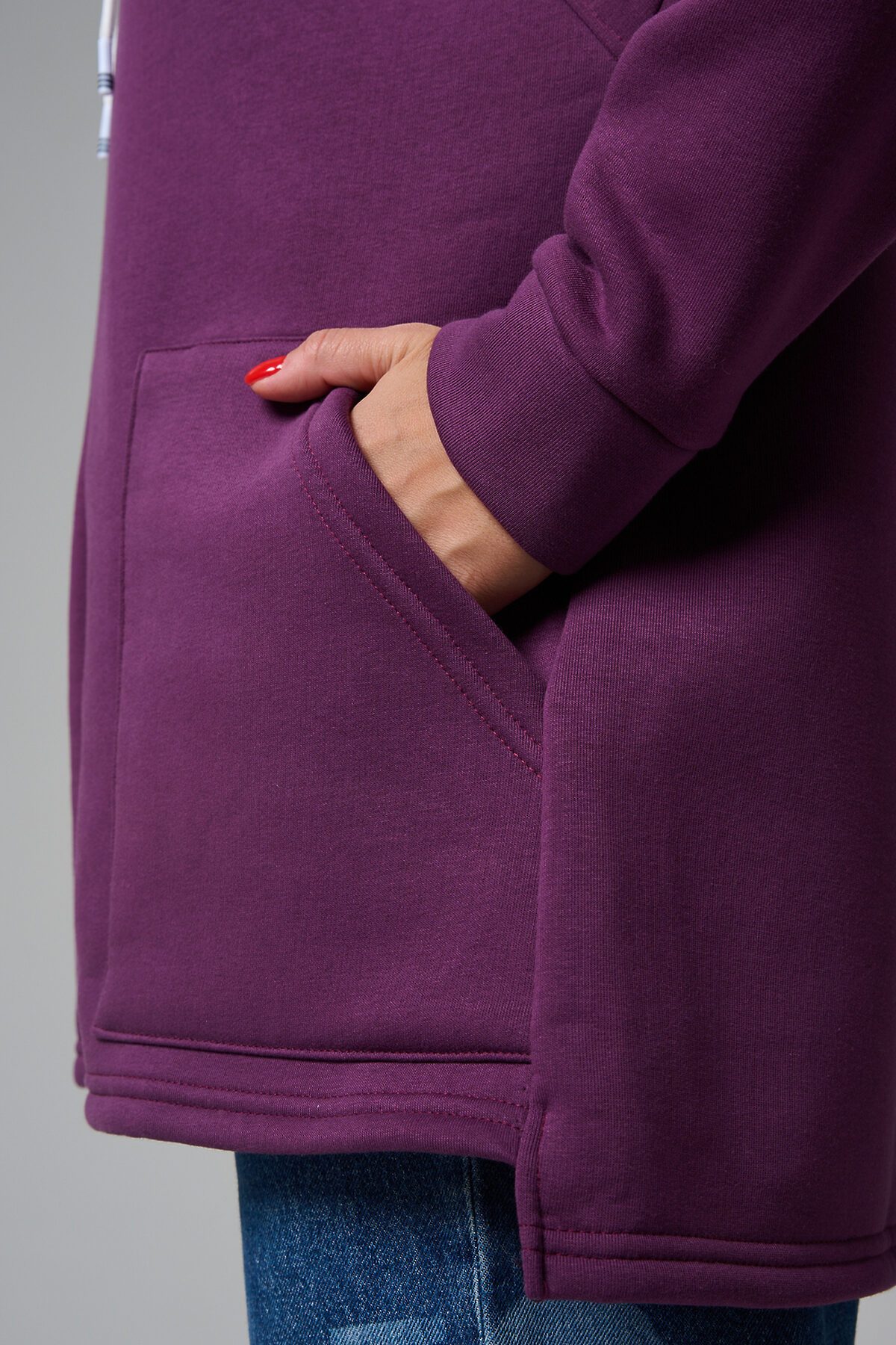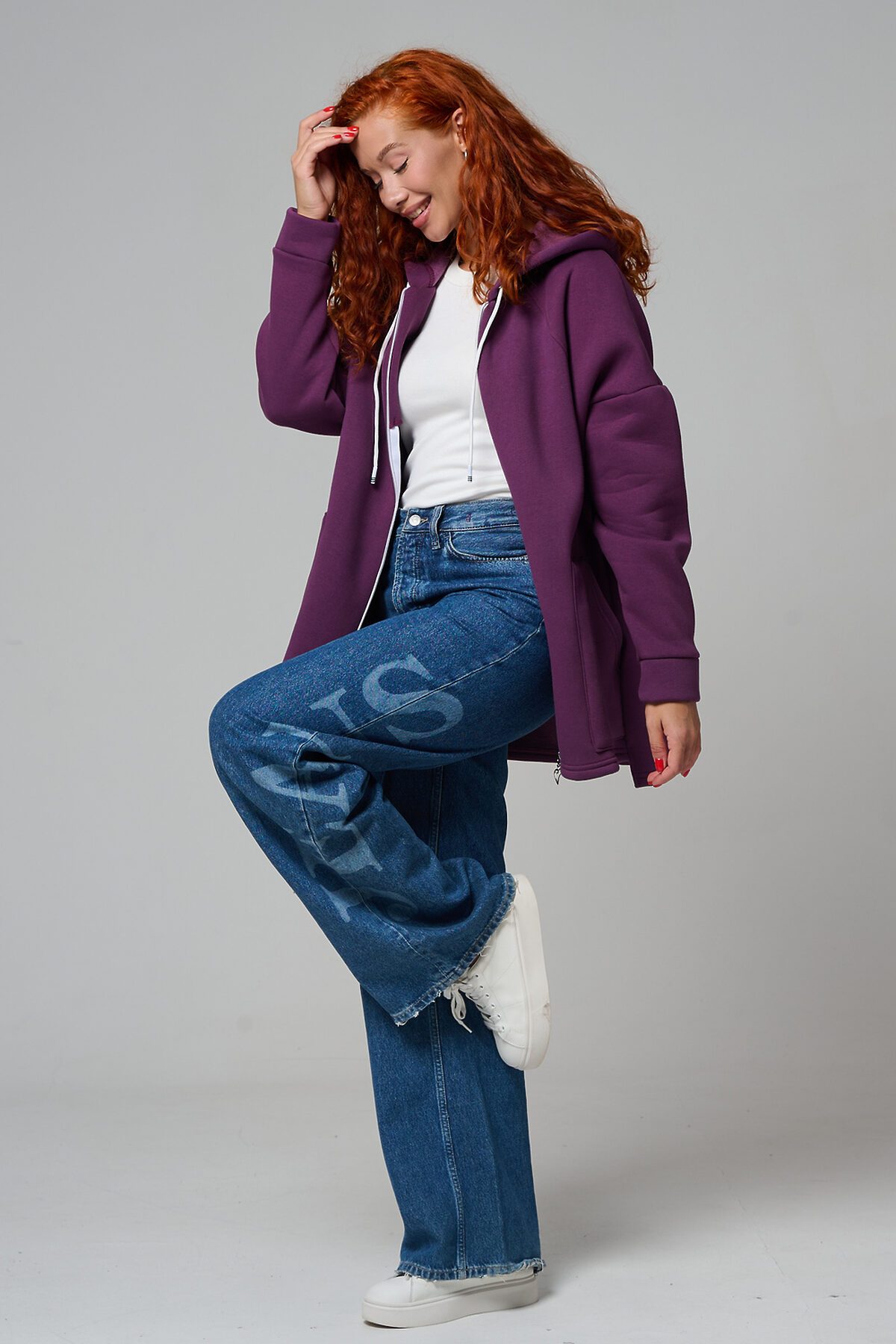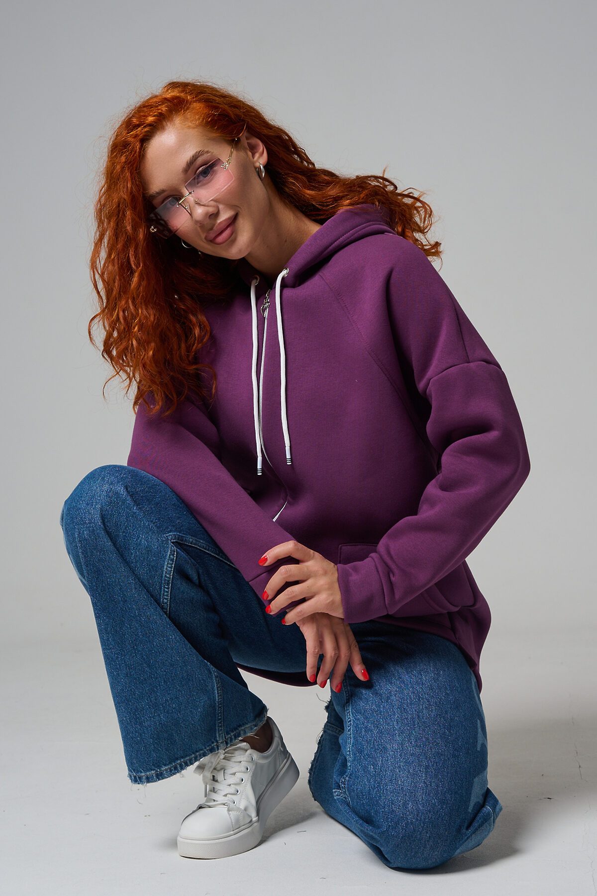 Толстовка утепленная, прямая, свободная, на молнии, с удлиненной спинкой, с капюшоном. Рукав длинный, на эластичном манжете. Полочка и спинка с фигурными кокетками. В нижней части полочки расположены удобные накладные карманы.