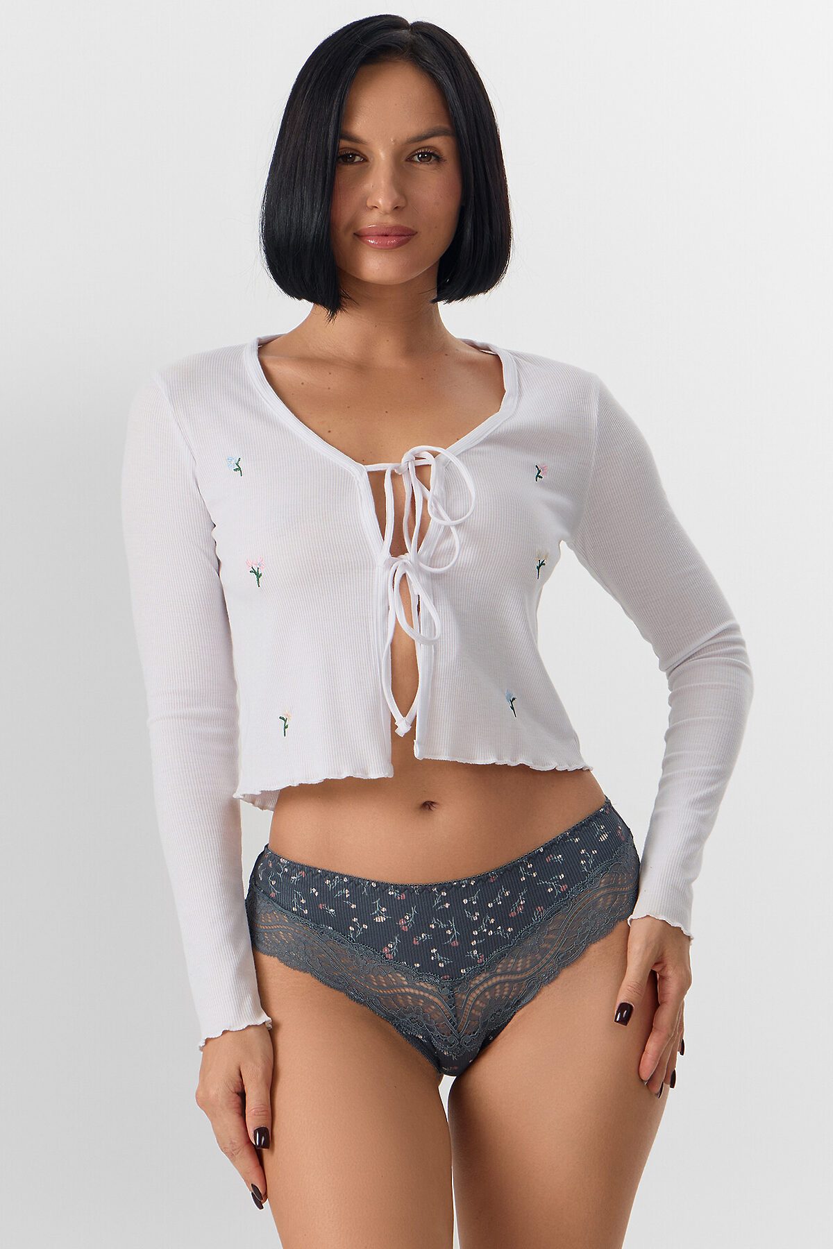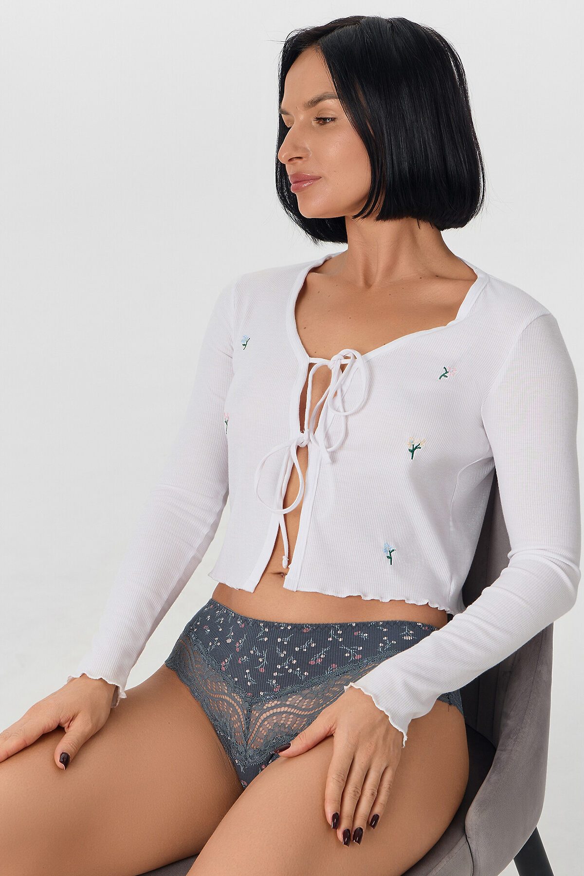 Трусы женские силуэта слип со средней посадкой из рибаны. По талии эластичная тесьма с зубом настрочена на 4-укольном зигзаге. Ножки обработаны узким кружевом шириной, на передней и задней частях со средним швом. Подкладка ластовицы из кулирной глади. Срезы ластовицы обработаны эластичной тесьмой с зубом на п/ш с изнаночной стороны.