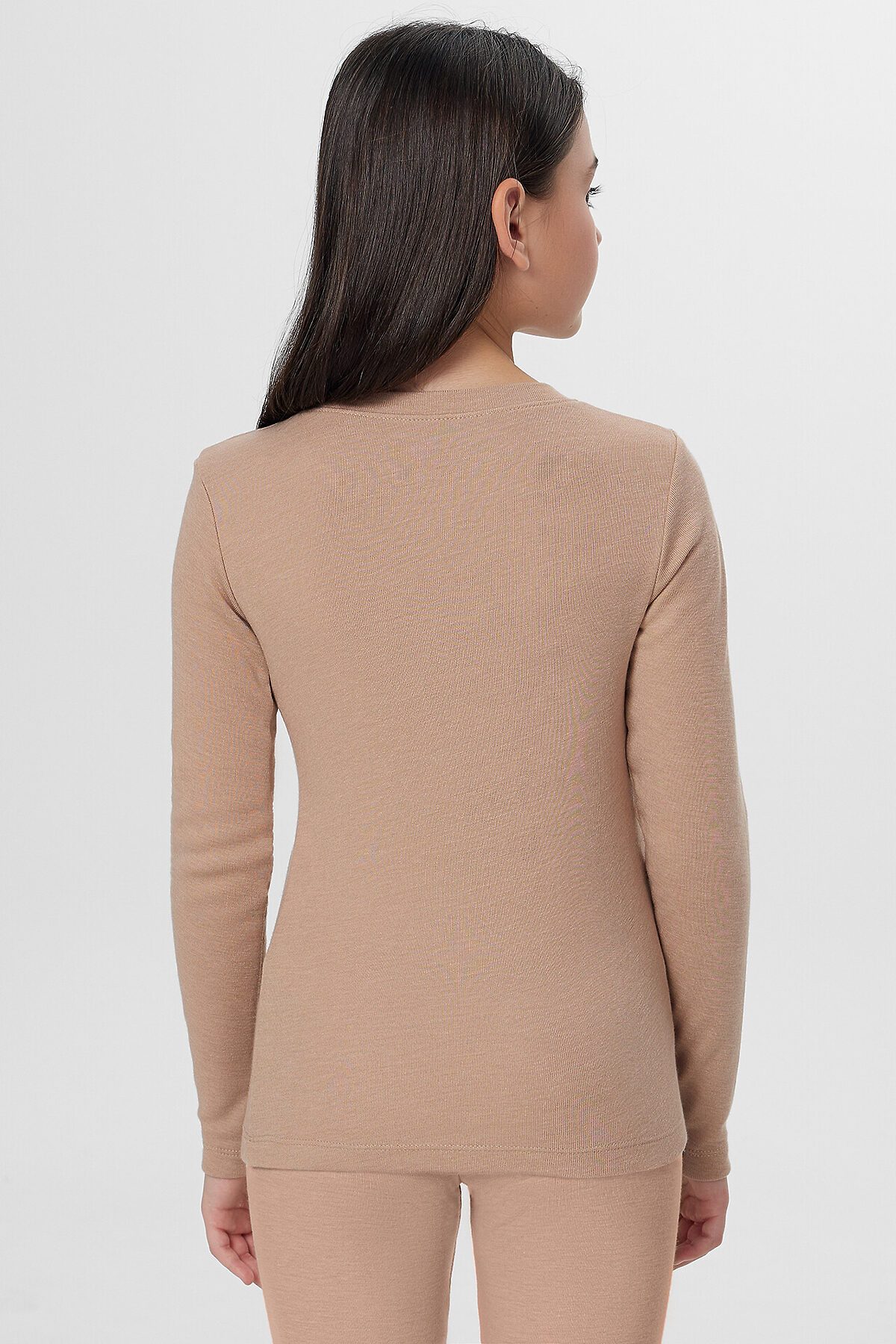 Джемпер "термо" для девочек прилегающего силуэта, длиной до линии бедер. Рукав втачной длинный. Горловина округлой формы, с обтачкой из основного полотна. По шву втачивания обтачки проложена отделочная строчка. Низ джемпера и рукавов обработан швом вподгибку на 2х игольной плоскошовной машине.