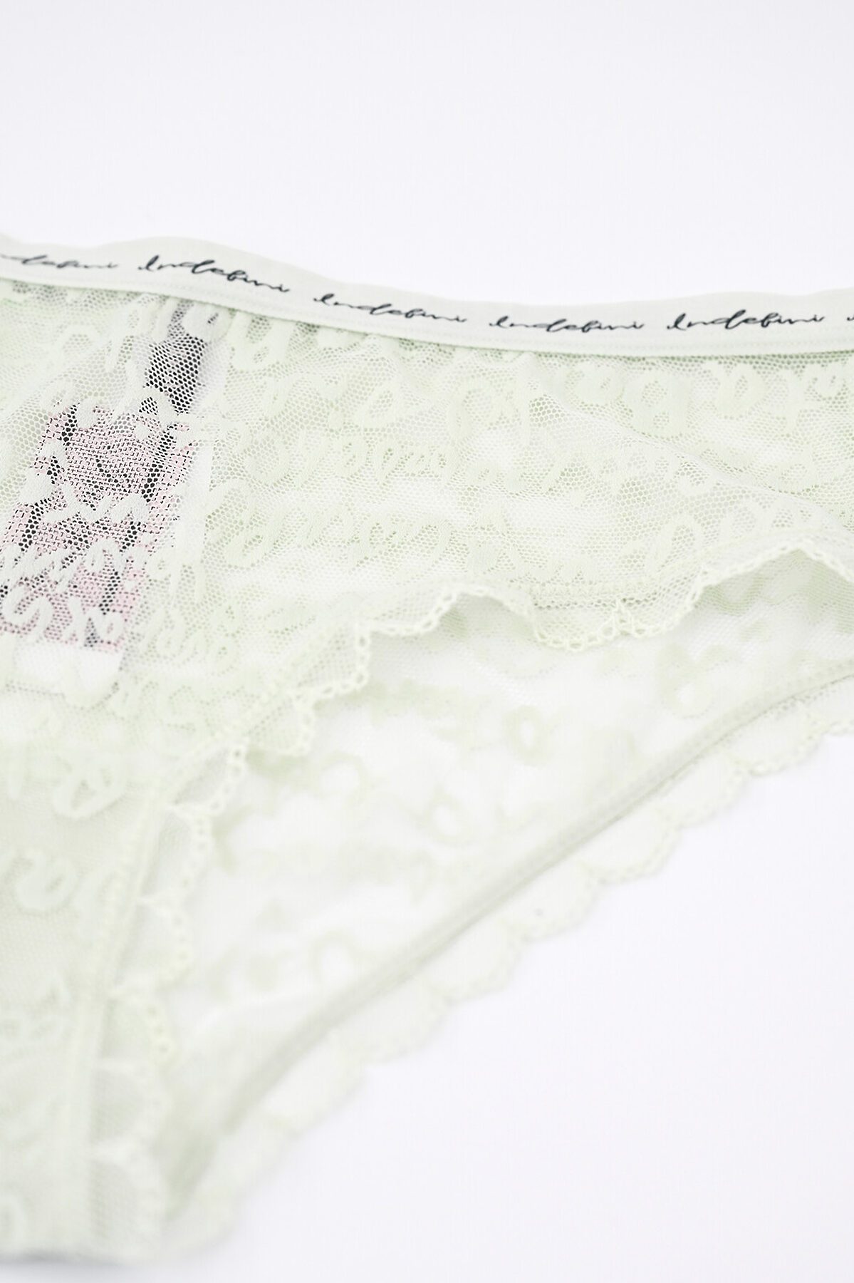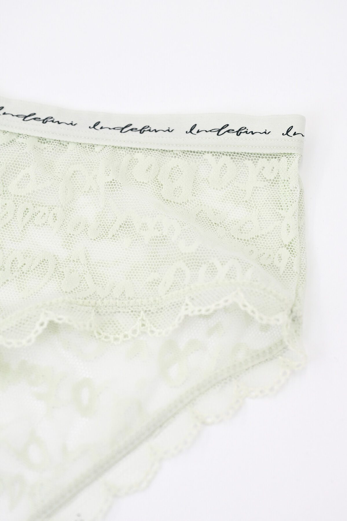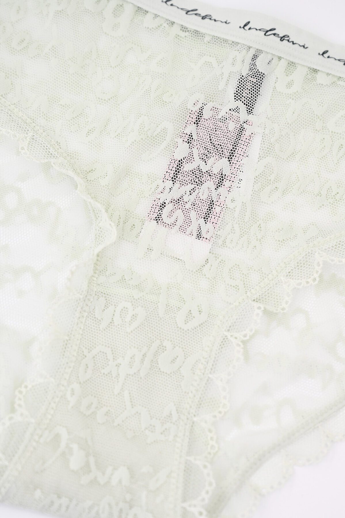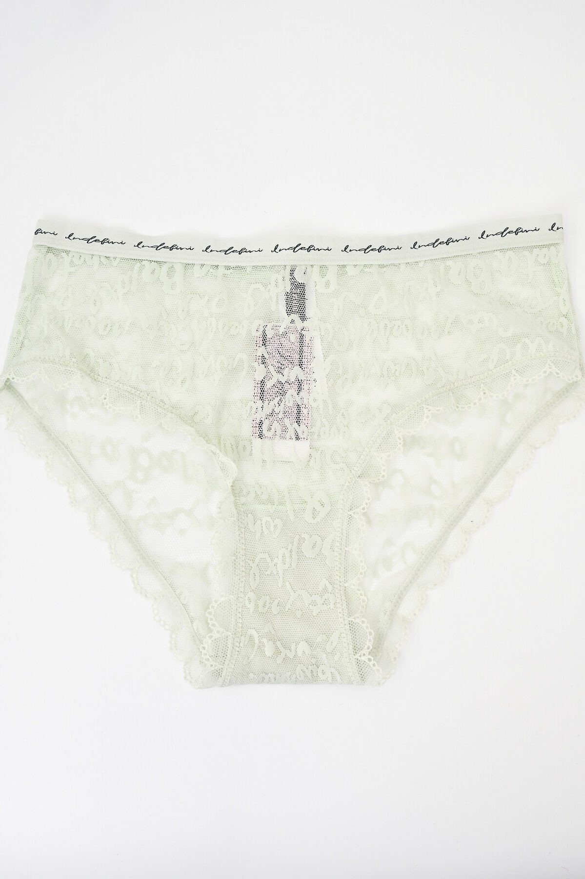 Трусы кружевные женские Indefini (Арт. 1299LUS) изготовлены из смеси полиамида и эластана. Выполнены в салатовом цвете с оригинальным текстовым принтом по всей поверхности. Модель средней посадки держится на талии мягкой резинкой с повторяющимся логотипом бренда Indefini. По краю трусов проходит декоративная кружевная отделка. На внутренней стороне трусов имеется хлопковая ластовица. Идеально подходят для ежедневного ношения, обеспечивая легкость и комфортную посадку.