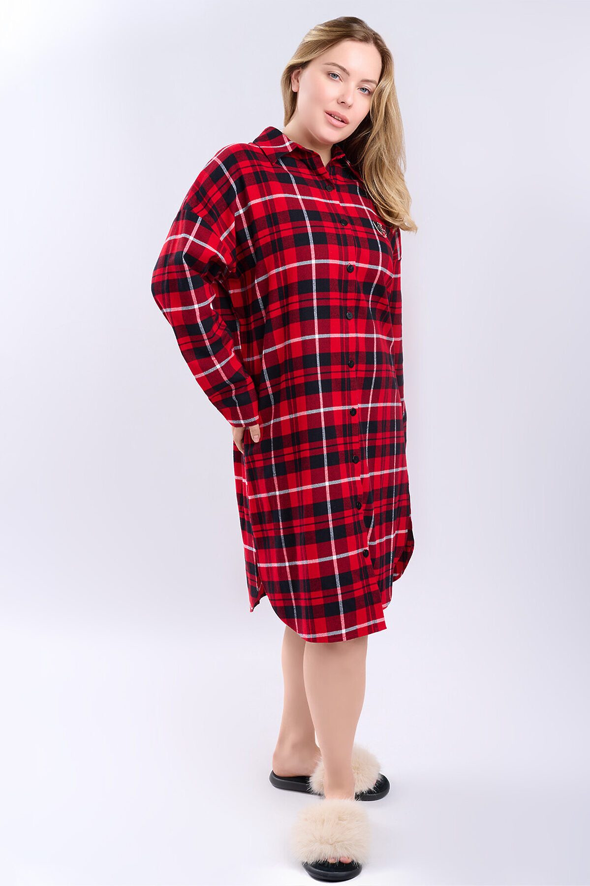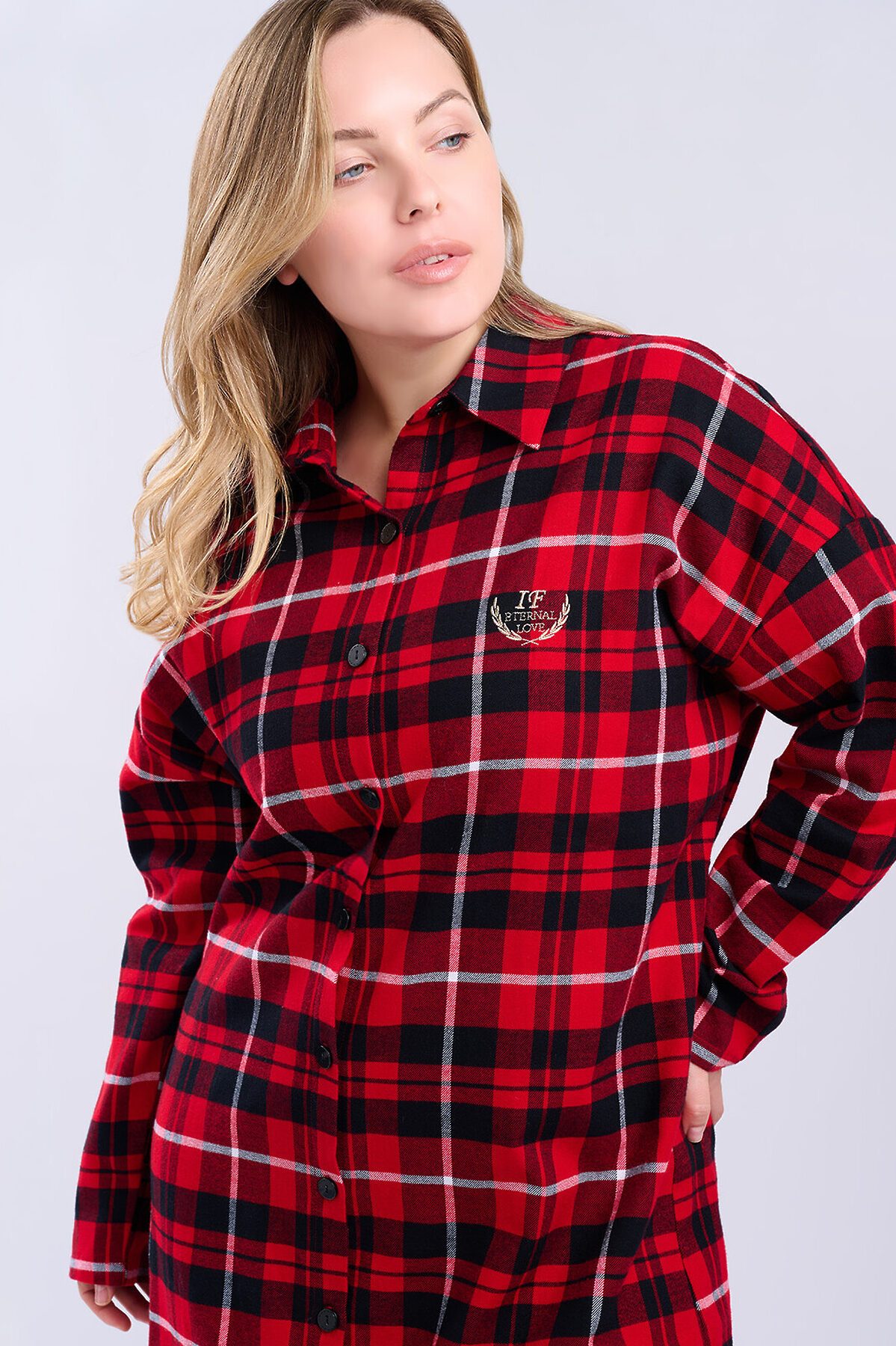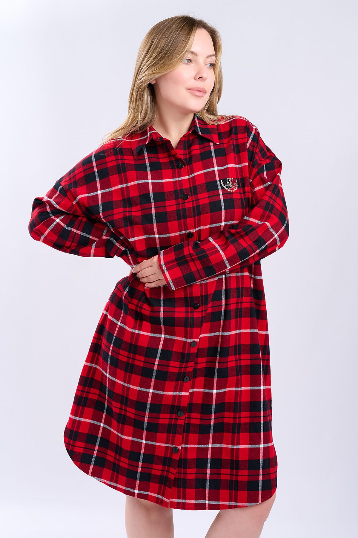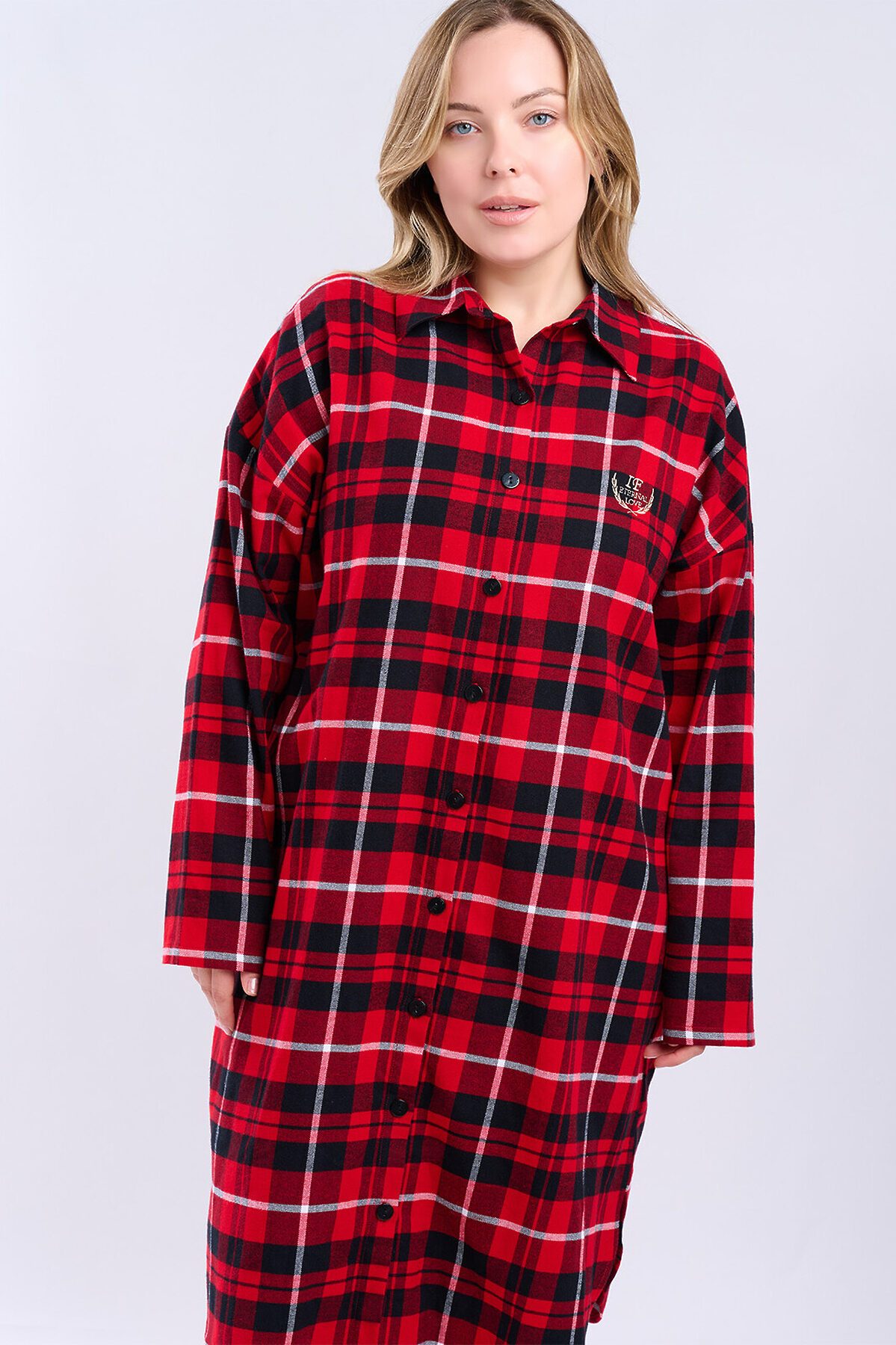 Сорочка женская 5200SDX бренда Indefini изготовлена из хлопка. Сорочка в красно-черную клетку, свободного кроя с длинными рукавами и отложным воротником. Спереди застегивается на пуговицы, на груди расположен накладной карман с вышитой фразой «Eternal Love». Нижний край сорочки асимметричный, с разрезами по бокам, что обеспечивает комфорт и свободу движений. Идеально подходит для домашнего отдыха и сна, создавая ощущение уюта и тепла. Параметры модели на фото: 83-60-89 Рост модели на фото: 173 см Размер изделия на модели: S PLUS SIZE: Параметры модели на фото: 101-74-110 Рост модели на фото: 166 см Размер изделия на модели: L