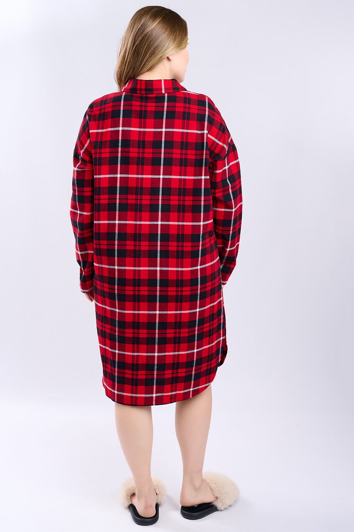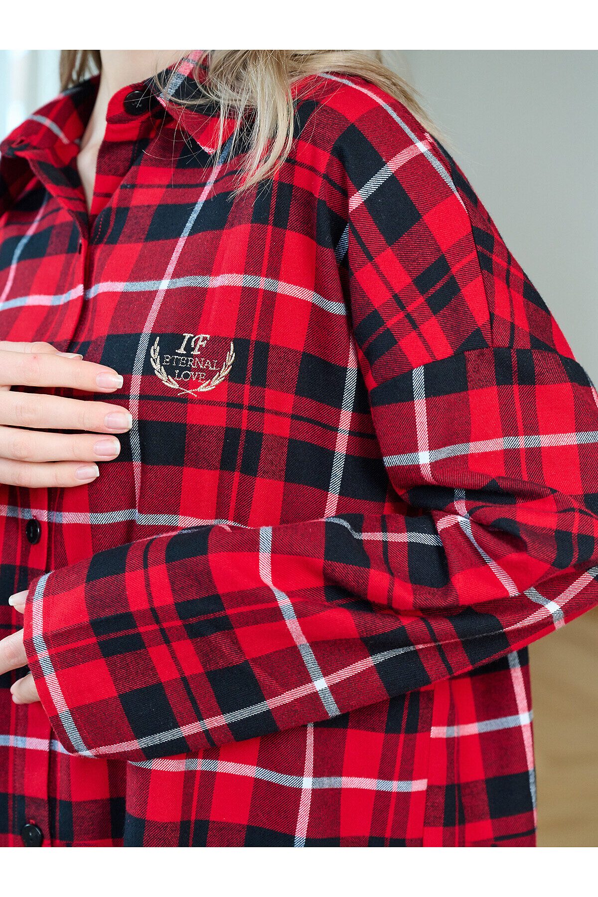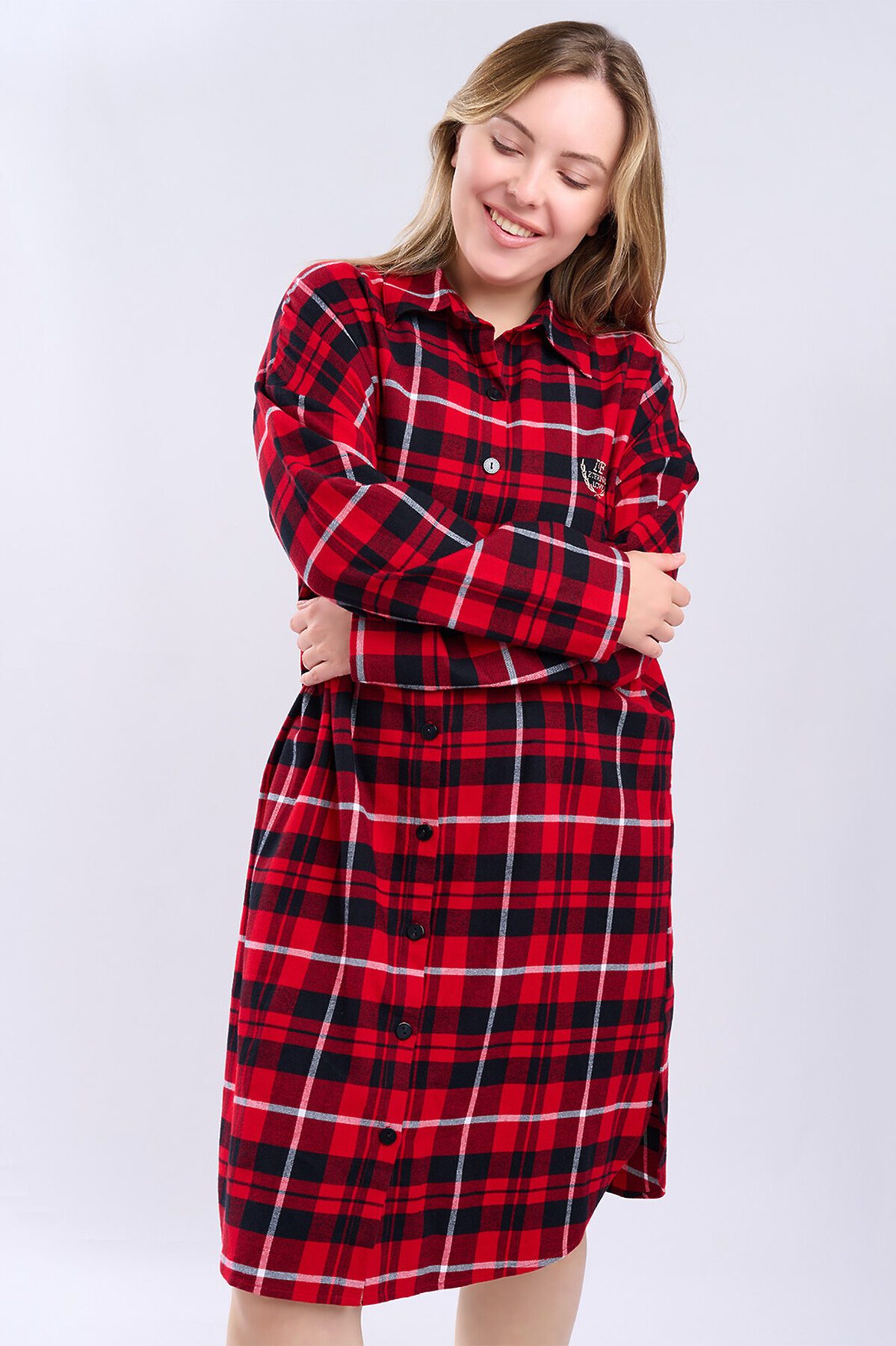 Сорочка женская 5200SDX бренда Indefini изготовлена из хлопка. Сорочка в красно-черную клетку, свободного кроя с длинными рукавами и отложным воротником. Спереди застегивается на пуговицы, на груди расположен накладной карман с вышитой фразой «Eternal Love». Нижний край сорочки асимметричный, с разрезами по бокам, что обеспечивает комфорт и свободу движений. Идеально подходит для домашнего отдыха и сна, создавая ощущение уюта и тепла. Параметры модели на фото: 83-60-89 Рост модели на фото: 173 см Размер изделия на модели: S PLUS SIZE: Параметры модели на фото: 101-74-110 Рост модели на фото: 166 см Размер изделия на модели: L