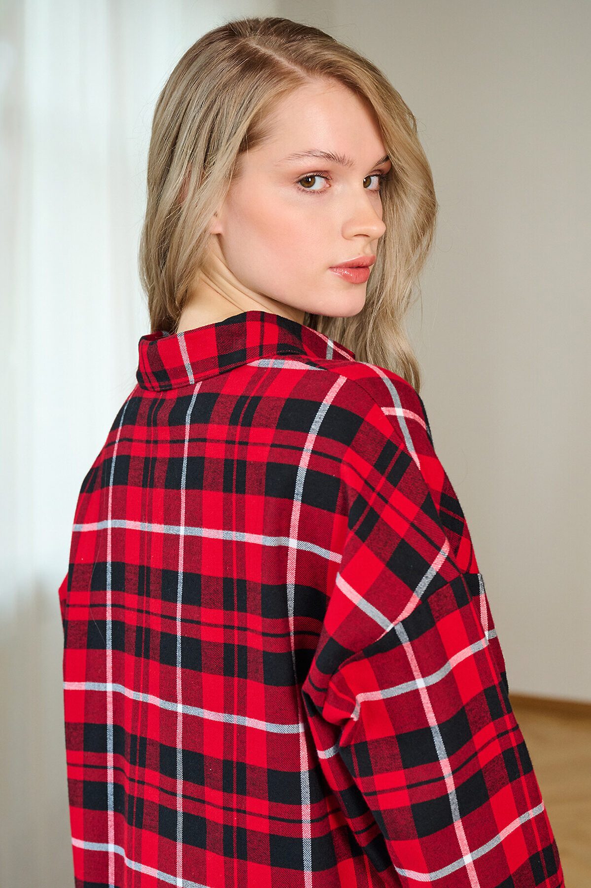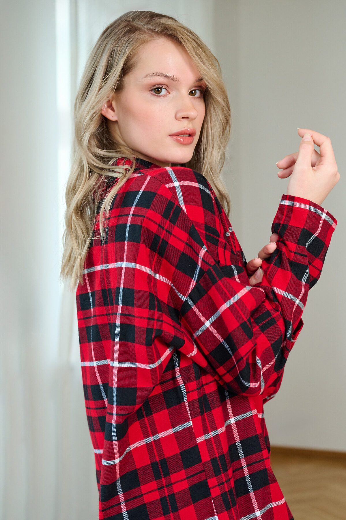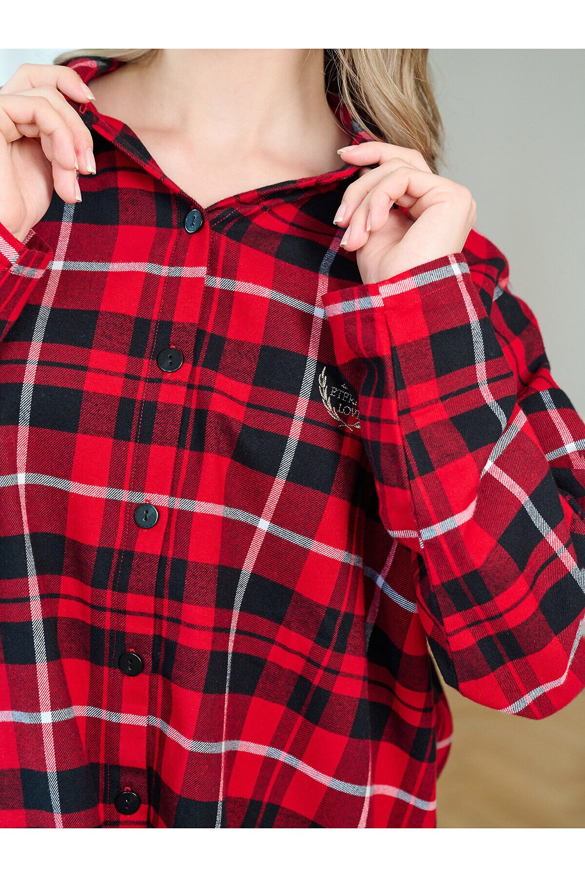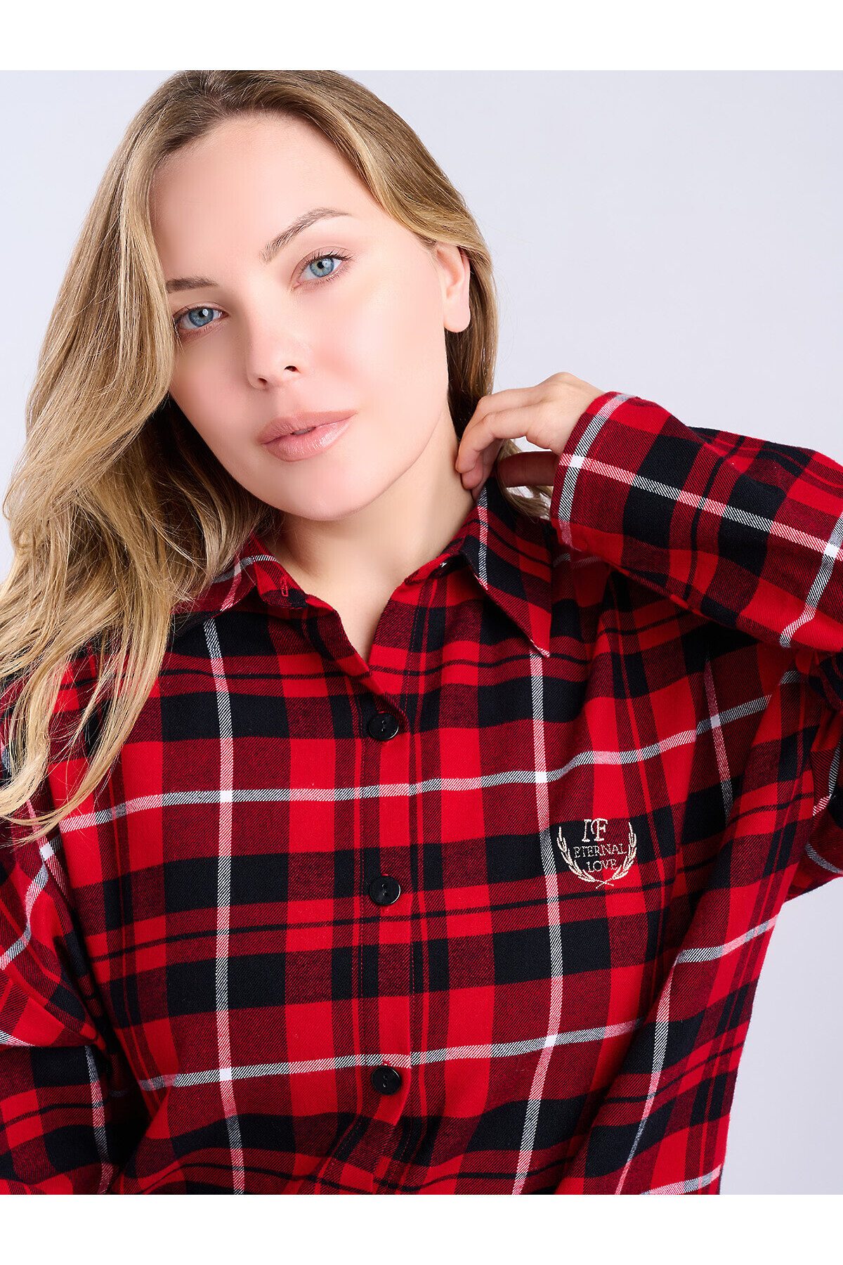 Сорочка женская 5200SDX бренда Indefini изготовлена из хлопка. Сорочка в красно-черную клетку, свободного кроя с длинными рукавами и отложным воротником. Спереди застегивается на пуговицы, на груди расположен накладной карман с вышитой фразой «Eternal Love». Нижний край сорочки асимметричный, с разрезами по бокам, что обеспечивает комфорт и свободу движений. Идеально подходит для домашнего отдыха и сна, создавая ощущение уюта и тепла. Параметры модели на фото: 83-60-89 Рост модели на фото: 173 см Размер изделия на модели: S PLUS SIZE: Параметры модели на фото: 101-74-110 Рост модели на фото: 166 см Размер изделия на модели: L
