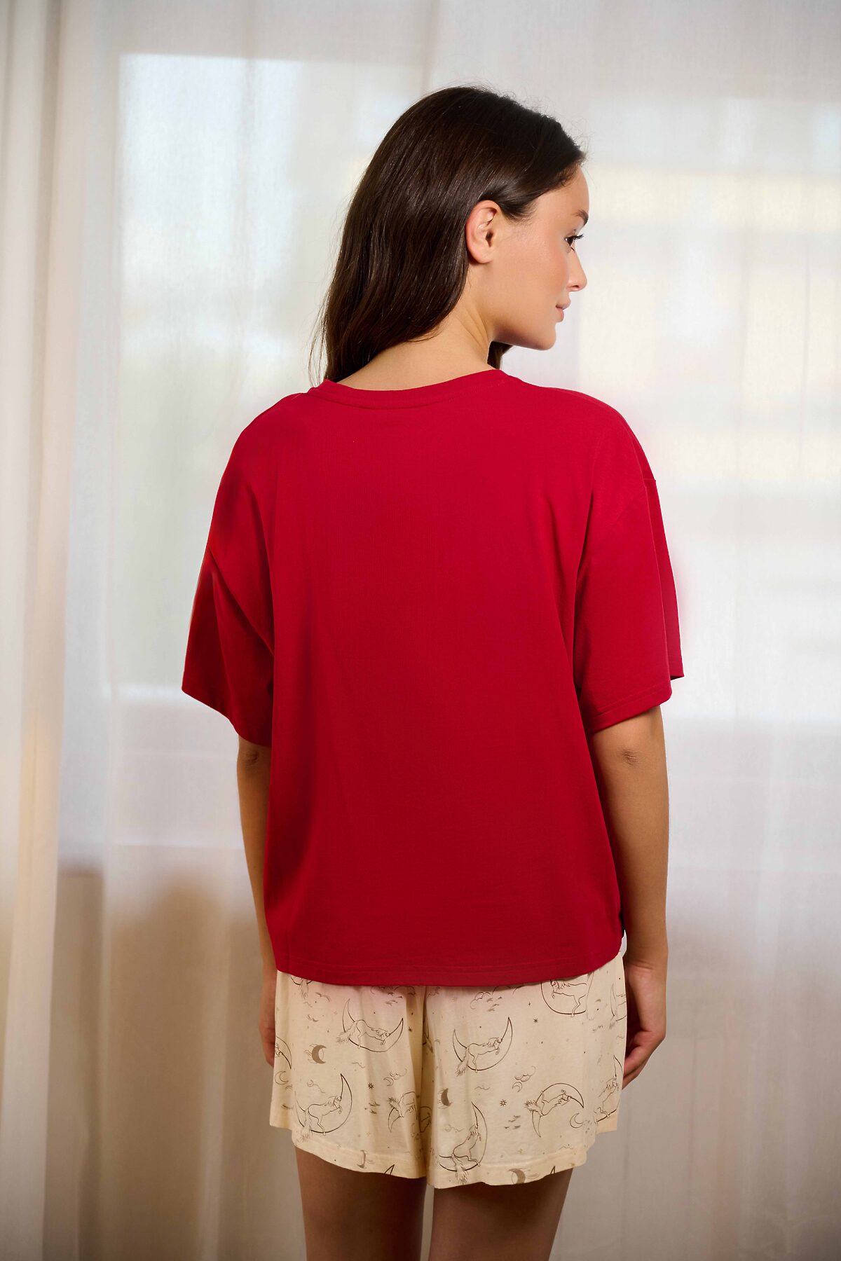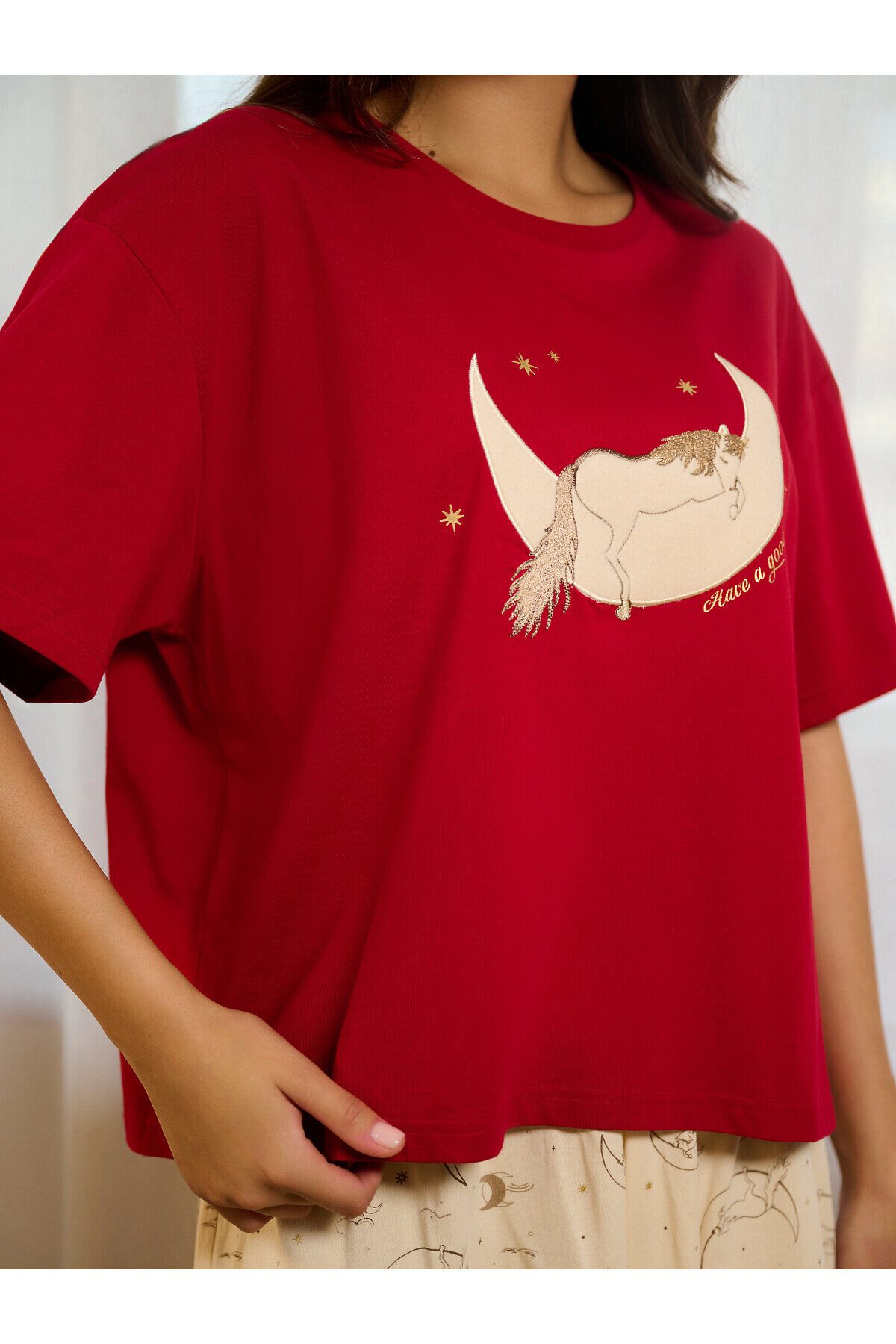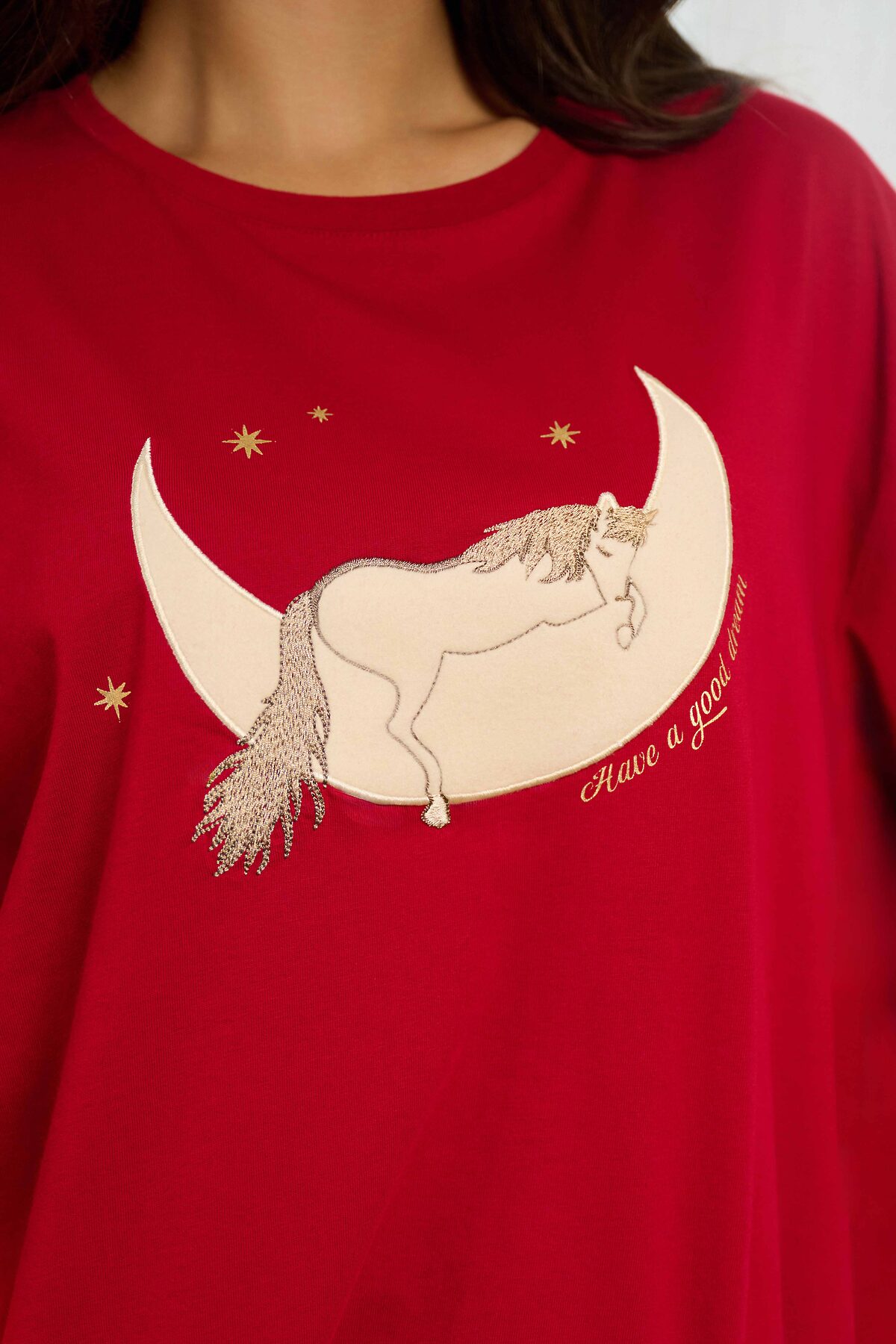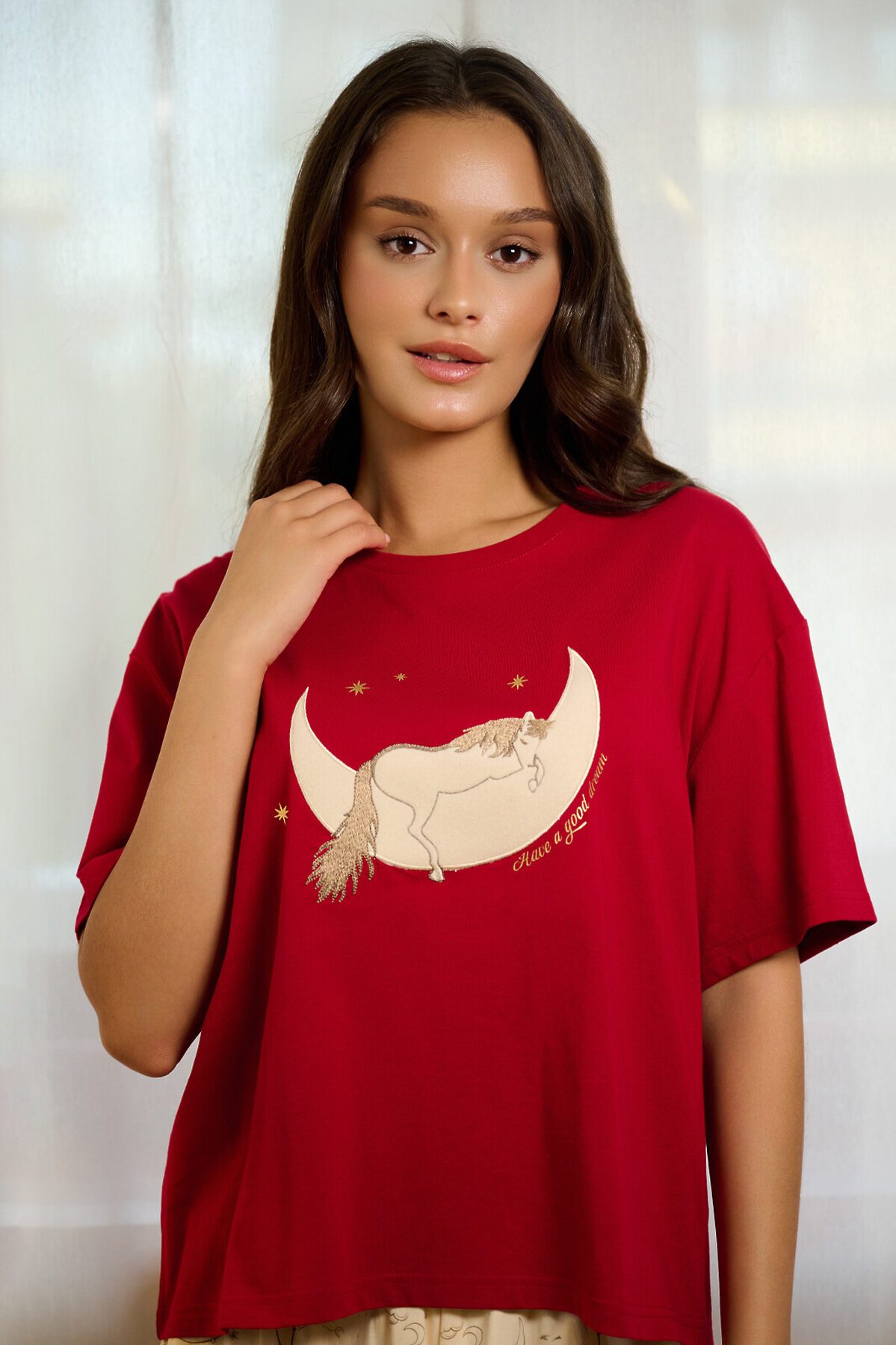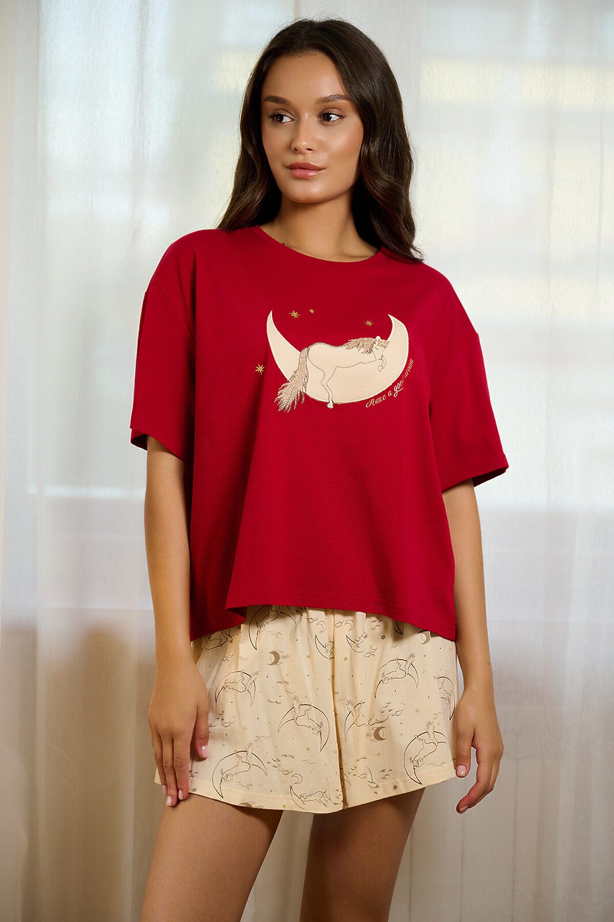 Домашняя пижама (арт. 5203TBD) выполнена из 100% хлопка. В комплект входит красная футболка и бежевые шорты. Футболка свободного кроя, с короткими рукавами и круглым вырезом, украшена крупным принтом с изображением лошади на луне и надписью «Have a good dream». Шорты бежевого цвета, на мягкой резинке, прямого свободного кроя, декорированы нежным принтом с изображением лошади на луне и нашивкой «Free flying» на поясе. Пижама идеально подходит для домашнего отдыха и сна, обеспечивая комфорт и приятные тактильные ощущения. Параметры модели на фото: 88-60-89 Рост модели на фото: 173 см Размер изделия на модели: S