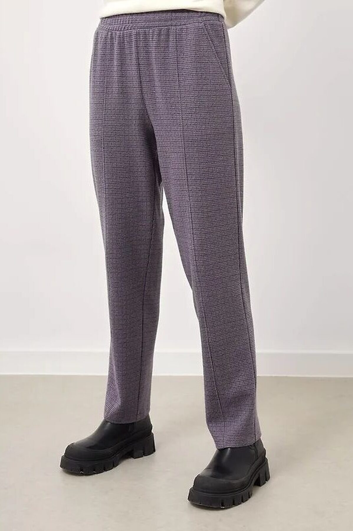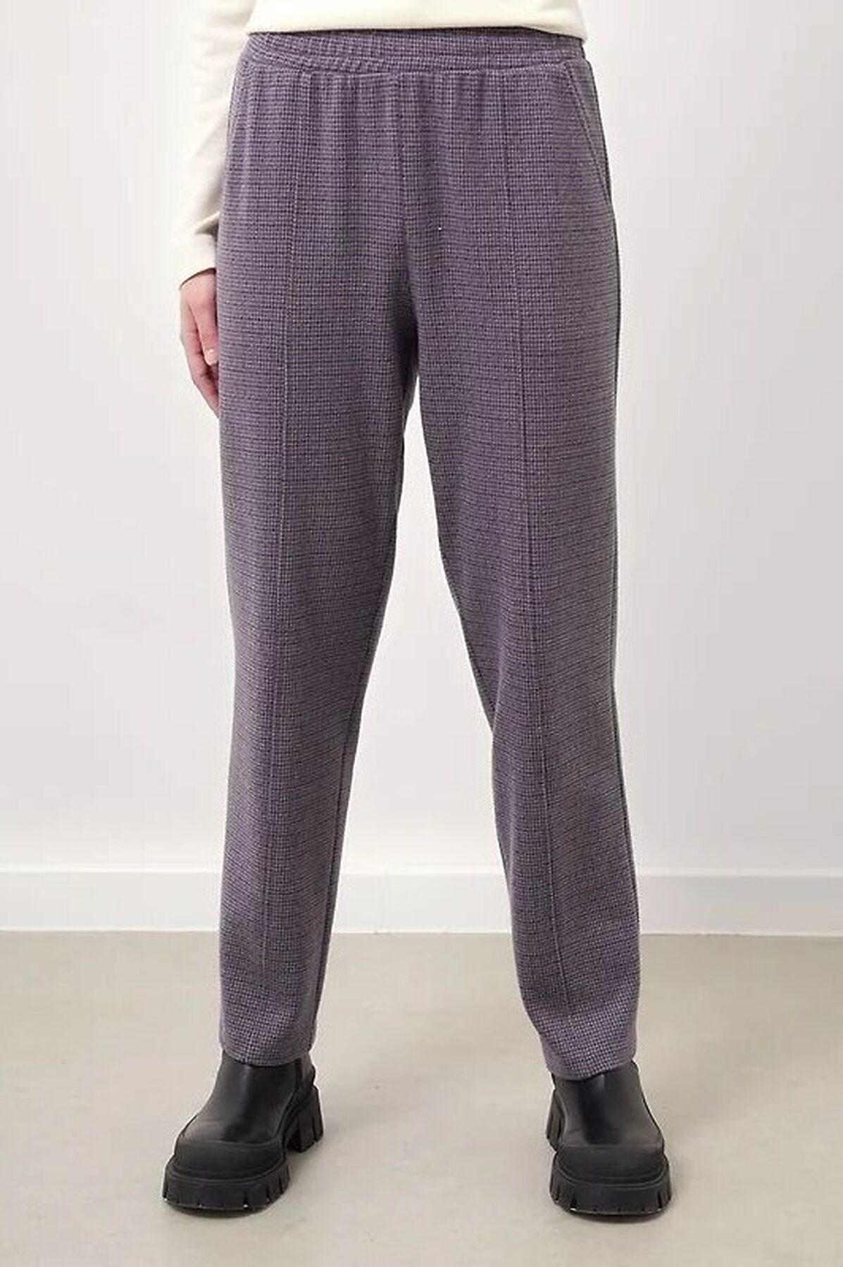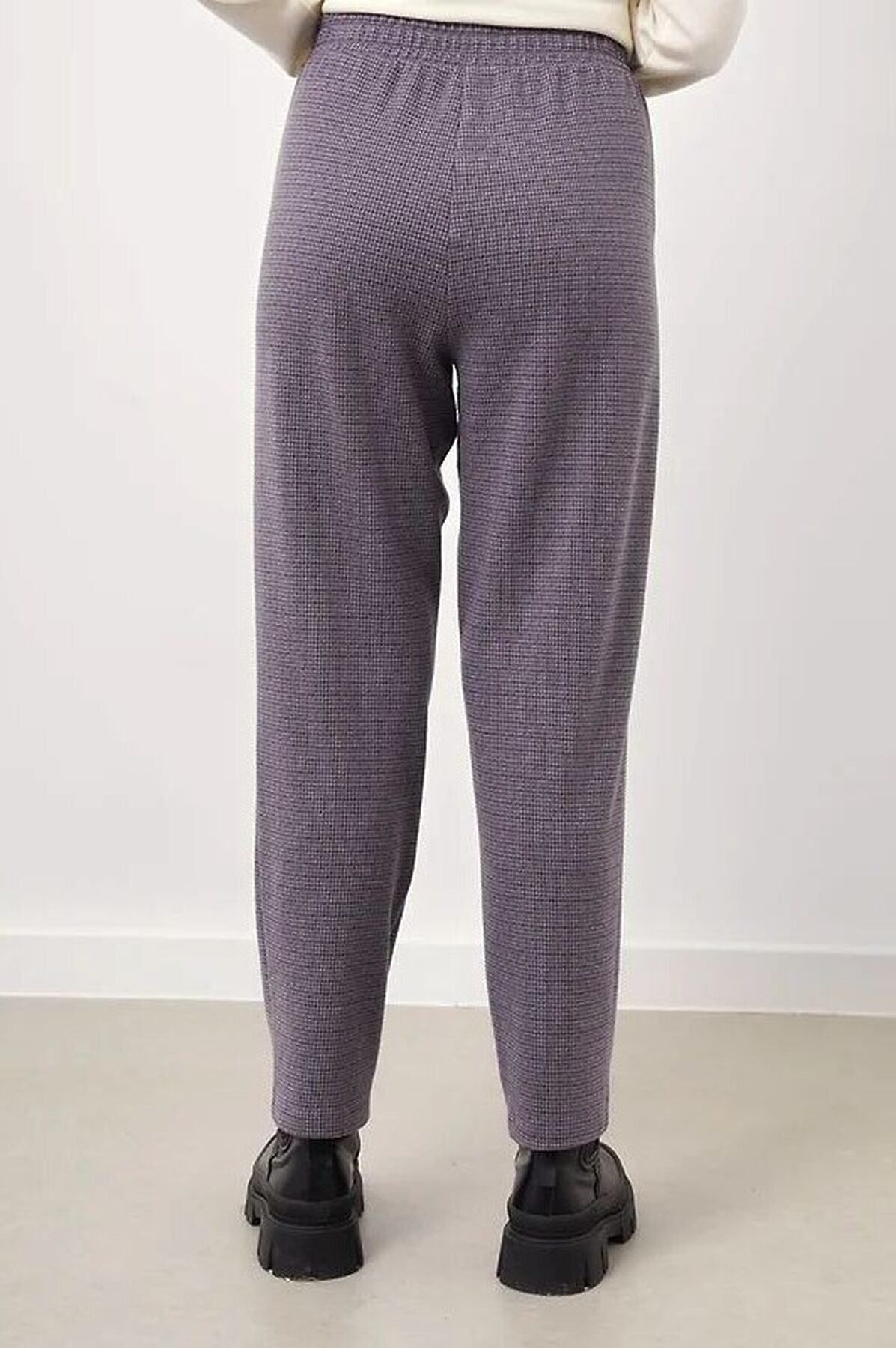 Брюки зауженные из поливискозного трикотажного полотна джерси. По талии пояс на внутренней резинке. Спереди брюк застроченный шов. Боковые карманы с отрезным бочком. По низу брюк потайной стежок.
