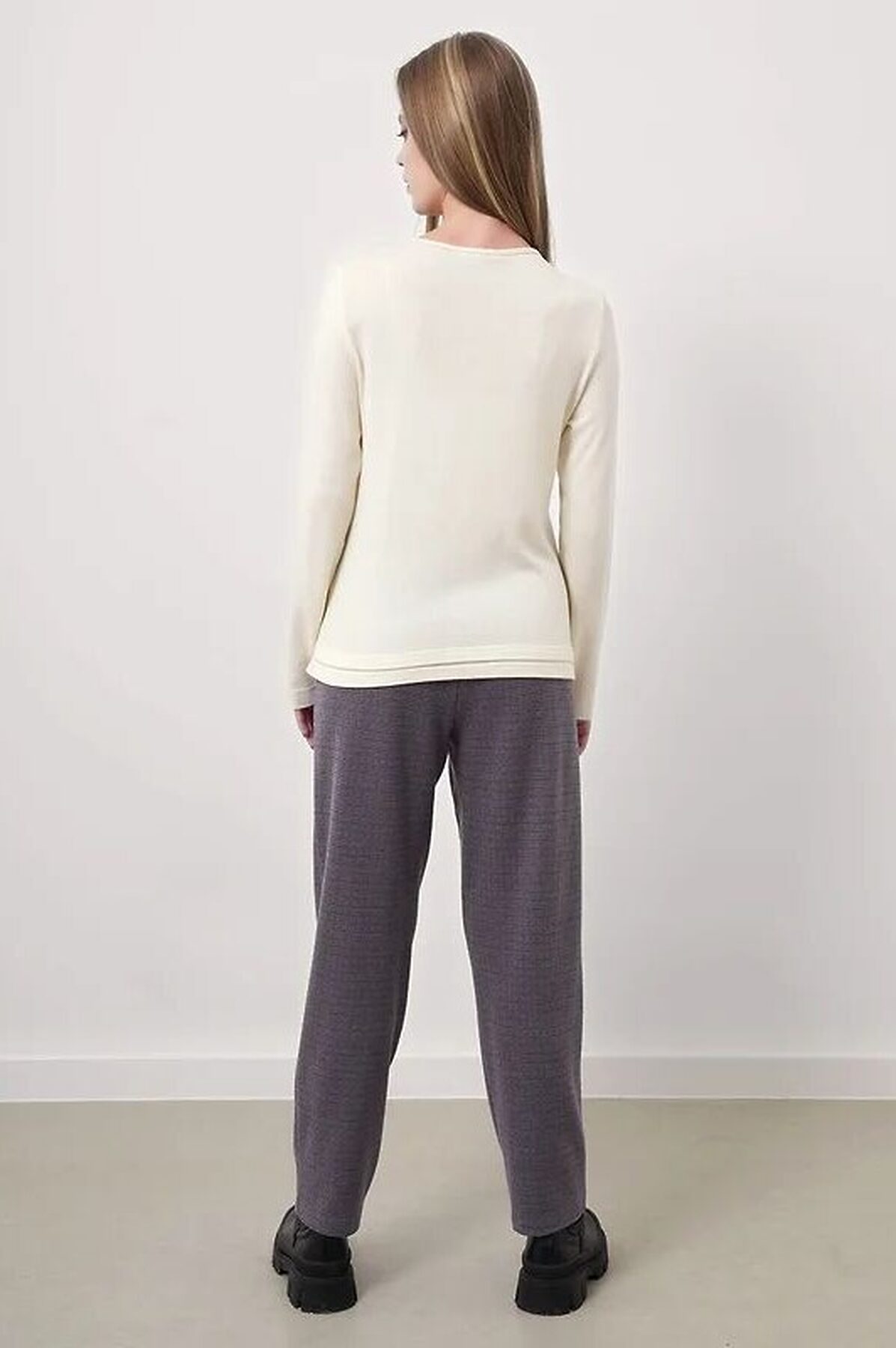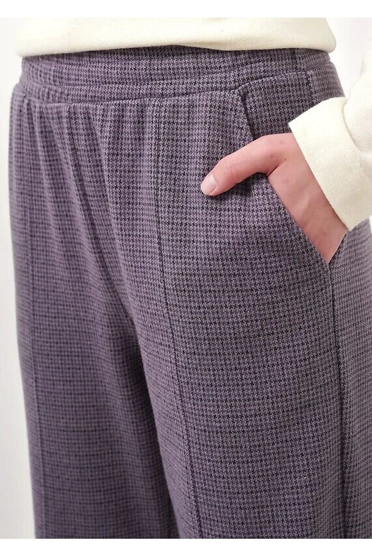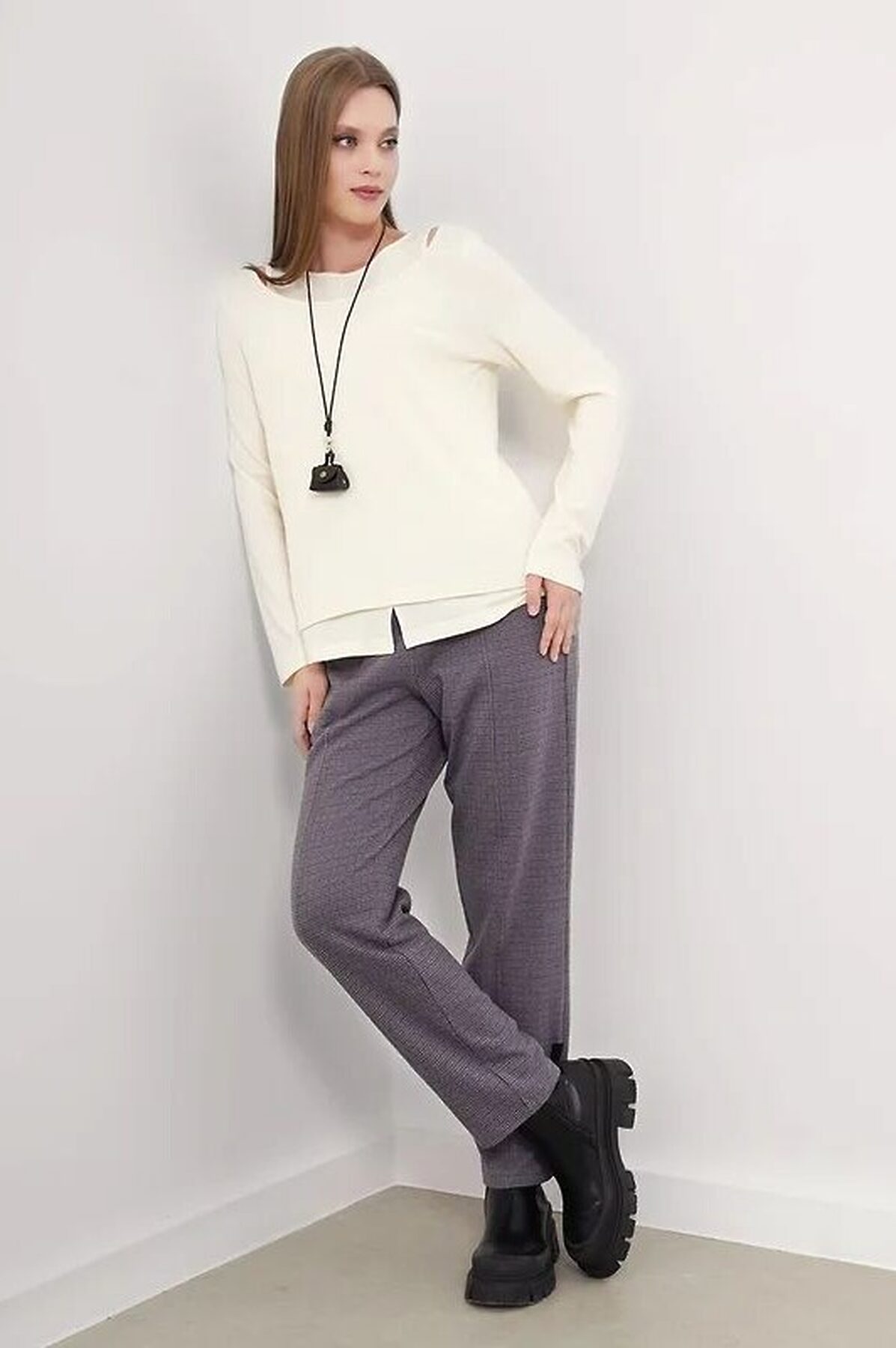 Брюки зауженные из поливискозного трикотажного полотна джерси. По талии пояс на внутренней резинке. Спереди брюк застроченный шов. Боковые карманы с отрезным бочком. По низу брюк потайной стежок.