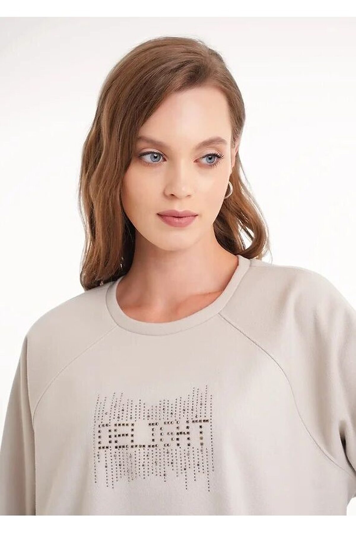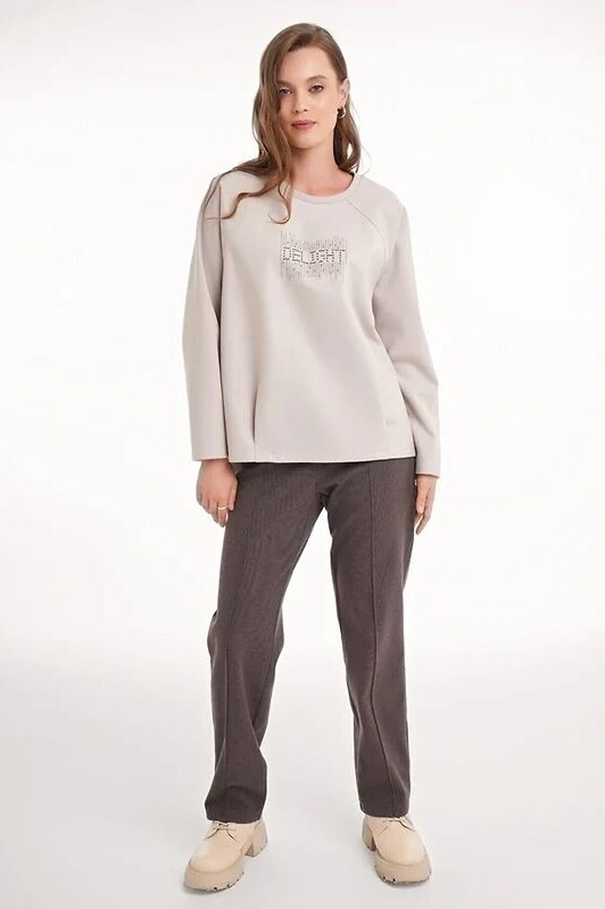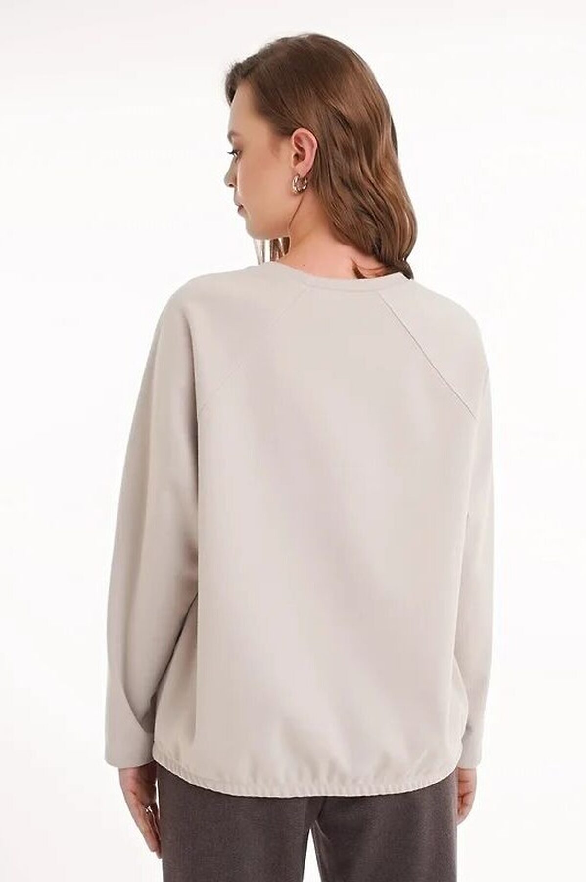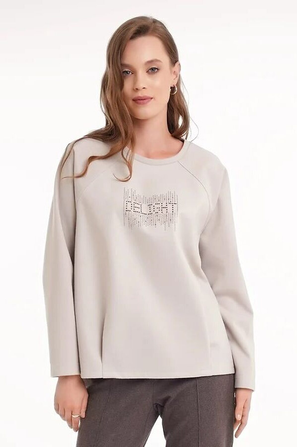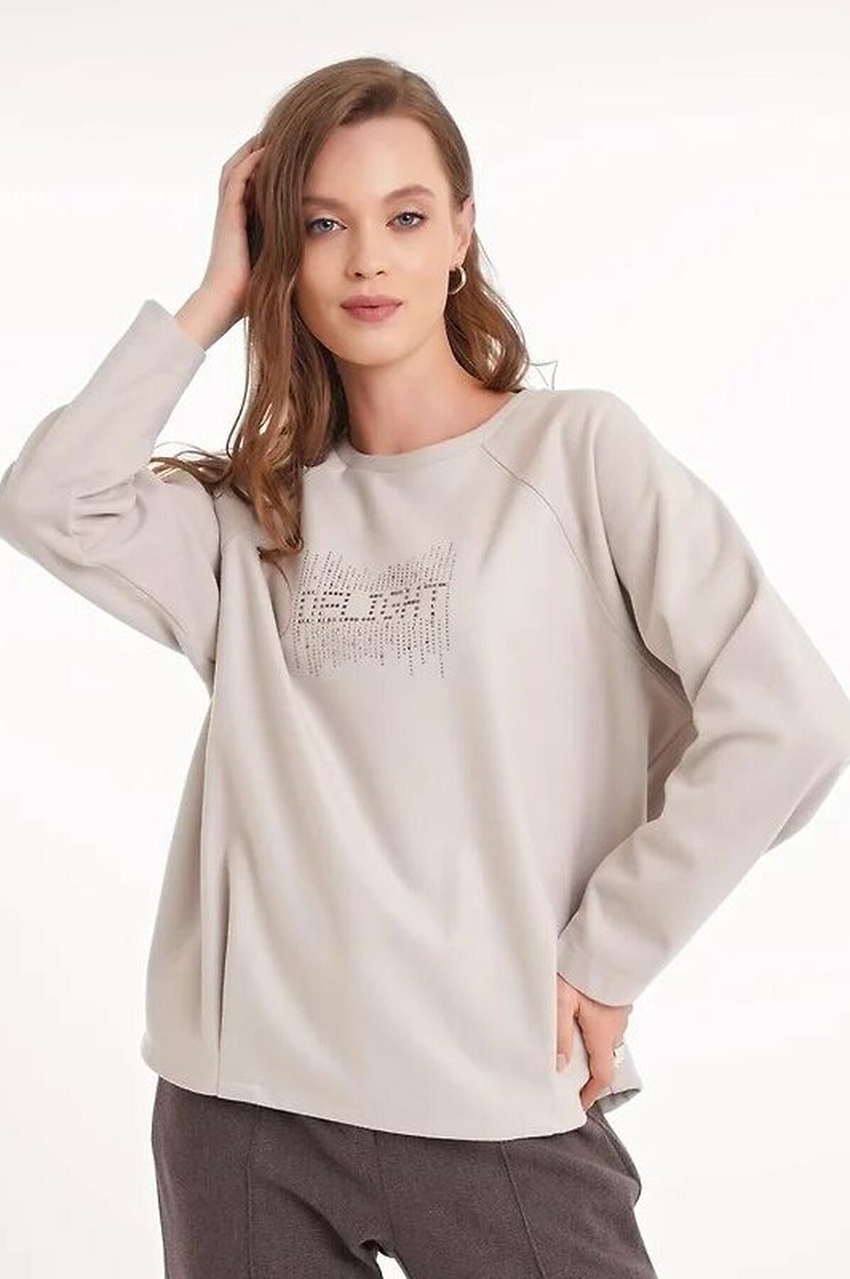 Джемпер объёмный из поливискозного трикотажного полотна джерси. Длинный рукав реглан. Округлая горловина с обтачкой. По низу переда складки,по низу спинки изделия внутренняя резинка. Спереди стразы.