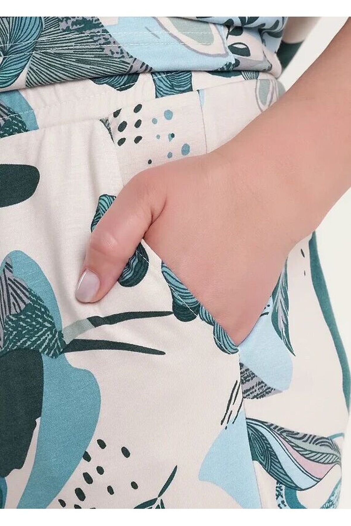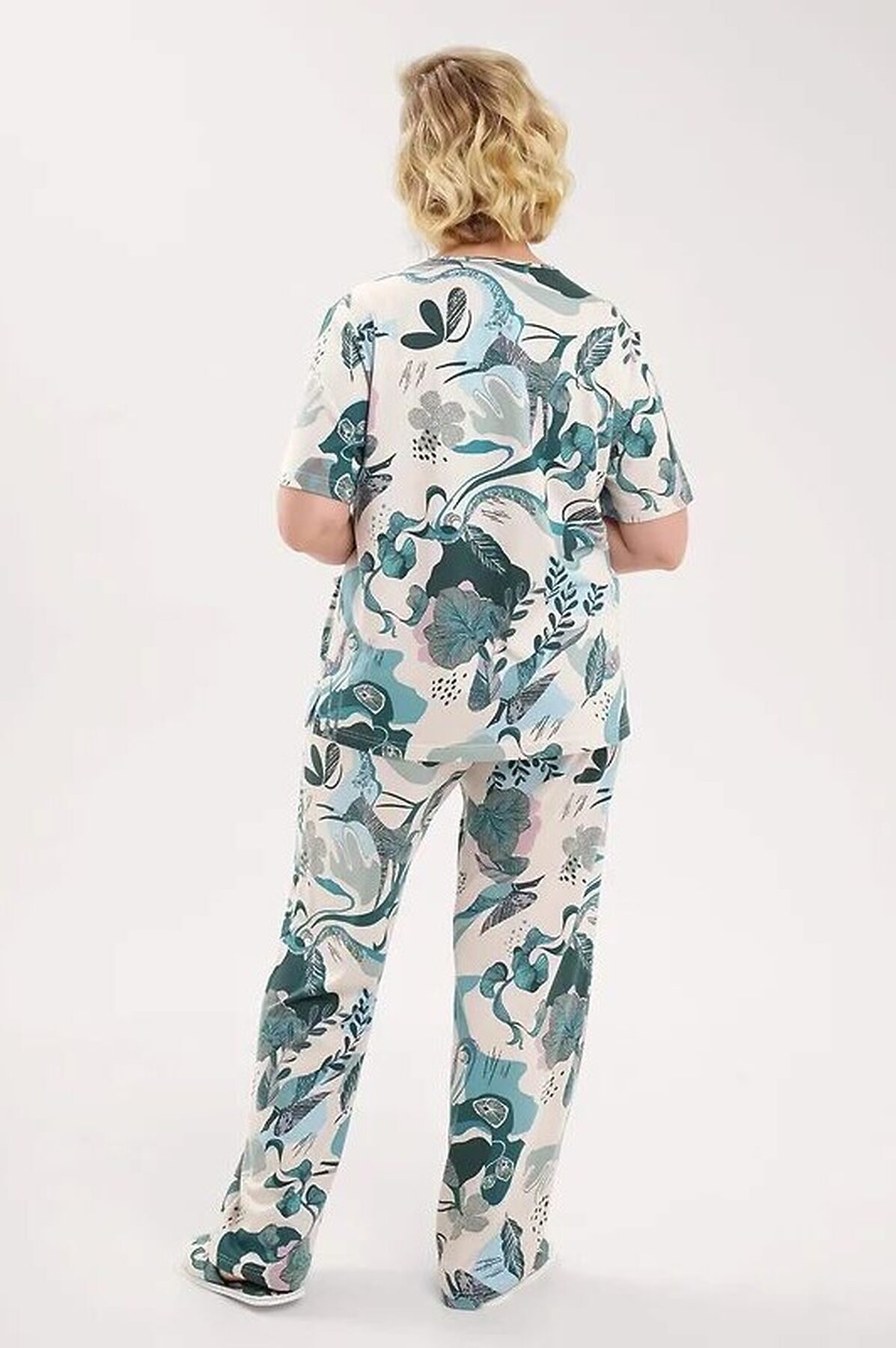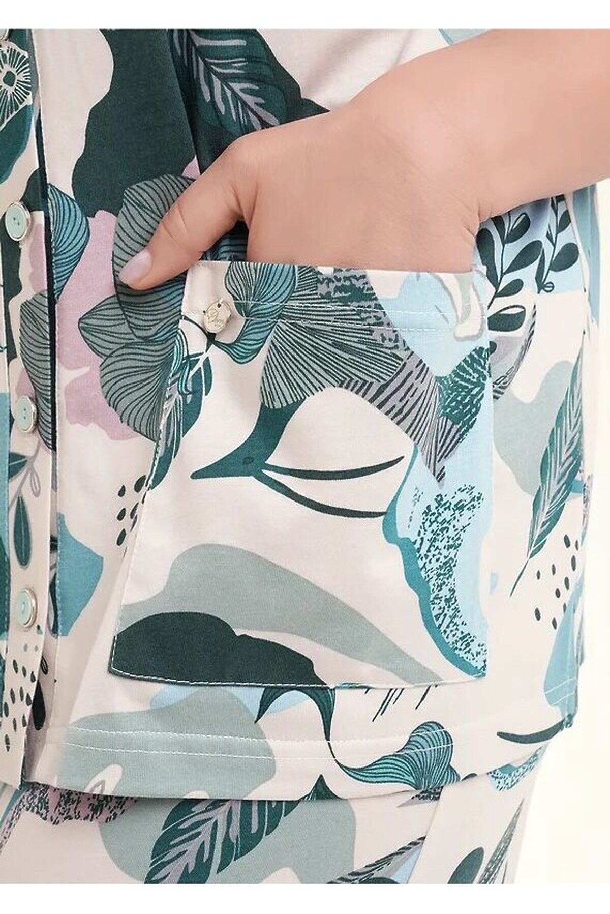 Пижама из трикотажного полотна с модалом. Джемпер по горловине и борту обтачка с застежкой на пуговицы, накладные карманы, нашивка металл. Короткий втачной рукав. Боковые разрезы. Брюки с поясом на внутренней резинке. Боковые карманы с отрезным бочком.