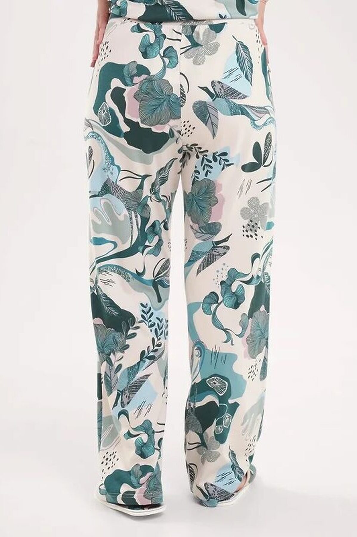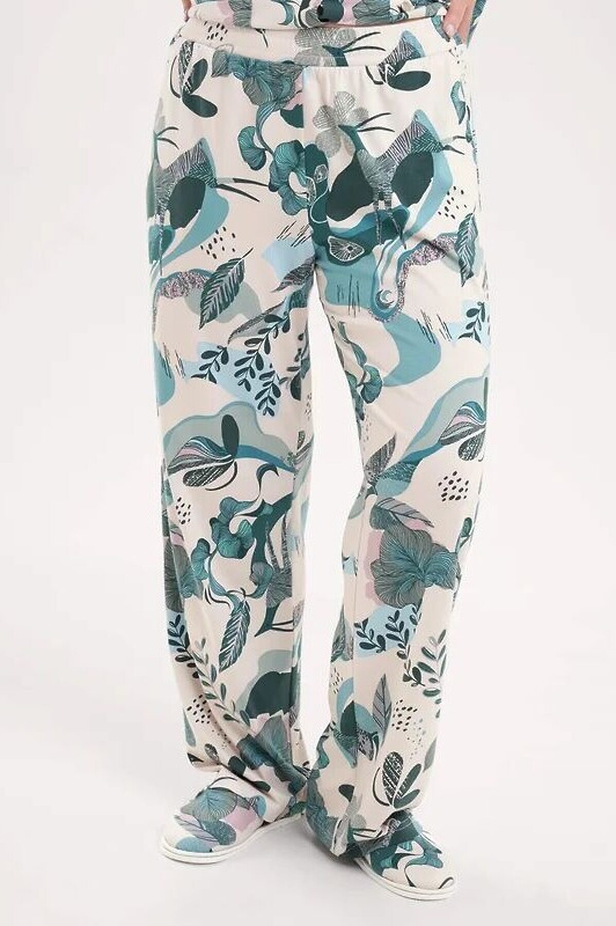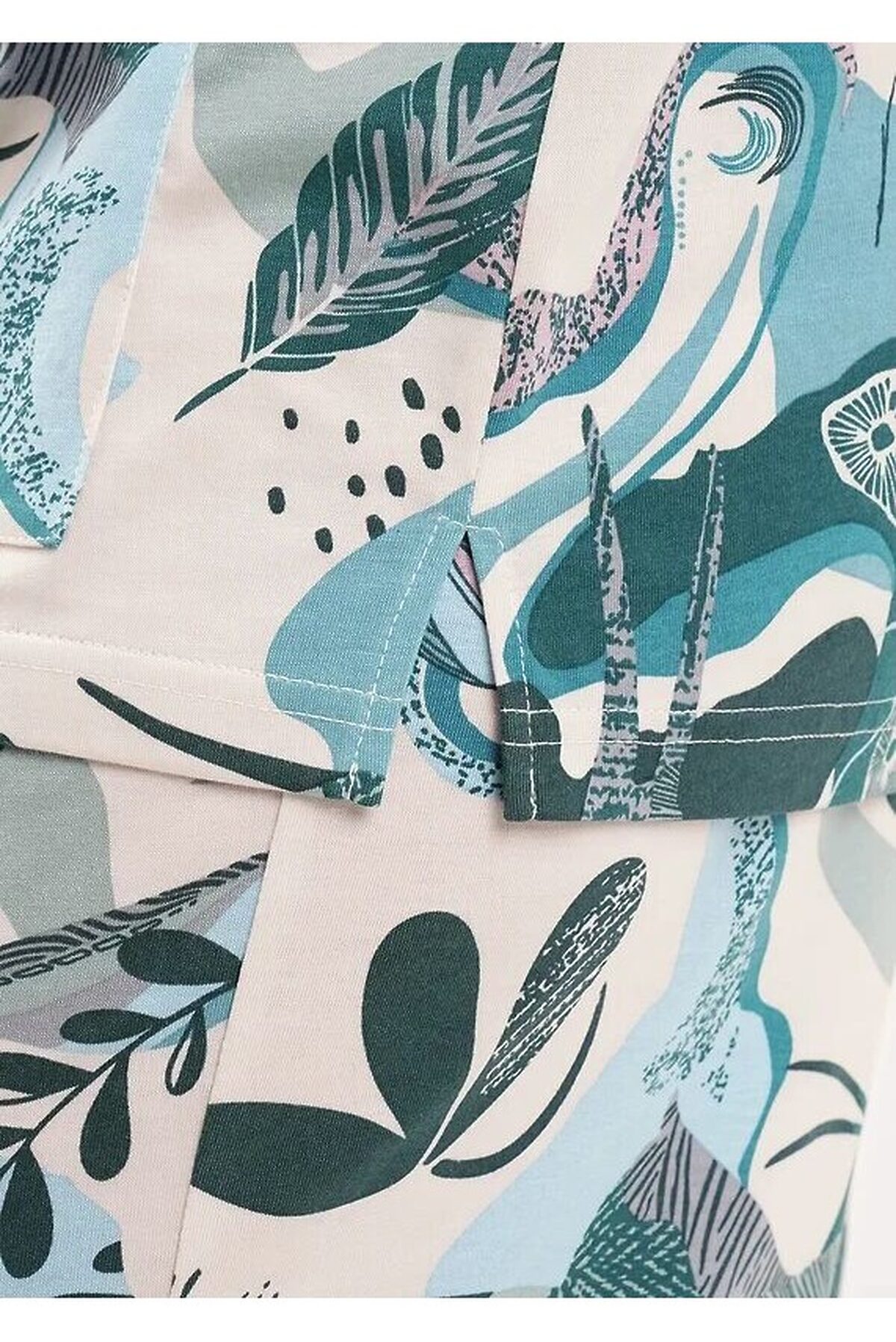Пижама из трикотажного полотна с модалом. Джемпер по горловине и борту обтачка с застежкой на пуговицы, накладные карманы, нашивка металл. Короткий втачной рукав. Боковые разрезы. Брюки с поясом на внутренней резинке. Боковые карманы с отрезным бочком.
