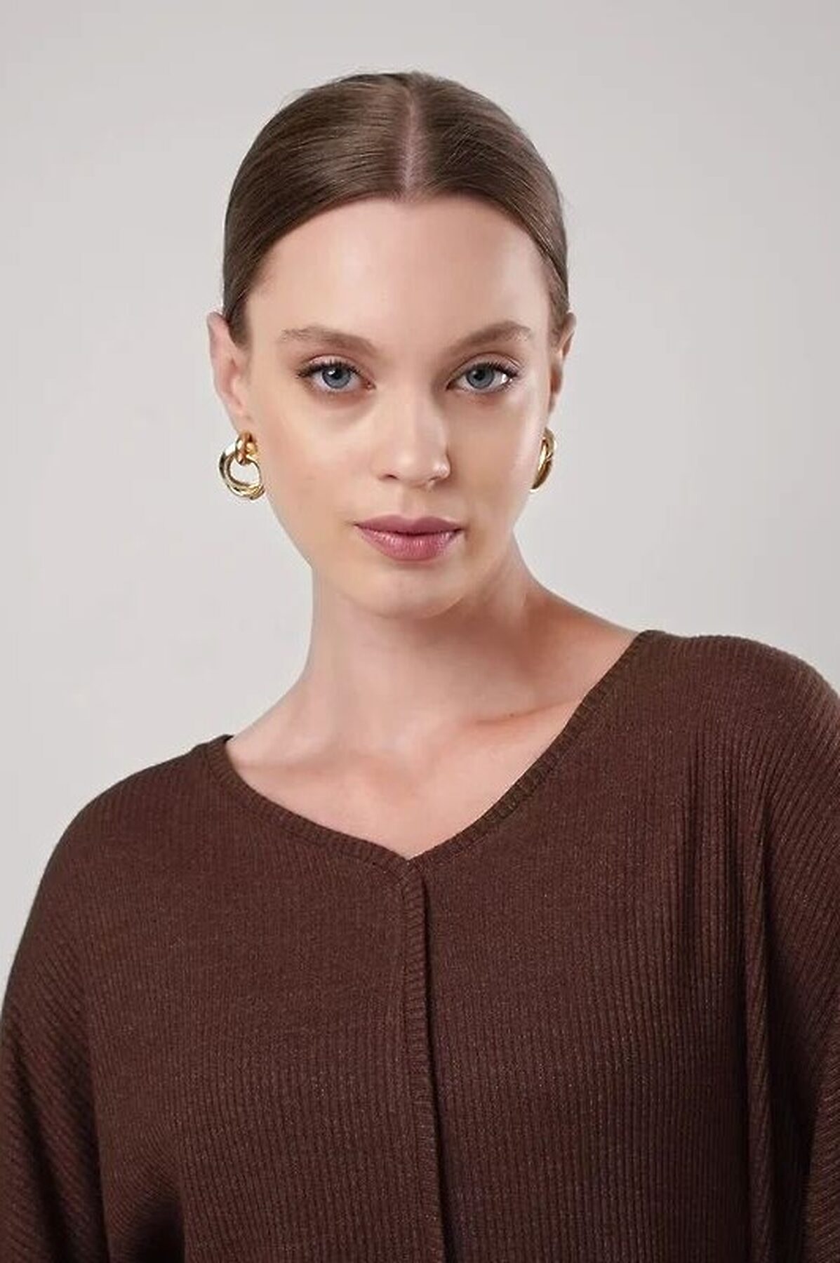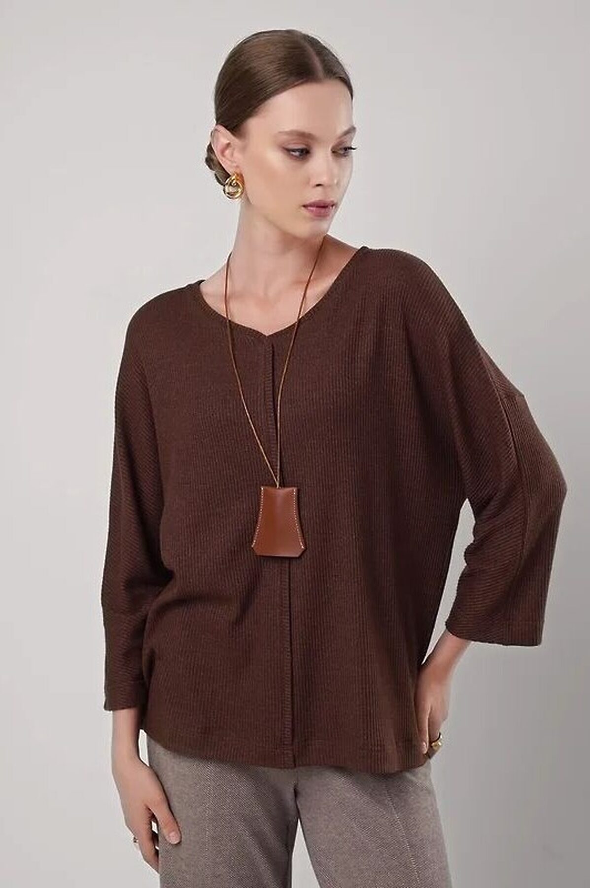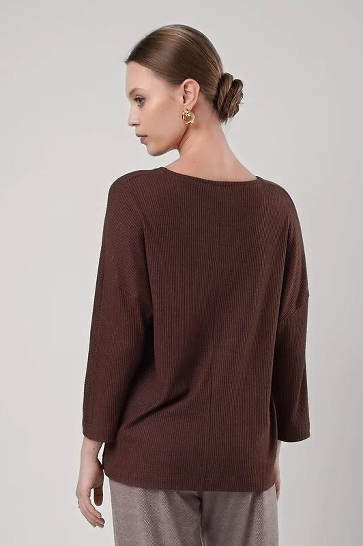 Джемпер свободного кроя из трикотажного полотна кашкорсе. По горловине притачная обтачка, переходящая на перед. Длинный цельнокроенный рукав спереди, по спинке спущенный. По переду и спинке средний шов.