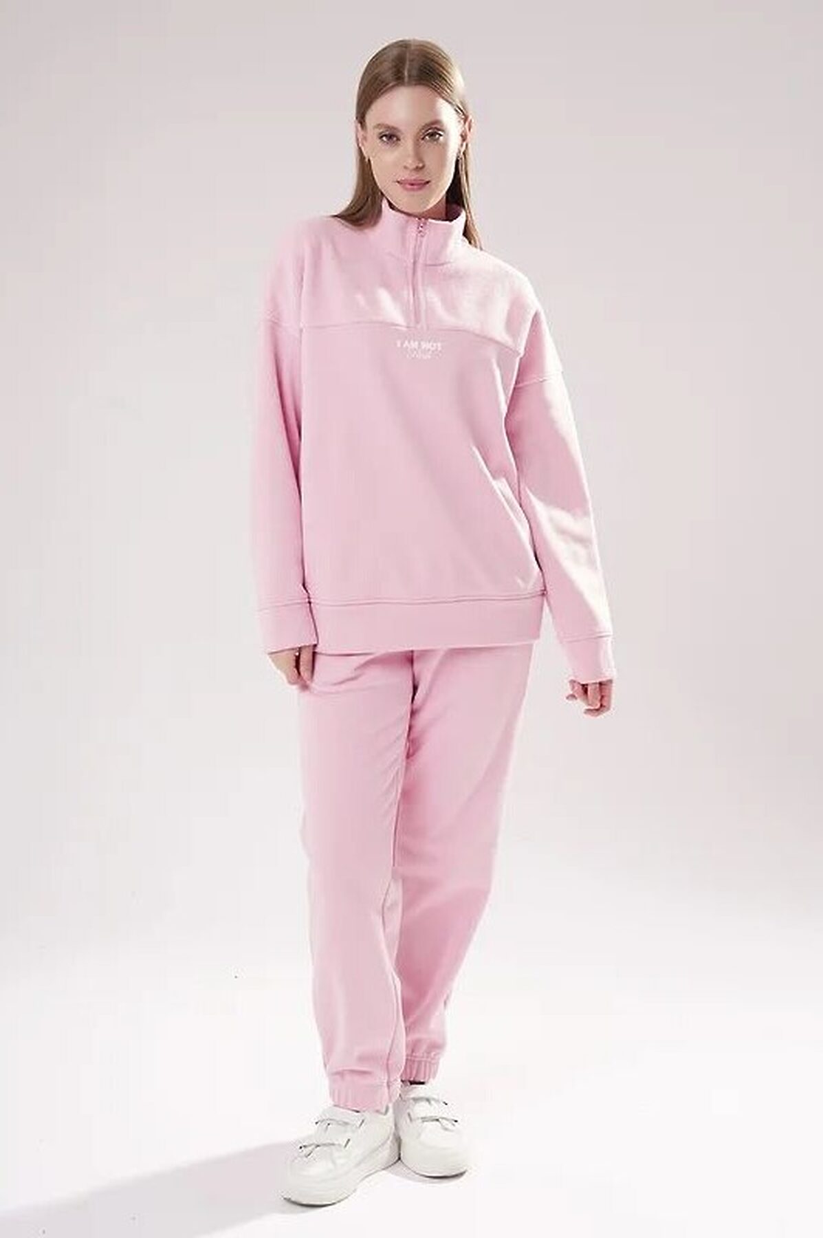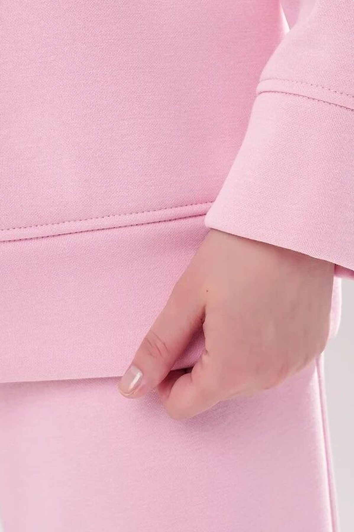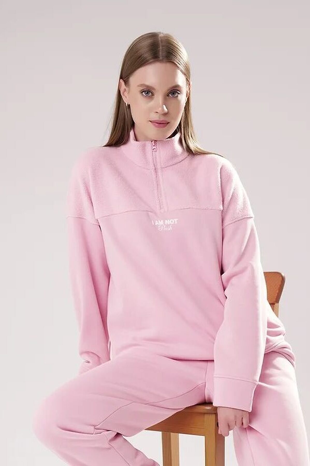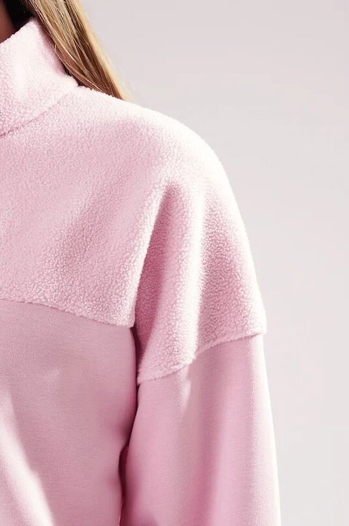 Джемпер спортивный свободного силуэта из трикотажного полотна футер с начесом "тедди". По горловине стойка с молнией. Спереди и по спинке кокетка наизнанку. Длинный рукав со спущенной линией плеча, по низу манжет. Внизу изделия притачной пояс.