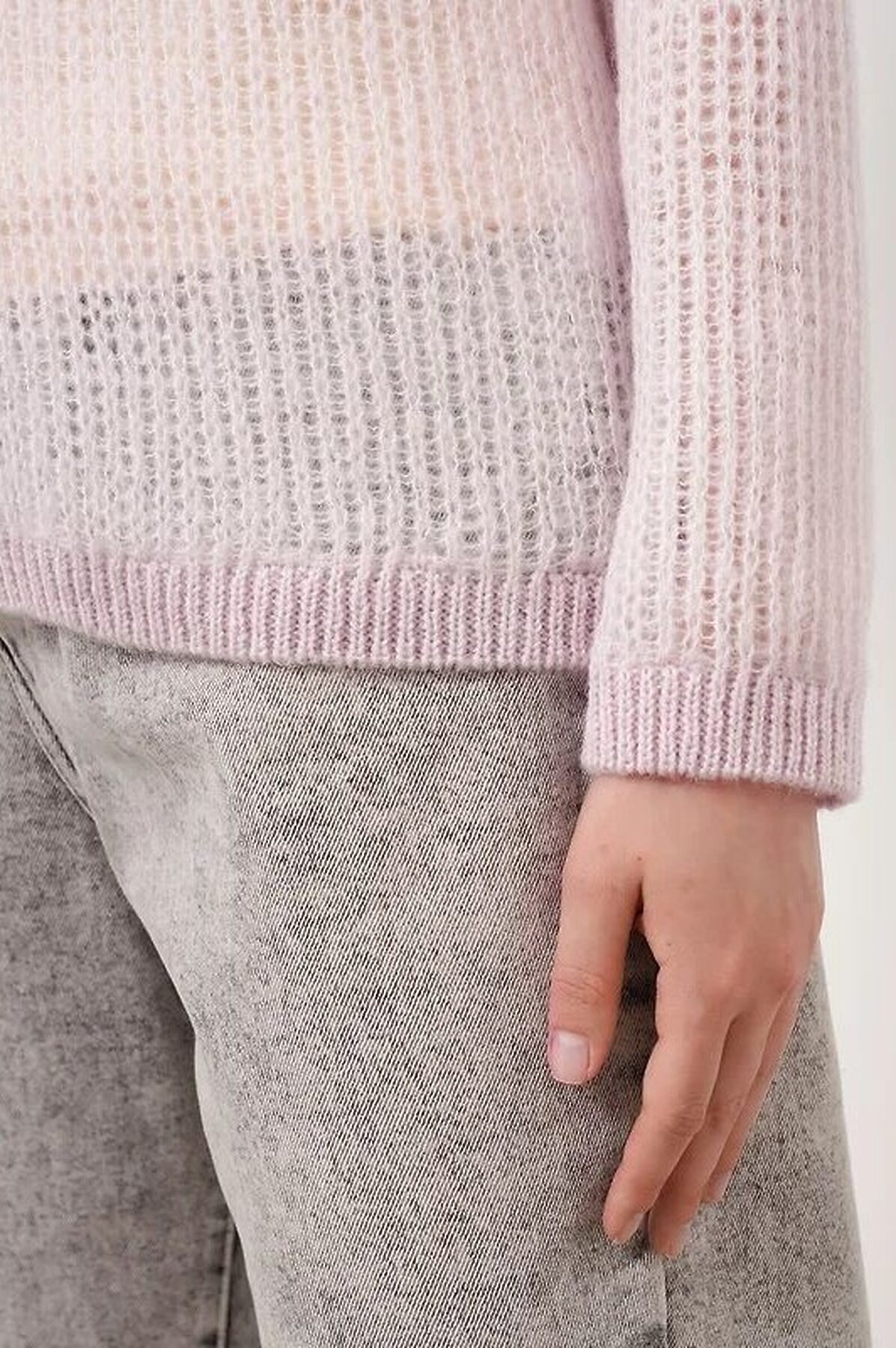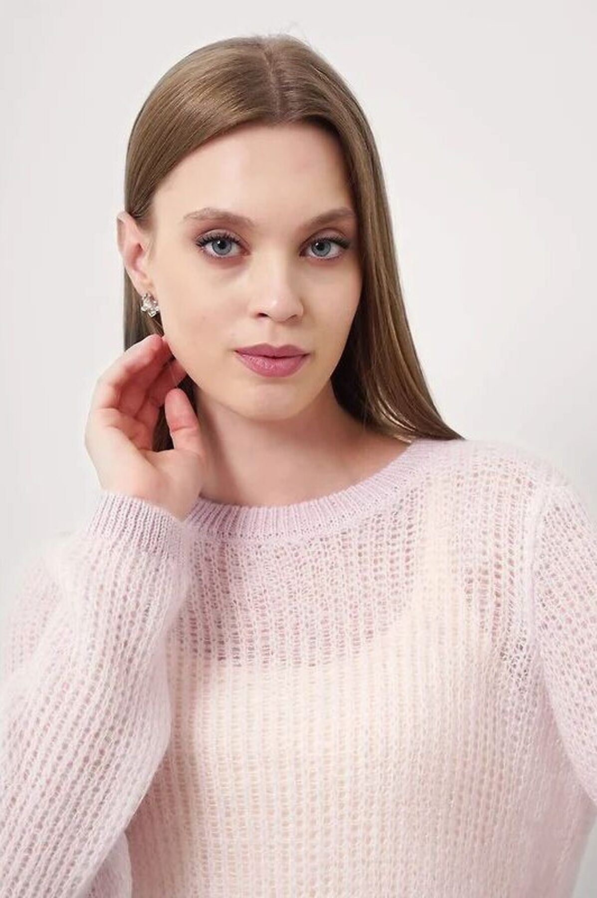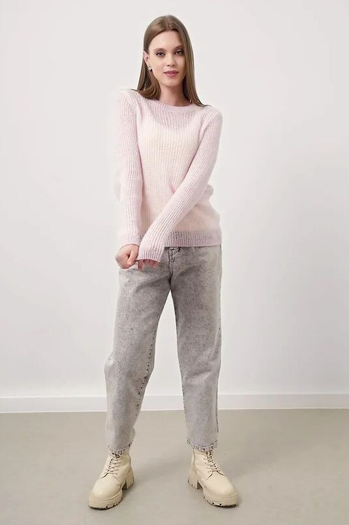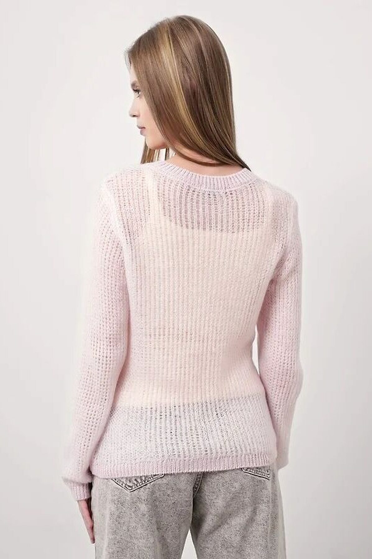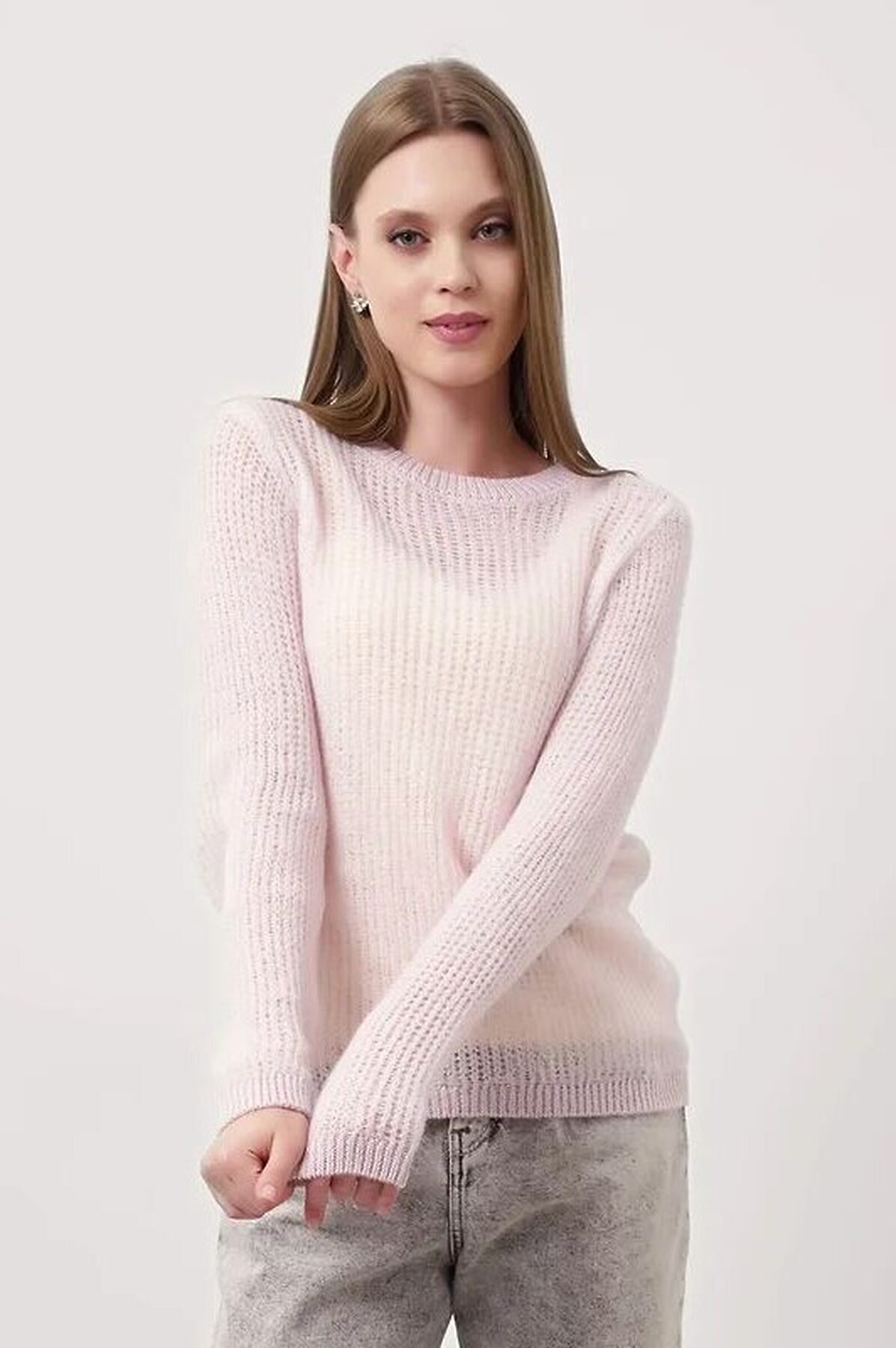 Вязаный джемпер из акриловой пряжи, переплетения "полуфанг". Длинный втачной рукав. Округлая горловина с бейкой. По горловине и манжетам ластик.