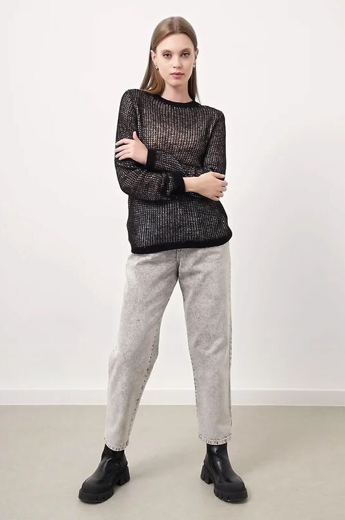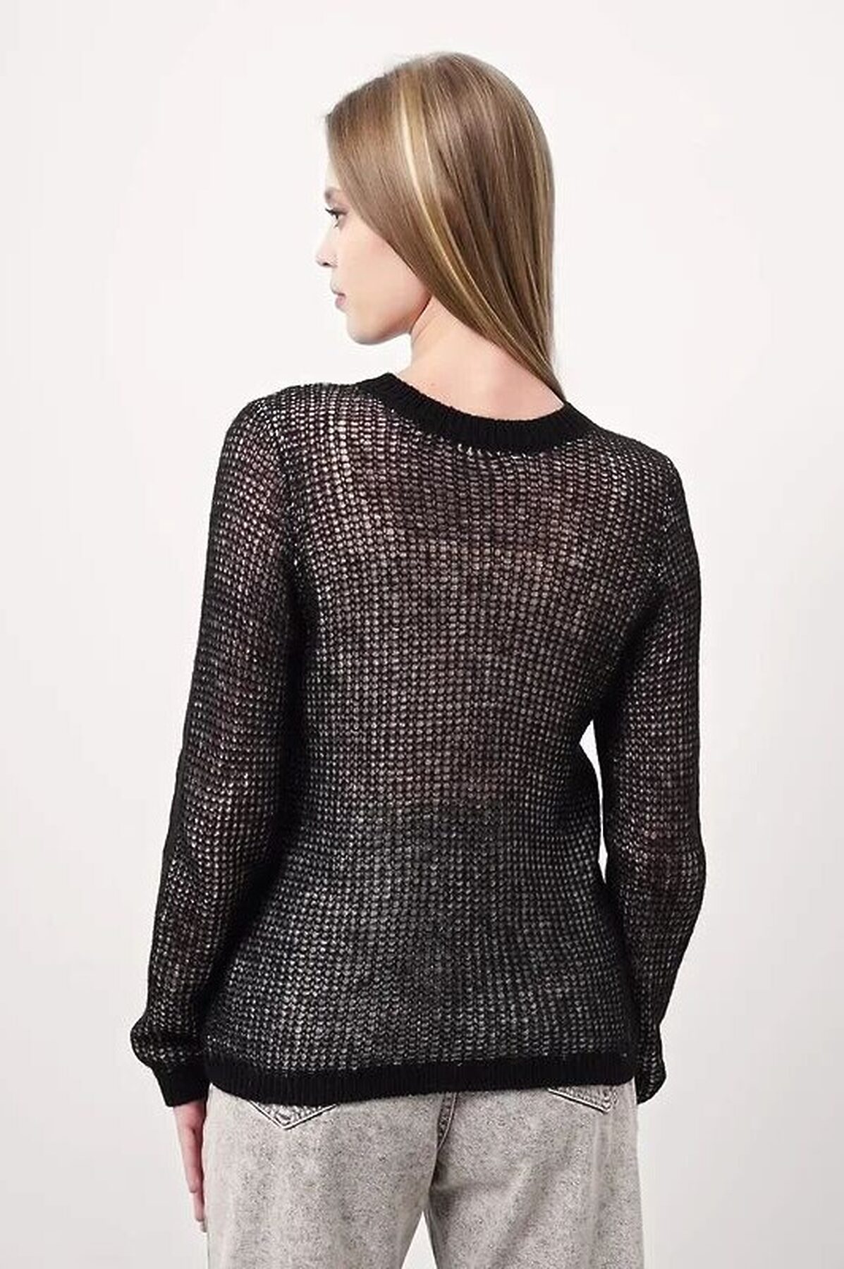 Вязаный джемпер из акриловой пряжи, переплетения "полуфанг". Длинный втачной рукав. Округлая горловина с бейкой. По горловине и манжетам ластик.