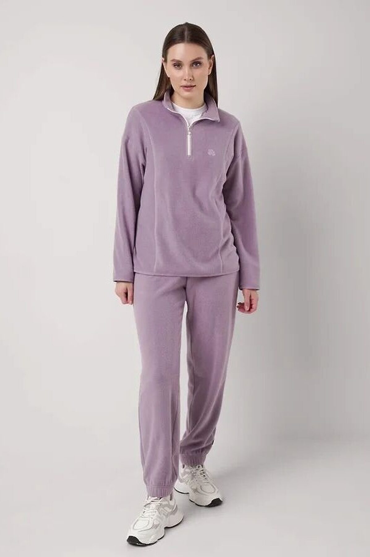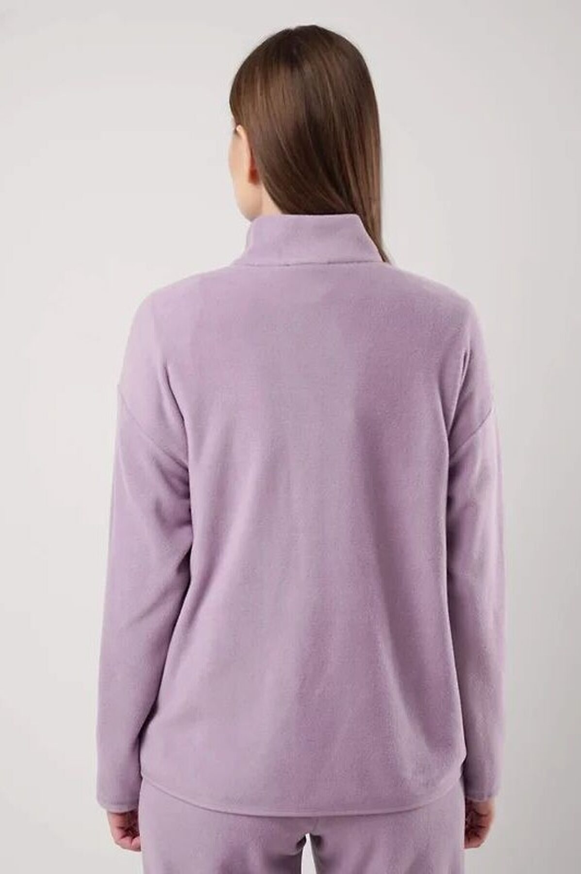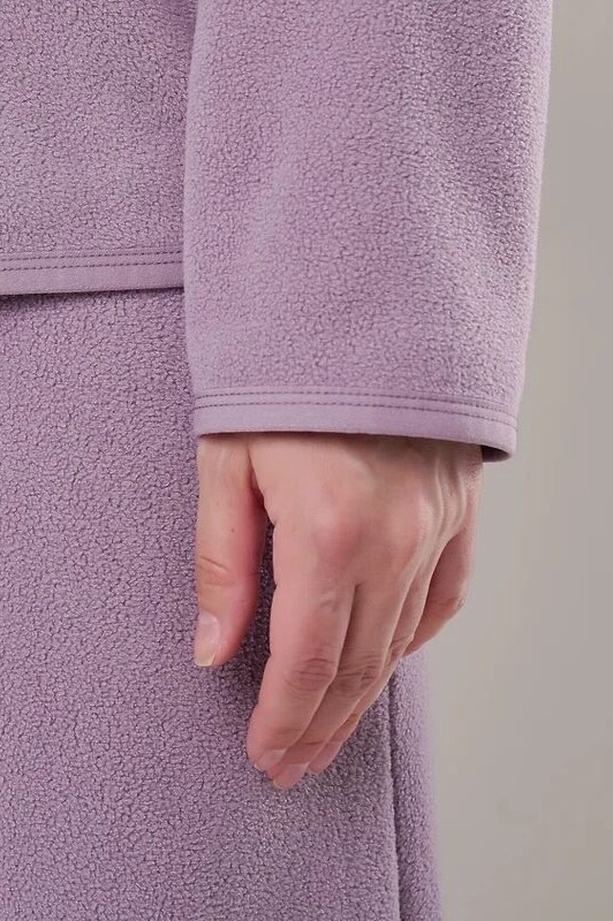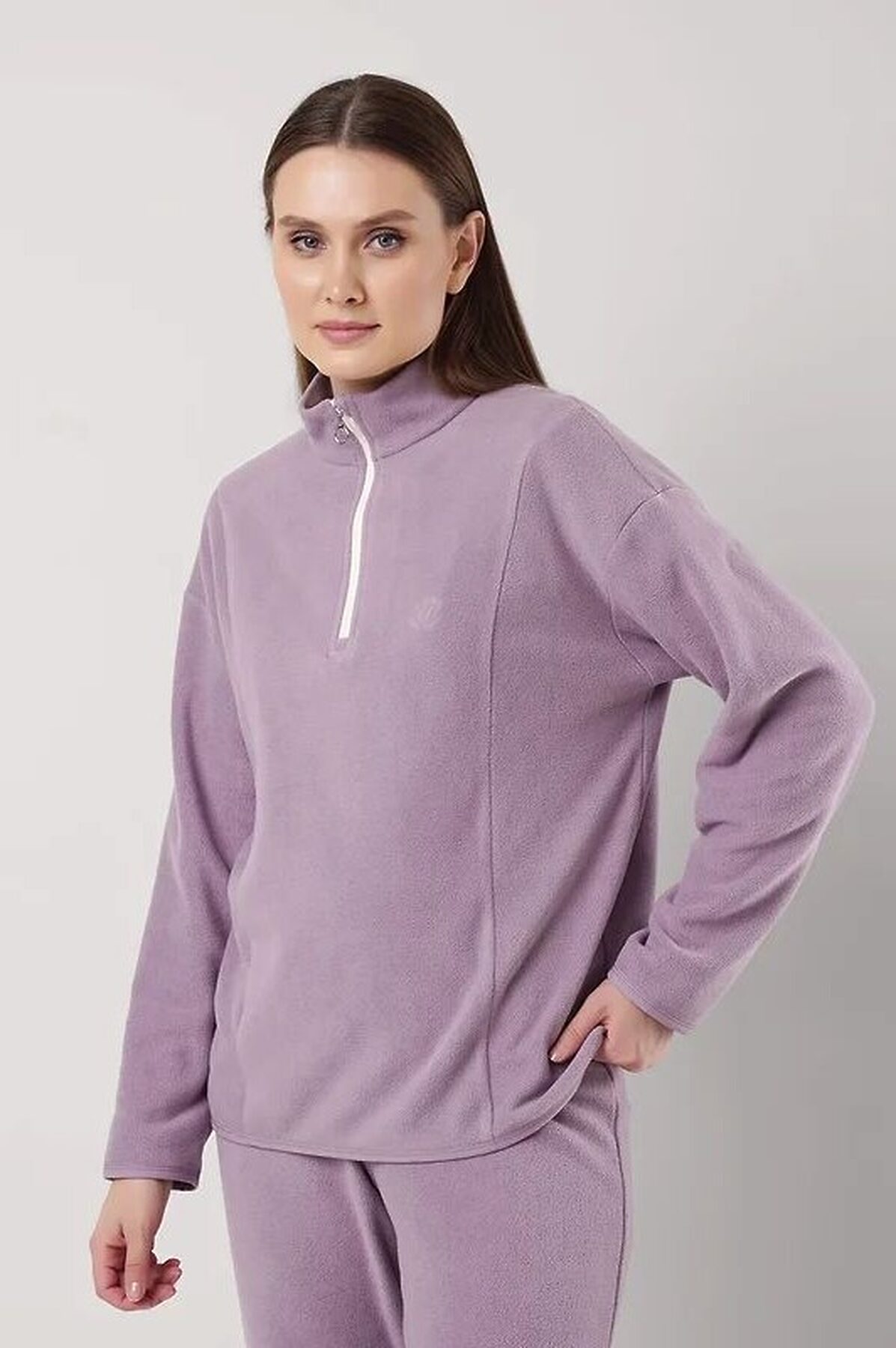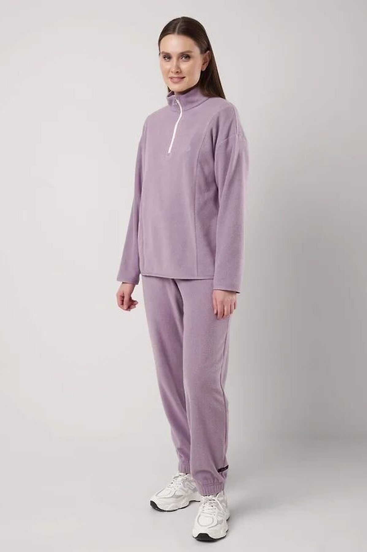 Джемпер спортивный прямого силуэта из трикотажного полотна флис. По горловине стойка с молнией. Спереди рельефы. Длинный рукав со спущенной линией плеча. По низу рукава и низа изделия окантовка. Спереди вышивка.