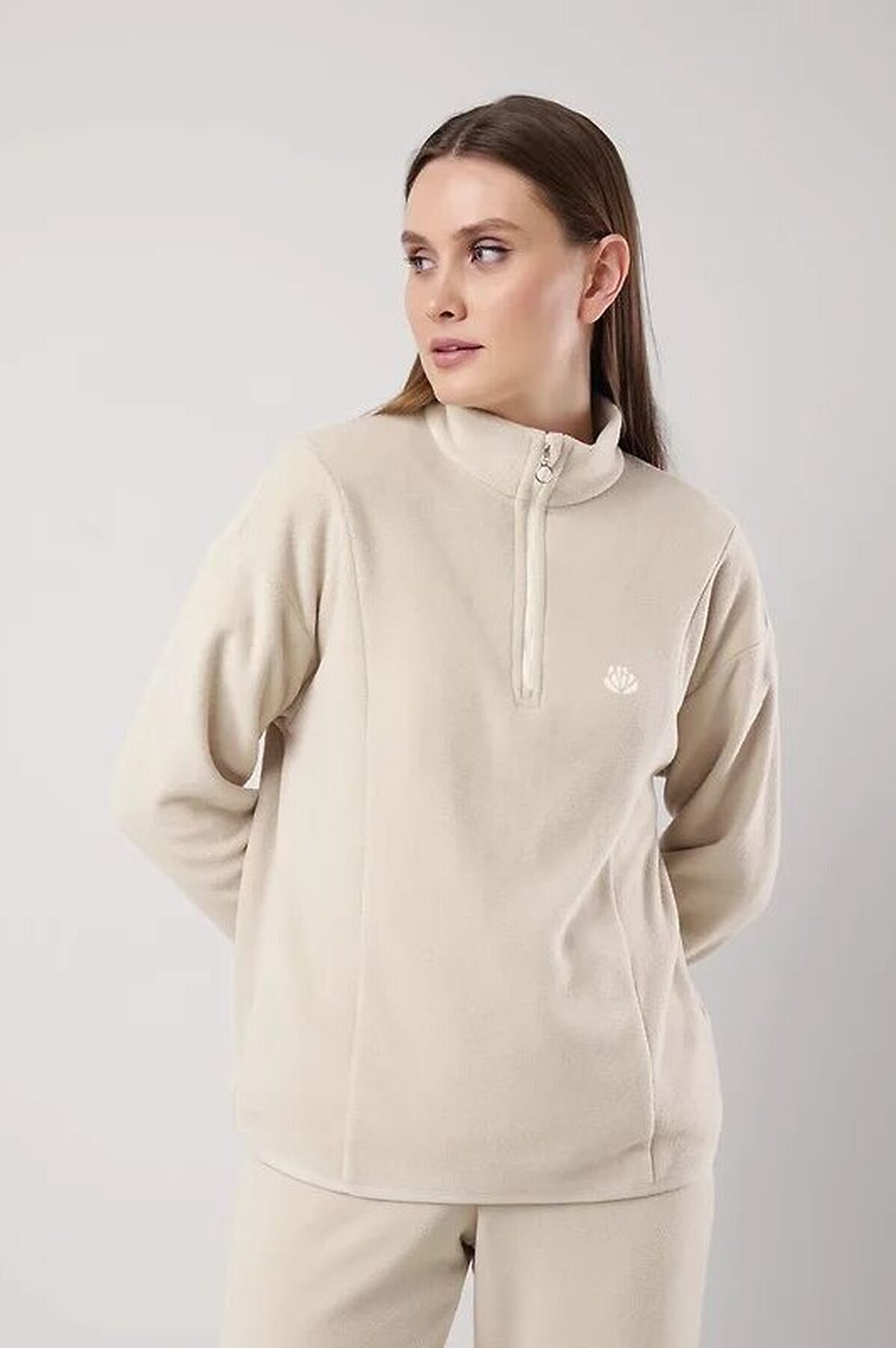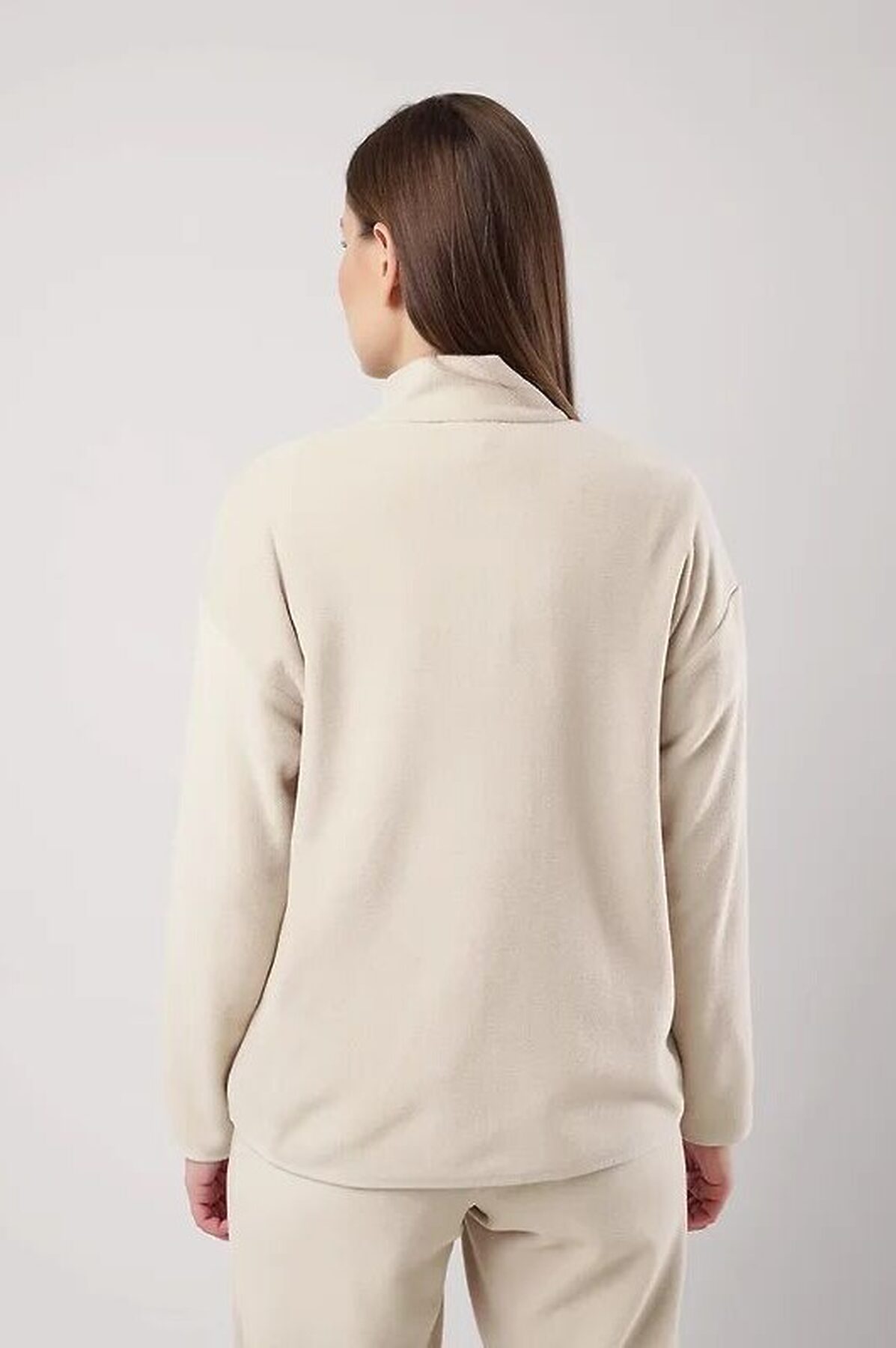 Джемпер спортивный прямого силуэта из трикотажного полотна флис. По горловине стойка с молнией. Спереди рельефы. Длинный рукав со спущенной линией плеча. По низу рукава и низа изделия окантовка. Спереди вышивка.