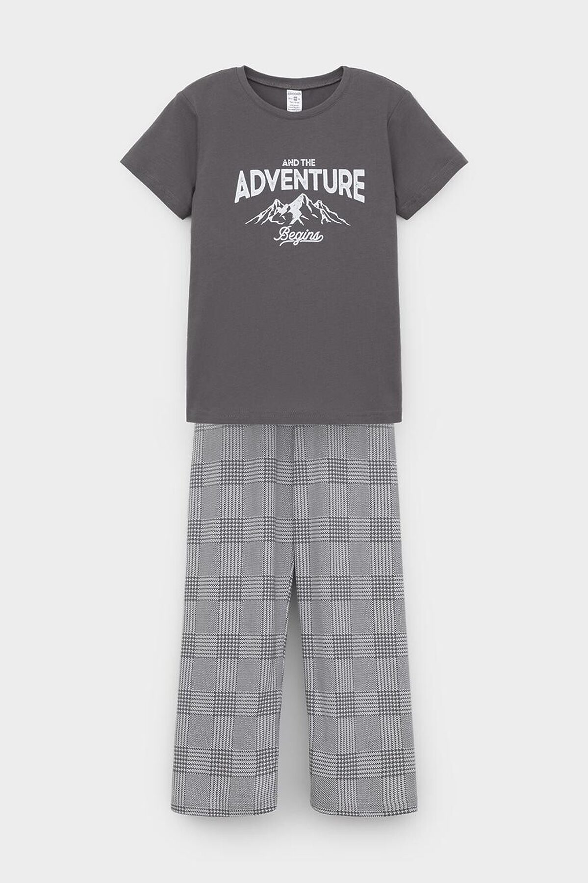 Трикотажная пижама из натурального хлопка. Футболка с короткими втачными рукавами и прямые брюки с эластичной резинкой в поясе. Оригинальные набивка и принт выполнены из стойких гипоаллергенных текстильных гипоаллергенных красителей. Изделие сохраняет цвет и форму после многократных стирок. Все трикотажные полотна производятся в соответсвии с нормами швейцарского сертификата ЭкоТекс.