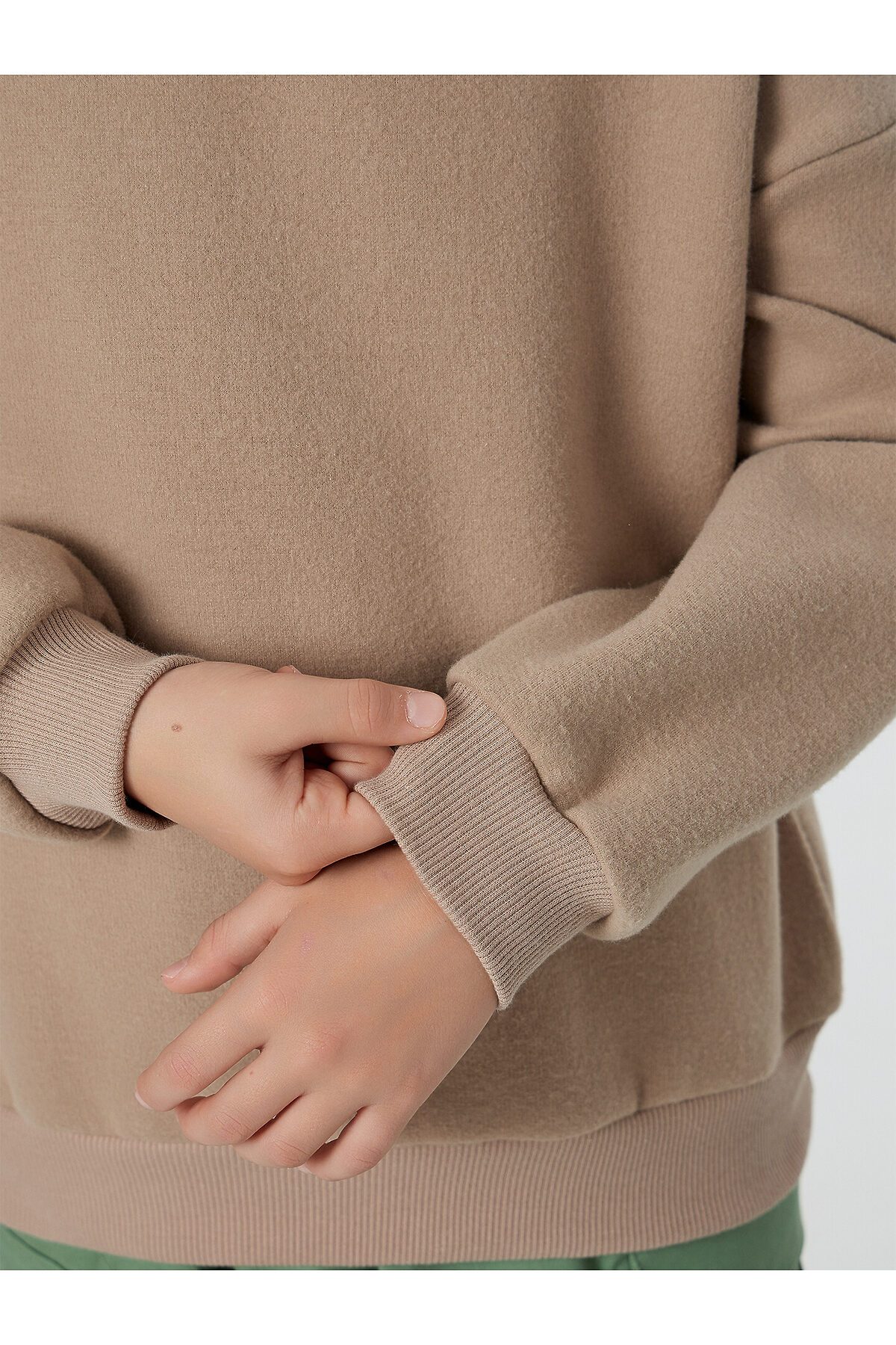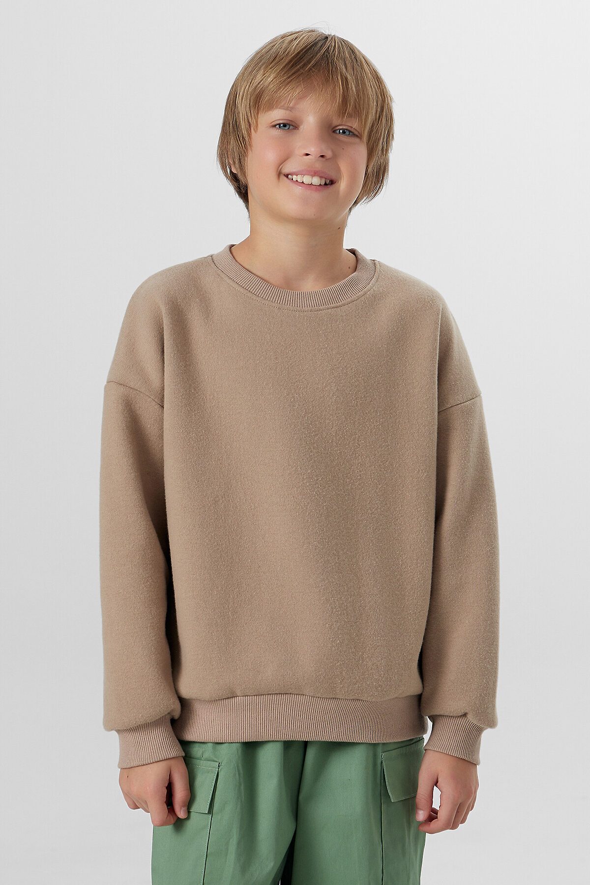Свитшот свободного силуэта. Рукава длинные, втачные. Линия плеча спущена. Перед и спинка цельнокроенные. Горловина круглой формы обработана обтачкой из рибаны. По низу рукавов и джемпера притачены манжеты и пояс из рибаны.