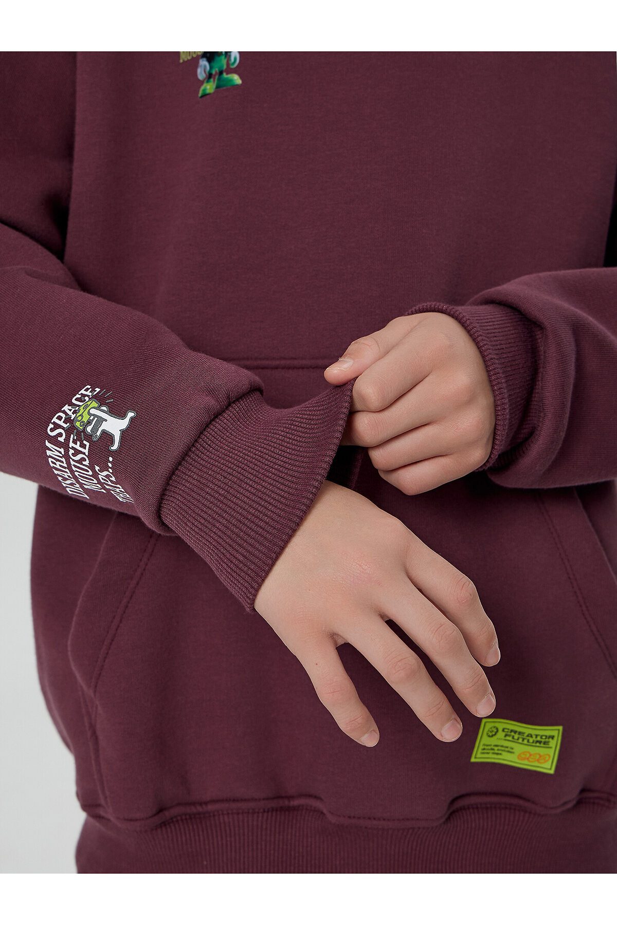 Анорак изготовлен из трикотажного полотна футер. Анорак свободного силуэта (оверсайз), с капюшоном. Горловина округлой формы. Капюшон со средним швом, на подкладке из осн. полотна. Плечо спущено, рукав втачной длинный. По низу рукава отрезная манжета из рибаны. По переду настрочен карман кенгуру. Пояс отрезной из рибаны, отстрочен.