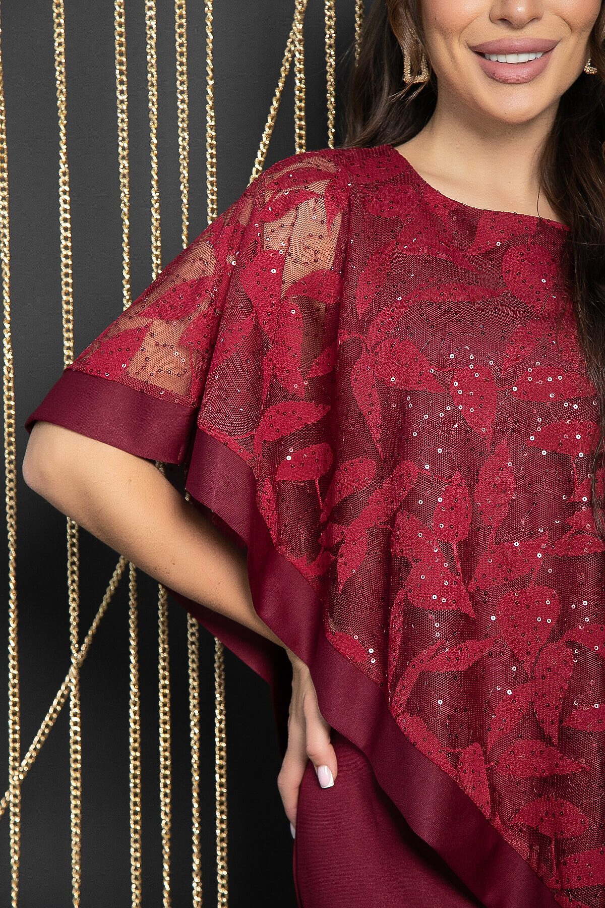 Уникальное вечернее платье, созданное для самых очаровательных леди. Оно состоит из двух частей: облегающего платья и накидки из сетки, расшитой пайетками. В сочетании с туфлями-лодочками этот наряд станет настоящим шедевром! Обратите внимание, что накидка не снимается.