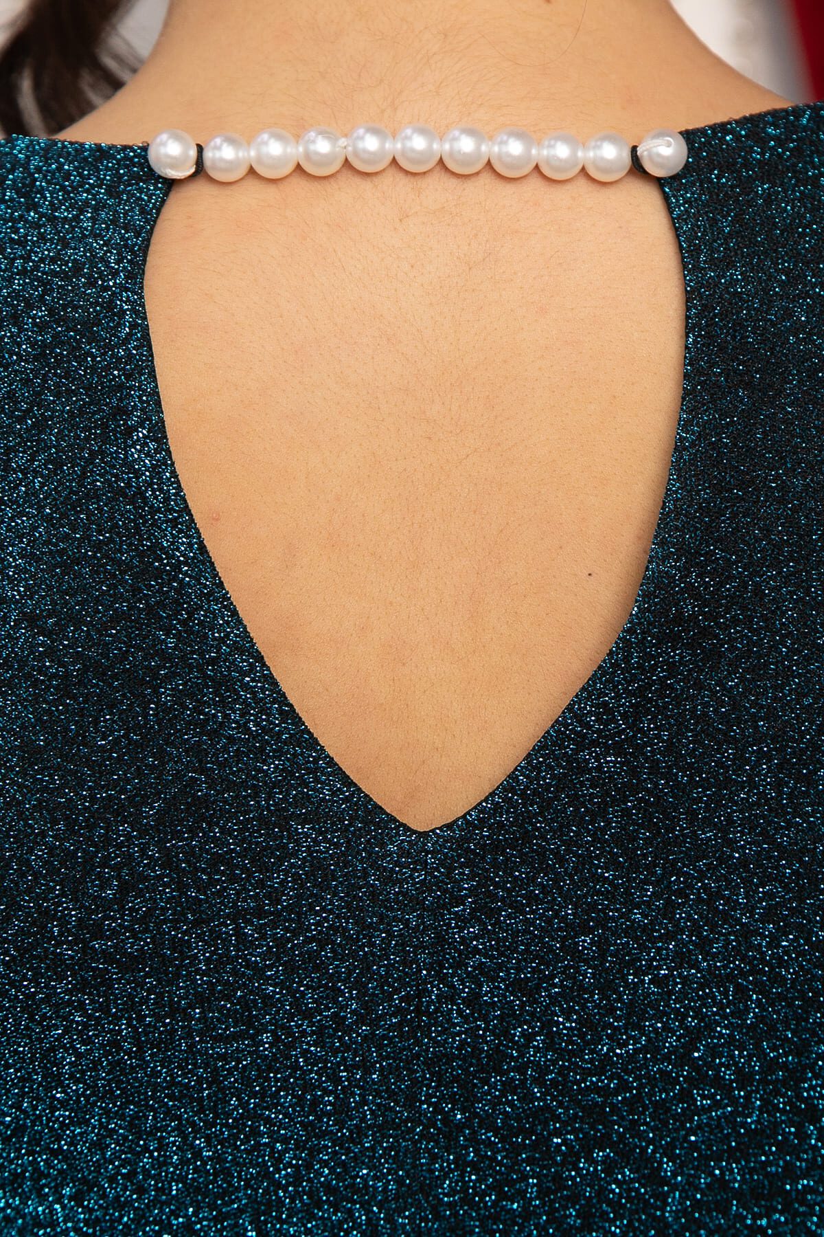 Вечернее платье средней длины полуприлегающего силуэта из трикотажа с люрексом станет вашим идеальным выбором! Декоративный вырез на спинке с перемычкой из «жемчужной» нити — изюминка платья. Втачной рукав-полуреглан плавно подчёркивает линию вашего плеча. Разрез по низу спинки обеспечивает комфорт при движении и придаёт платью особый шарм. Платье идеально садится по фигуре, подчёркивая достоинства.