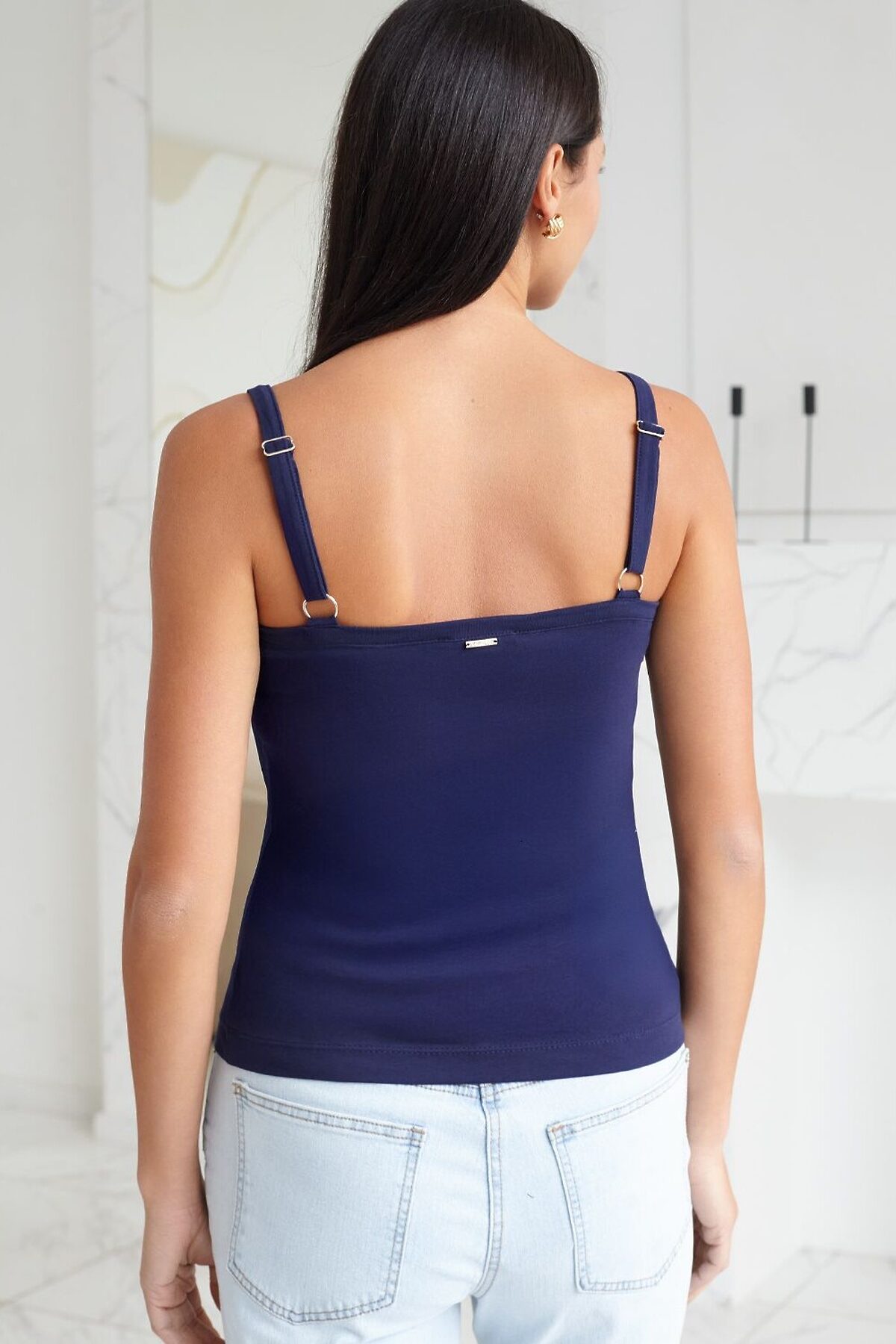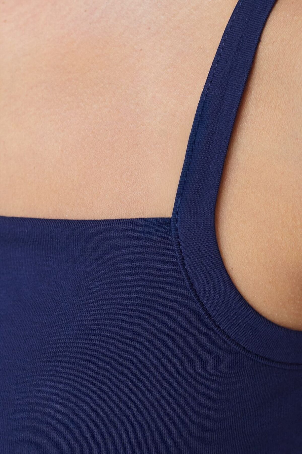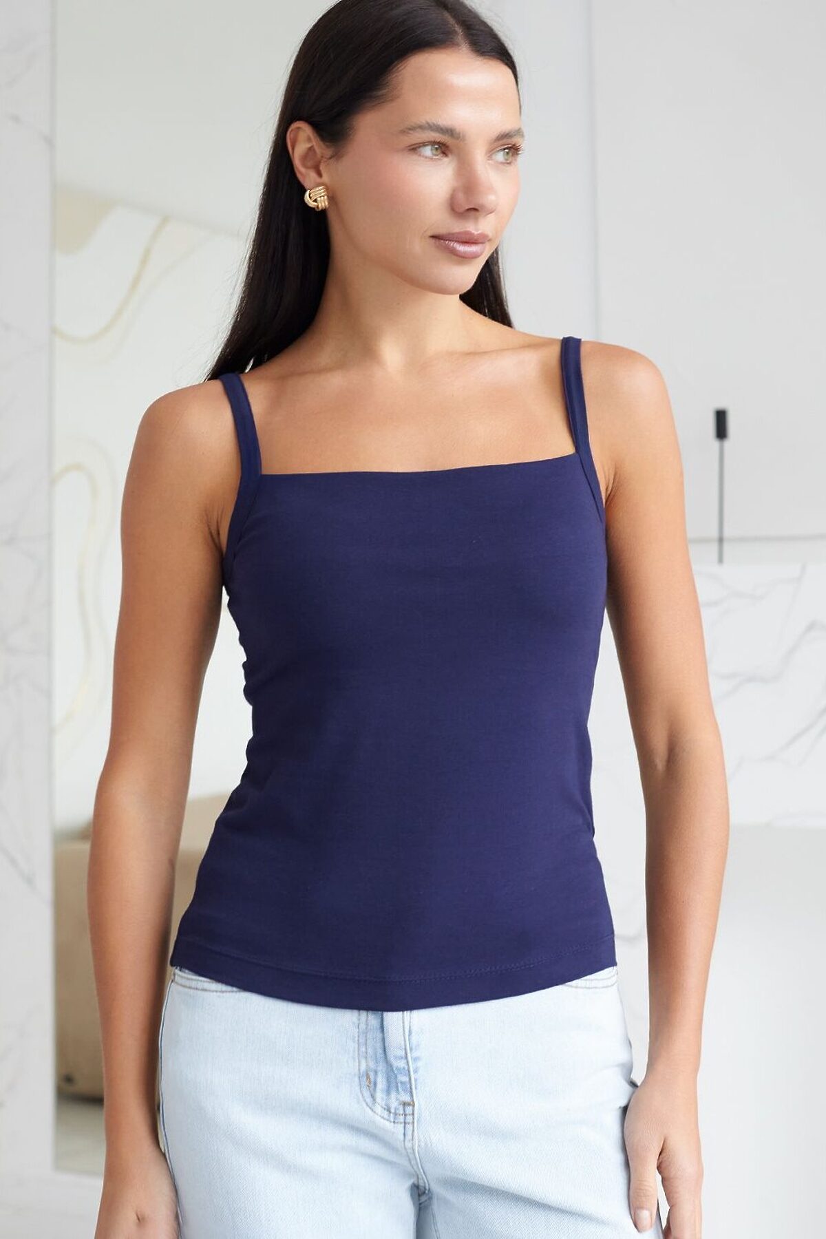 Стильный и базовый топ темно-синего цвета полуприлегающего кроя идеально подходит для девушек и женщин всех возрастов. Двуслойная зона бра. Линия декольте образована посредством сгиба полотна без отсрочки и закреплением обоих слоев в шве проймы. Удобные регулируемые бретели. Прямой силуэт подходит любому типу фигуры. Квадратный вырез горловины - тренд этого сезона. Он выполнен из качественной дышащей ткани, что обеспечивает комфорт в жаркую погоду. Однотонный дизайн позволяет легко сочетать его с различными предметами гардероба, создавая элегантный повседневный образ. Такая модель майки на тонких бретельках выглядит утонченно и изящно, подчеркивая достоинства фигуры. Этот топ отлично подходит на высокий и низкий рост, а также доступен в больших, включая 56, и маленьких размерах. Регулируемые бретельки обеспечивают удобную посадку, не сковывая движений. Такой вариант идеально подойдет как для работы, так и для деловых встреч, добавляя нотку женственности в любой наряд. Одевайте этот комфортный топ в любое вре