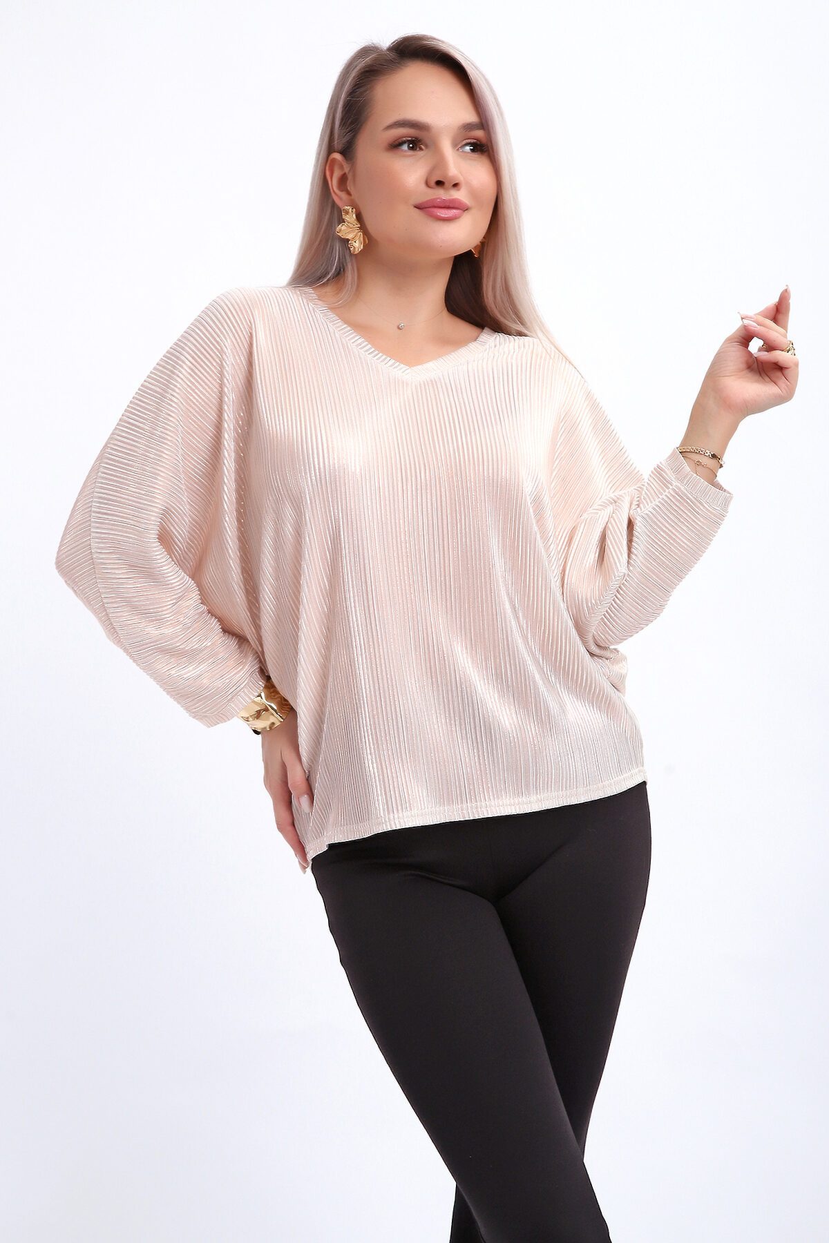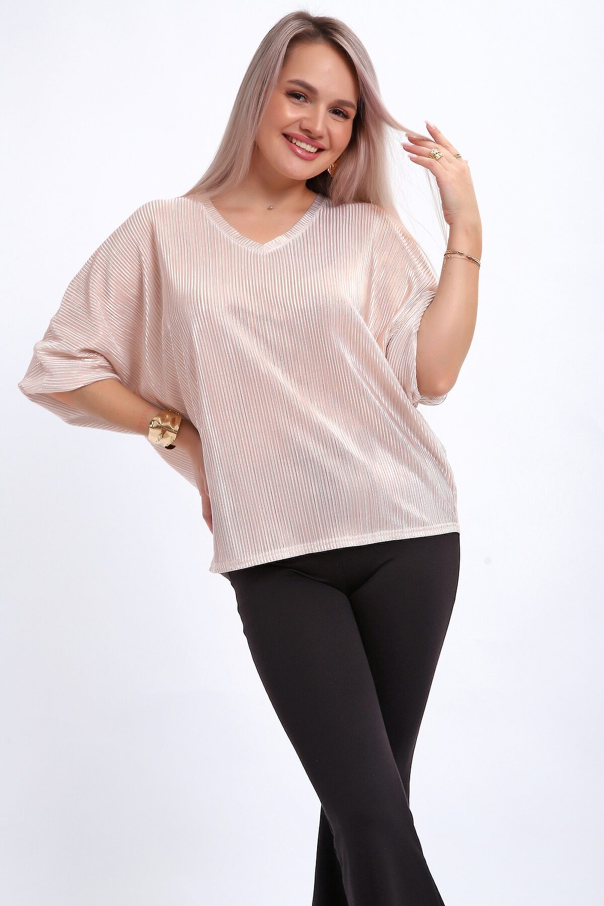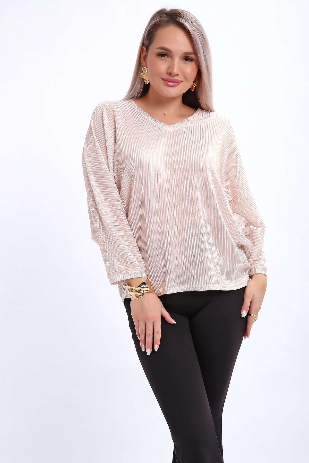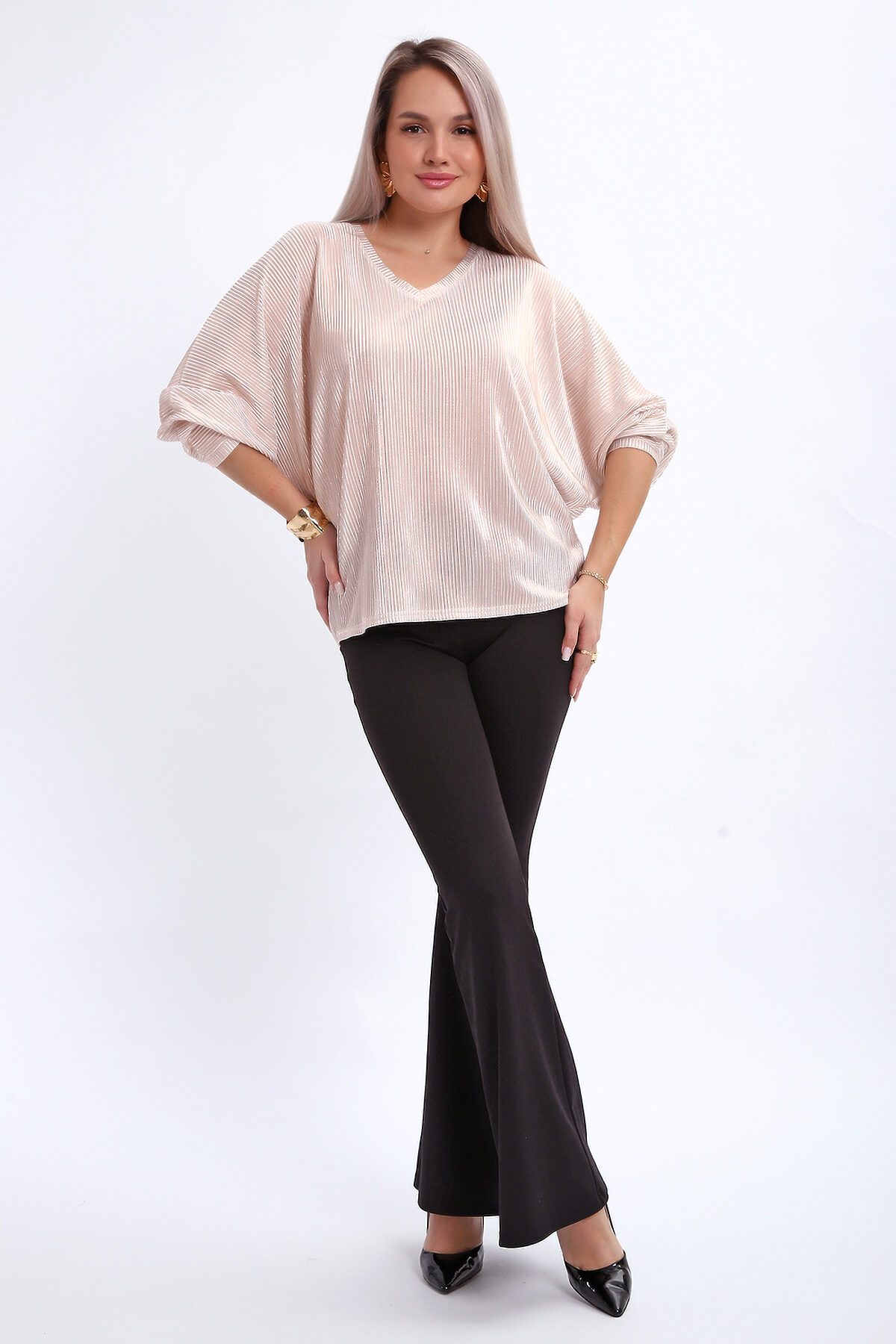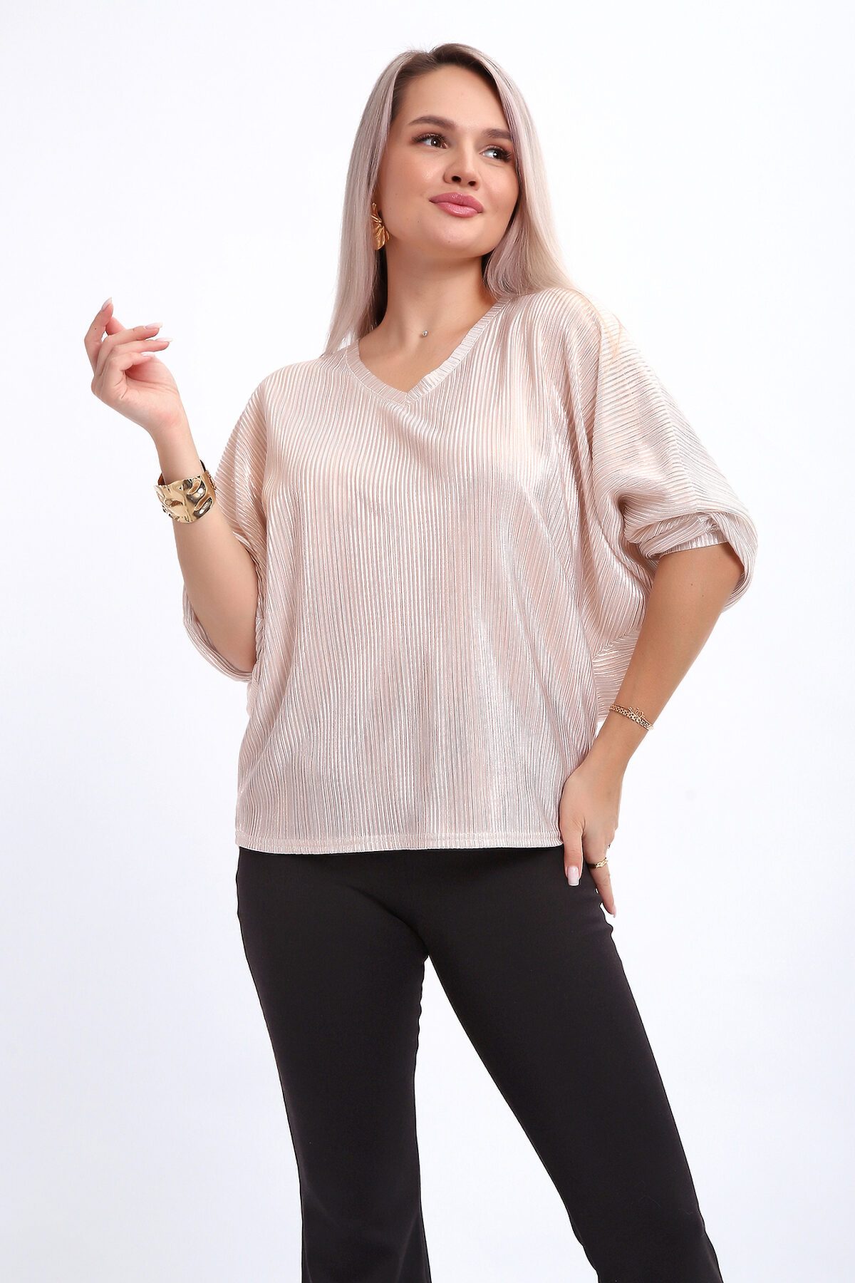 Сделайте акцент на вашем стиле с помощью комфортной и изысканной блузки. Нарядная кофта - это необходимый предмет в любом гардеробе. Благодаря свободному крою, она идеально садится на любую фигуру, скрывая то, что хотелось бы спрятать и подчеркивая достоинства. Блузка выигрышно смотрится за счет ткани атлас гофре со стойким напылением фойл, которое не осыпается в процессе носки и после стирки. Ткань атлас гофре хорошо тянется и драпируется, имеет мягкий благородный блеск и совершенно не мнется. Крой блузки лаконичен, без лишних деталей, рукав летучая мышь не сковывает движений, имеет длину 3/4 и оканчивается небольшим манжетом. V-образный воротник зрительно удлиняет шею, обработан обтачкой, длина блузки до линии бедра. Легкая изящная блузка отлично впишется в вечерний наряд, а также будет блестящим дополнением к деловому и повседневному образу. В замерах длина рукава указана от горловины.