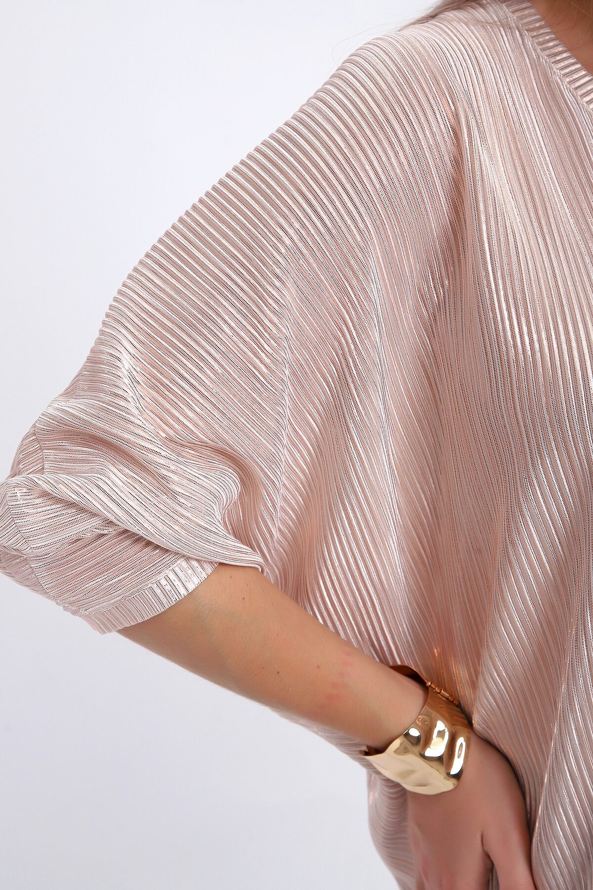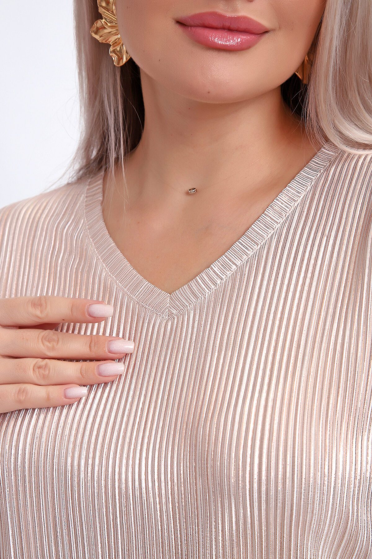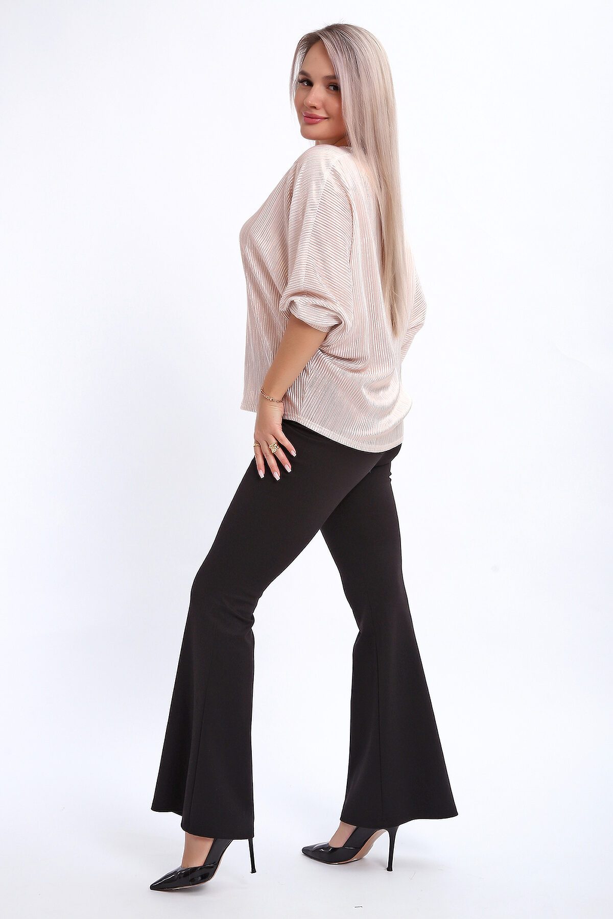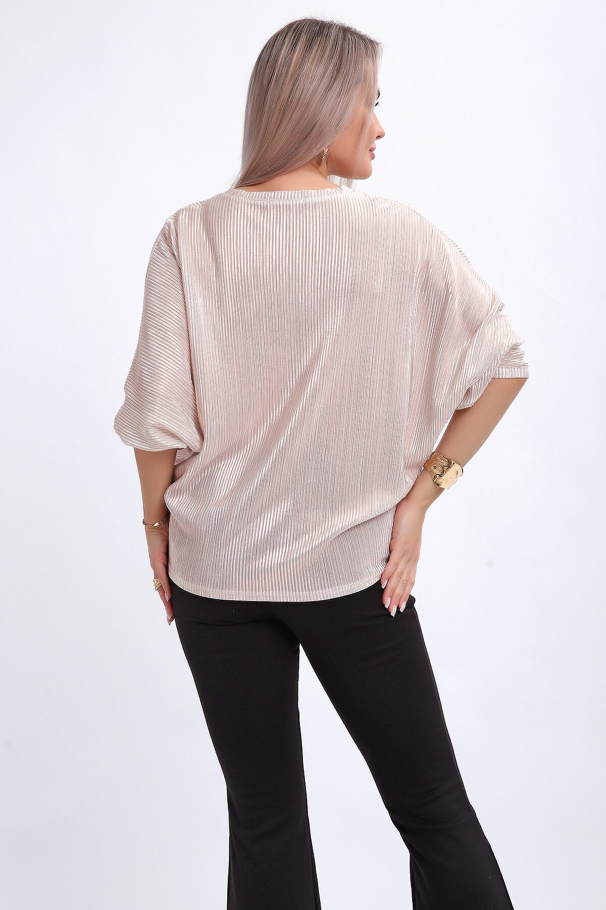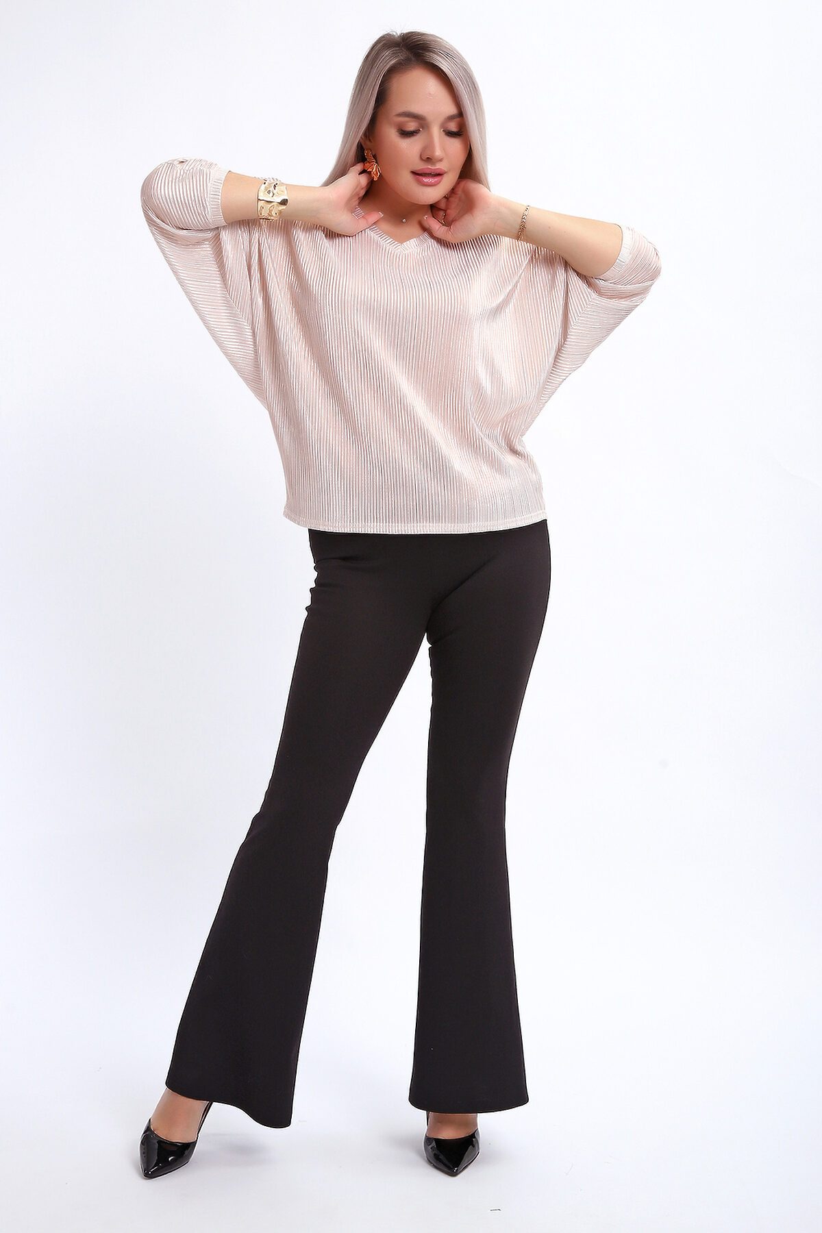Сделайте акцент на вашем стиле с помощью комфортной и изысканной блузки. Нарядная кофта - это необходимый предмет в любом гардеробе. Благодаря свободному крою, она идеально садится на любую фигуру, скрывая то, что хотелось бы спрятать и подчеркивая достоинства. Блузка выигрышно смотрится за счет ткани атлас гофре со стойким напылением фойл, которое не осыпается в процессе носки и после стирки. Ткань атлас гофре хорошо тянется и драпируется, имеет мягкий благородный блеск и совершенно не мнется. Крой блузки лаконичен, без лишних деталей, рукав летучая мышь не сковывает движений, имеет длину 3/4 и оканчивается небольшим манжетом. V-образный воротник зрительно удлиняет шею, обработан обтачкой, длина блузки до линии бедра. Легкая изящная блузка отлично впишется в вечерний наряд, а также будет блестящим дополнением к деловому и повседневному образу. В замерах длина рукава указана от горловины.