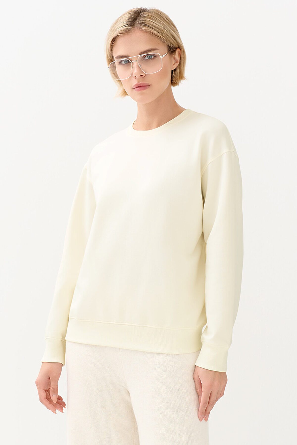 Женский свитшот свободного кроя из двухниточного футера со спущенным плечом, длинными рукавами и круглым вырезом. Манжеты, горловина и низ, оформленные рибаной в лаконичный рубчик, добавляют текстурности и делают силуэт более графичным. Трикотажный материал на основе мягкого хлопка отлично пропускает воздух, приятно ощущается на теле и подходит даже для чувствительной кожи. Добавление эластана способствует сохранению формы изделия. Универсальное решение для капсульного гардероба: свитшот одинаково эффектно смотрится в дуэте с джинсами и кроссовками, с юбкой миди и ботильонами или поверх платья-комбинации для модных многослойных образов.
