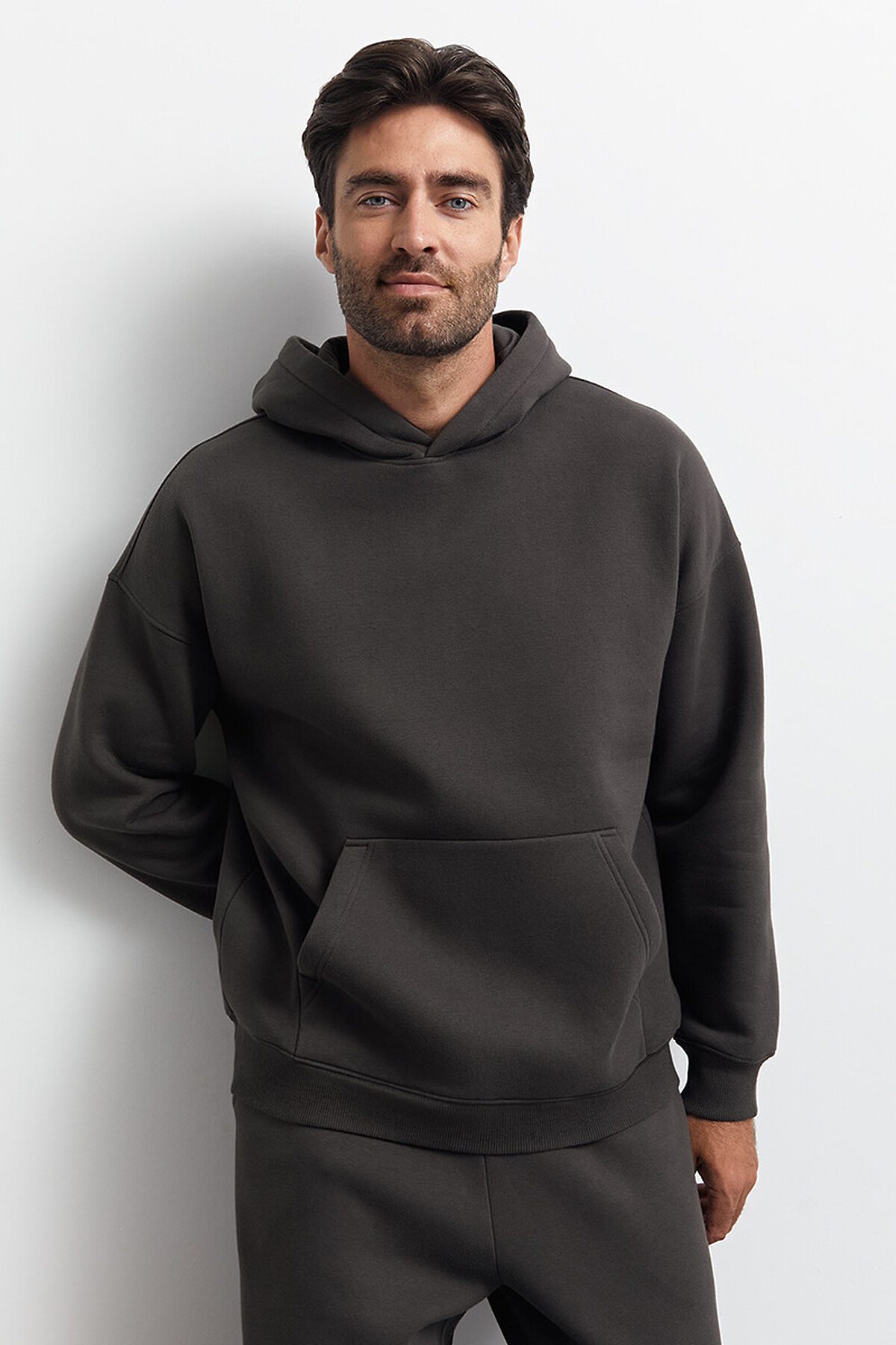 Мужское утеплённое худи свободного кроя из мягкого футера с начёсом, со спущенным плечом, длинными рукавами, капюшоном и карманом-«кенгуру» спереди. Манжеты и низ, оформленные рибаной в лаконичный рубчик, добавляют изделию текстурности и делают силуэт более графичным. Трикотажный материал на основе высококачественного хлопка хорошо пропускает воздух, приятно ощущается на теле и подходит даже для чувствительной кожи. Добавление полиэстера создает теплосберегающий эффект, а деликатная обработка швов обеспечивает дополнительный комфорт. Универсальное худи для повседневных образов: комфортное, тёплое и стильное решение на каждый день.