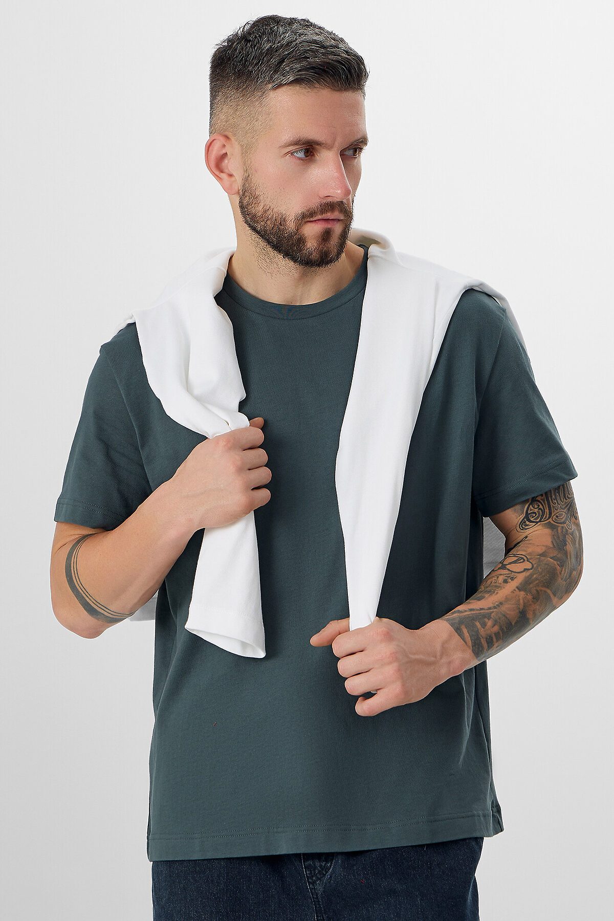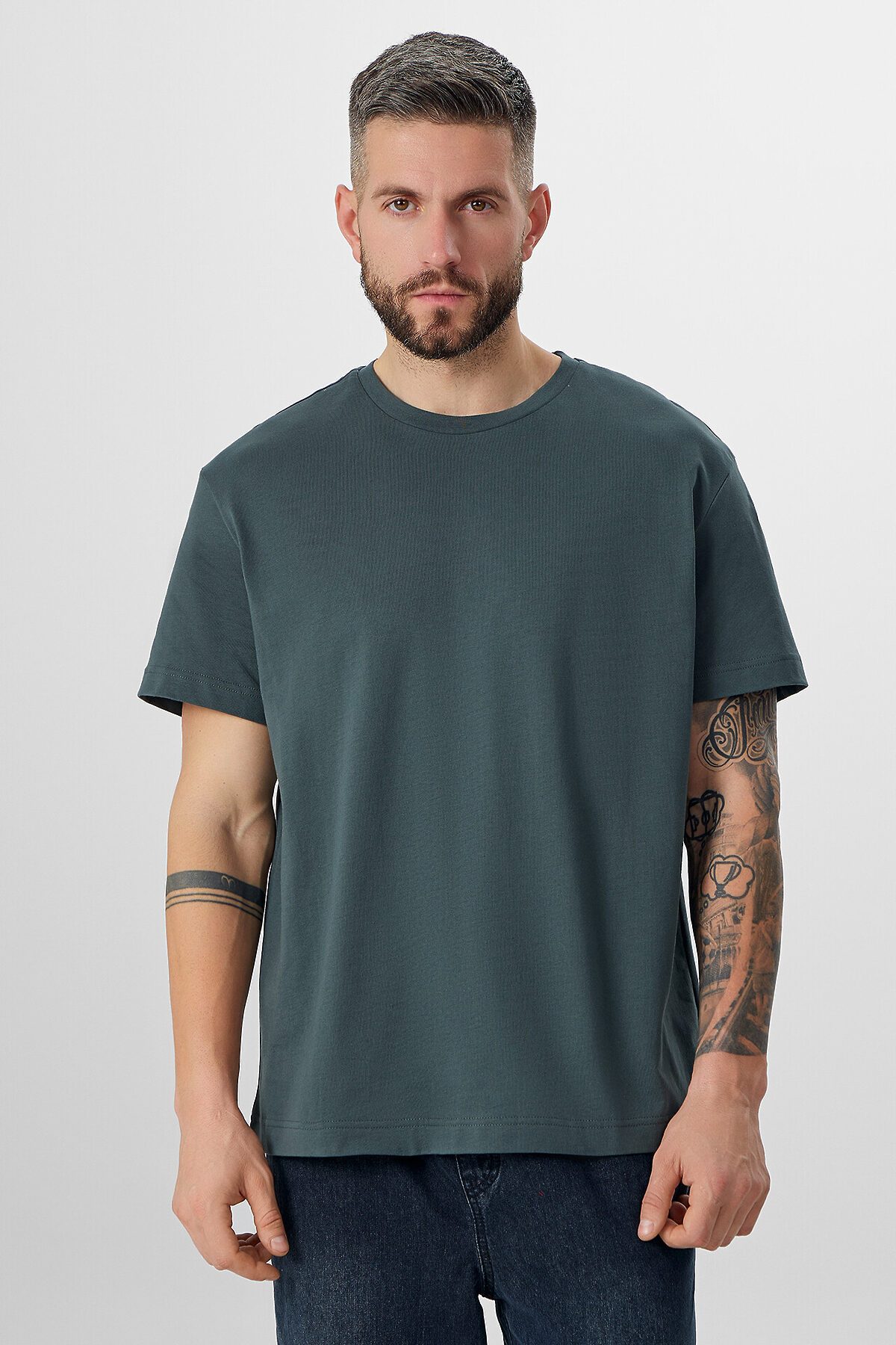 Футболка изготовлена из трикотажного полотна кулирки 100% хб, 160 г/м2. Футболка прямого силуэта. Горловина круглой формы обработана обтачкой из рибаны. Шов втачивания обтачки по спинке закрыт бейкой из основного полотна. Рукава втачные, короткие. Нижние срезы футболки и рукавов обработаны швом вподгибку.