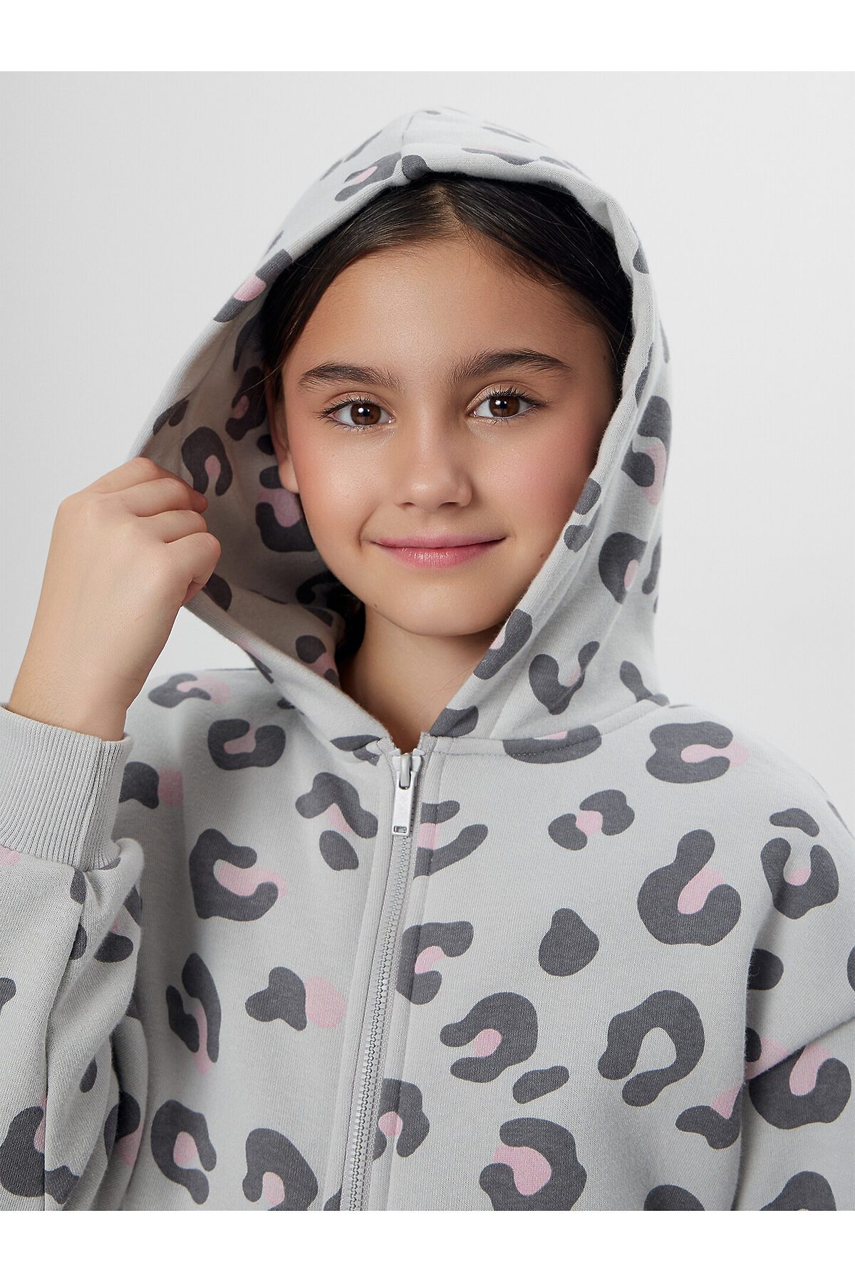 Жакет свободного силуэта с капюшоном. Капюшон на подкладке из основного полотна. Шов втачивания капюшона закрыт х/б тесьмой. Рукава втачные, линия плеча спущена. Притачные манжеты по низу рукавов и притачной пояс из рибаны. По переду застежка молния, карман кенгуру.