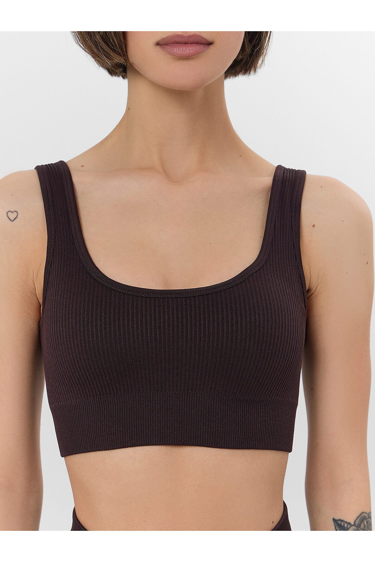 Коричневый женский спортивный топ с рельефным рубчиком создает элегантный силуэт для активного образа жизни. Облегающий крой и широкие бретели обеспечивают надежную поддержку во время тренировок. Круглая горловина подчеркивает лаконичный дизайн модели. Изделие выполнено из трикотажного материала интерлок — мягкого, прочного и приятного к коже. Эта ткань отличается хорошей эластичностью и воздухопроницаемостью, что делает ее отличным выбором для тренировок и активного отдыха Дышащая ткань обеспечивает комфортный микроклимат, эффективно отводя влагу в течении занятий фитнесом, йогой или аэробикой.