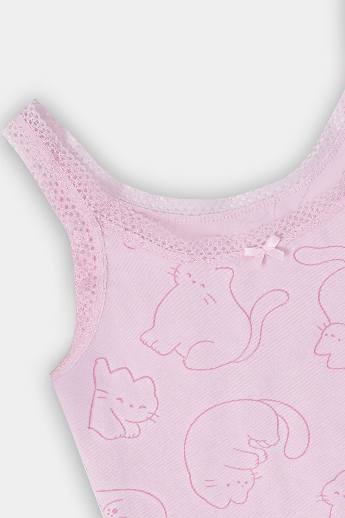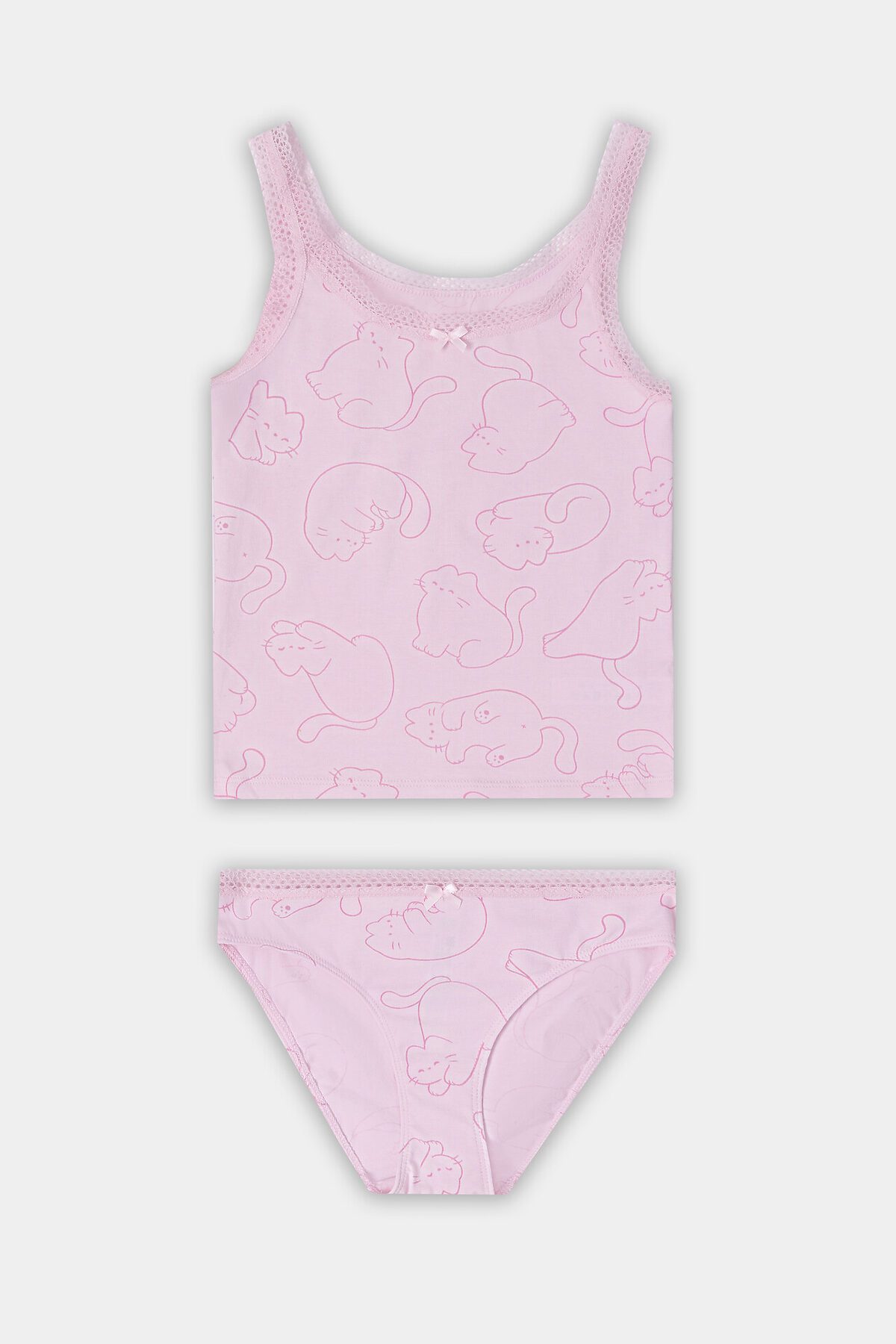 Бельевой комплект для девочек, состоящий из майки и трусиков. Майка свободного силуэта, на бретелях, с небольшим V-образным углублением на горловине и декором в виде бантика. Трусики имеют слегка заниженную линию талии, по срезам идет эластичная тесьма. Уютный хлопковый комплект!